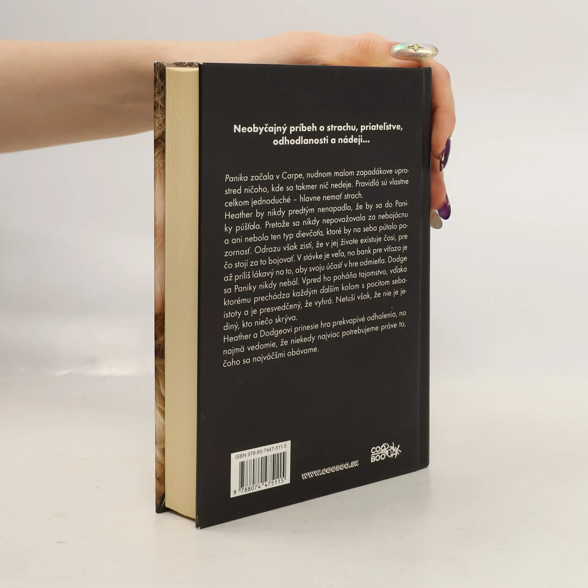 Panika začala v Carpe, nudnom zapadákove uprostred ničoho. Pravidlá sú celkom jednoduché – hlavne nemať strach. Heather by nikdy predtým nenapadlo, že by sa do Paniky púšťala. Pretože sa nikdy nepovažovala za nebojácnu a ani nebola ten typ dievčaťa, ktoré by na seba pútalo pozornosť. Dodge sa Paniky nikdy nebál. Vpred ho poháňa tajomstvo, vďaka ktorému prechádza každým ďalším kolom s pocitom sebaistoty a je presvedčený, že vyhrá. Heather a Dodgeovi prinesie hra prekvapivé odhalenia...