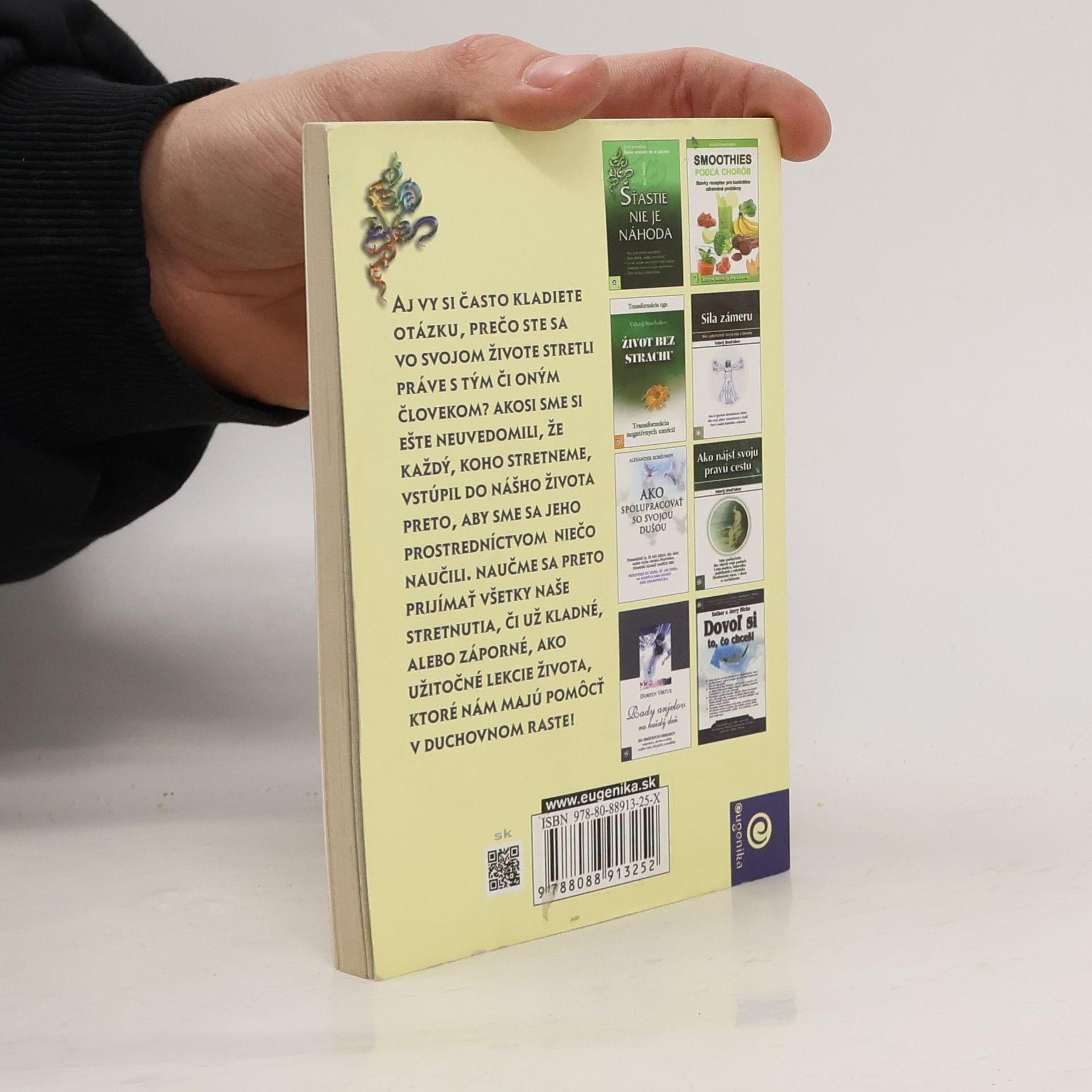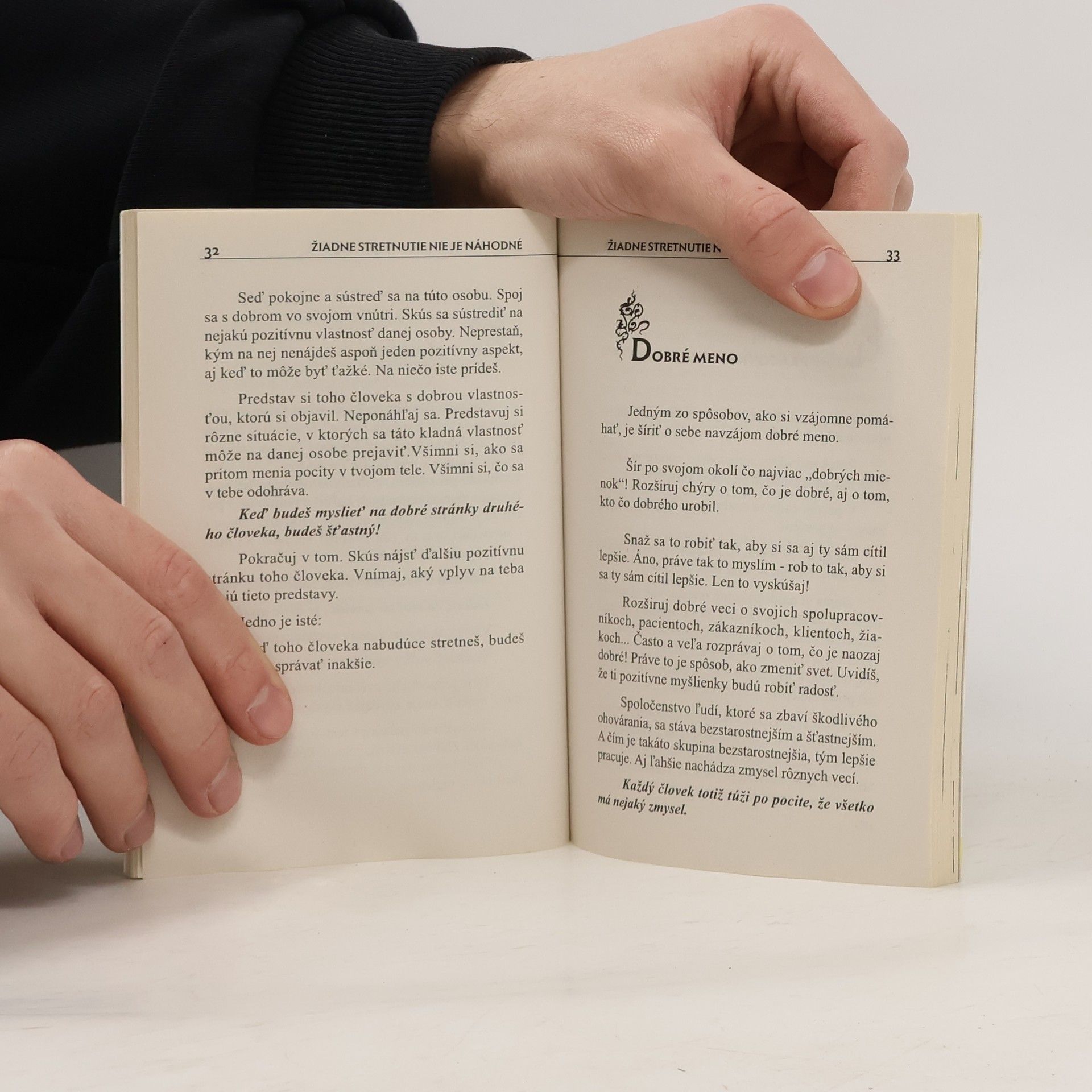 Človek si často vytvára mylné predstavy o sebe aj druhých, čo negatívne vplýva na našu komunikáciu s okolím. Autor je presvedčený, že pri každom stretnutí s nejakým človekom sa môžeme niečo naučiť. Predkladá sériu jednoduchých nápadov, pohľadov, rád a cvičení, ktoré nám pomôžu pravdivo vidieť sami seba aj druhých.