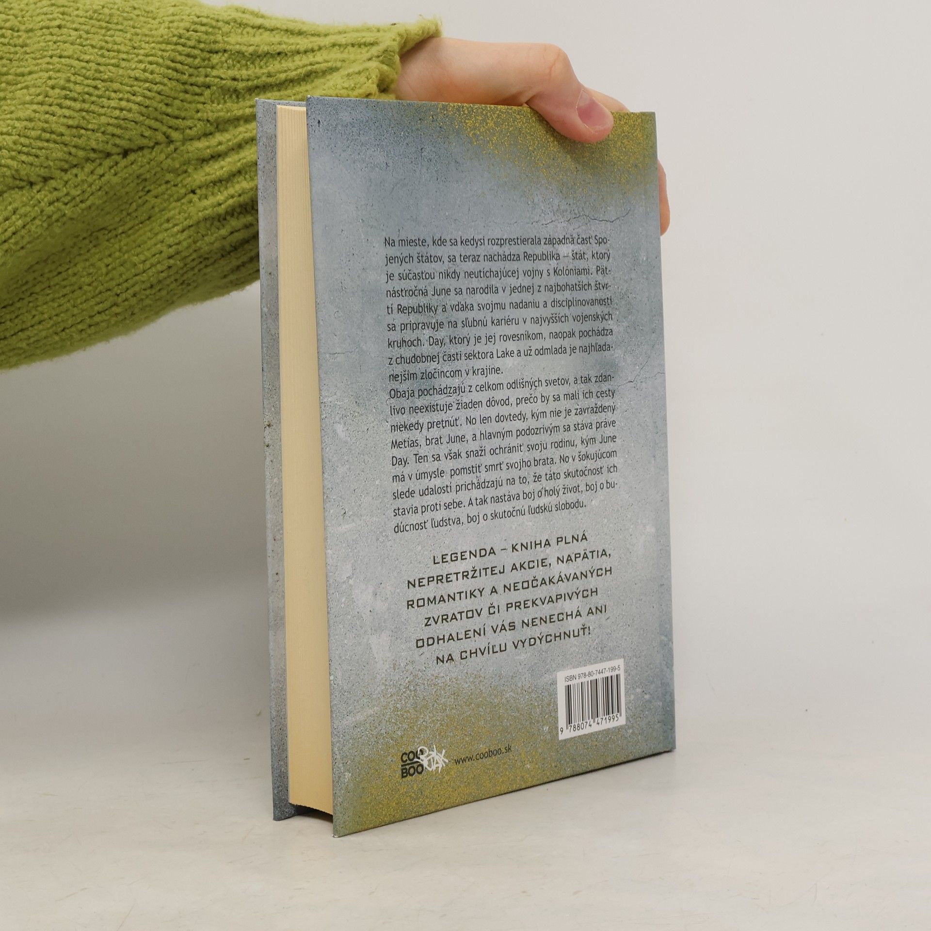 Na mieste, kde sa kedysi rozprestierala západná časť Spojených štátov, sa teraz nachádza Republika – štát, ktorý je súčasťou nikdy neutíchajúcej vojny s Kolóniami. Pätnásťročná June sa narodila v jednej z najbohatších štvrtí Republiky a vďaka svojmu nadaniu a disciplinovanosti sa pripravuje na sľubnú kariéru v najvyšších vojenských kruhoch. Day, ktorý je jej rovesníkom, naopak pochádza z chudobnej časti sektora Lake a už odmlada je najhľadanejším zločincom v krajine. Obaja pochádzajú z celkom odlišných svetov, a tak zdanlivo neexistuje žiaden dôvod, prečo by sa mali ich cesty niekedy pretnúť. No len dovtedy, kým nie je zavraždený Metias, brat June, a hlavným podozrivým sa stáva práve Day. Ten sa však snaží ochrániť svoju rodinu a June pomstiť smrť svojho brata. No v šokujúcom slede udalostí prichádzajú na to, že táto skutočnosť ich stavia proti sebe. A tak nastáva boj o holý život, boj o budúcnosť ľudstva, boj o skutočnú ľudskú slobodu. Legenda – kniha plná nepretržitej akcie, napätia, romantiky a neočakávaných zvratov či prekvapivých odhalení vás nenechá ani na chvíľu vydýchnuť!