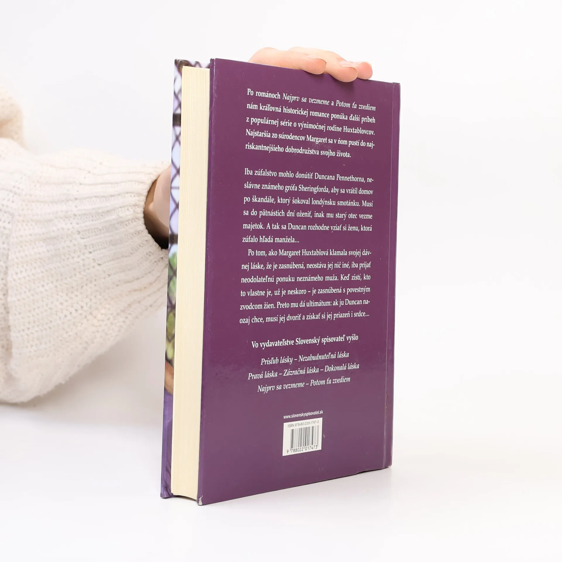 Po románoch Najprv sa vezmeme a Potom ťa zvediem nám kráľovná historickej romance ponúka ďalší príbeh z populárnej série o výnimočnej rodine ohnivých a zmyselných Huxtablovcov. Najstaršia zo súrodencov Margaret sa v ňom pustí do najriskantnejšieho dobrodružstva svojho života...