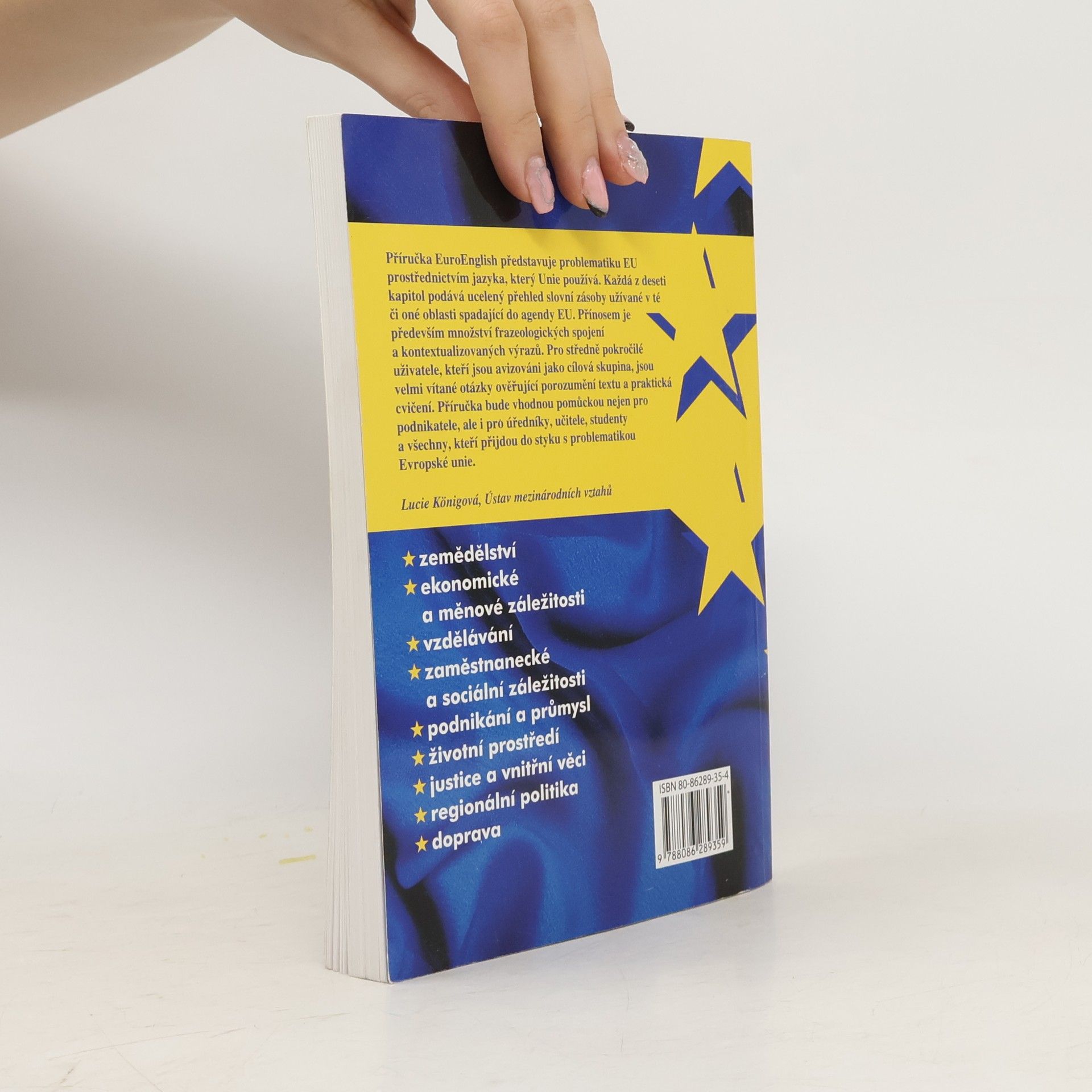 Příručka EuroEnglish představuje problematiku EU prostřednictvím jazyka, který Unie používá. Každá z deseti kapitol podává ucelený přehled slovní zásoby užívané v té či oné oblasti spadající do agendy EU (ekonomické a měnové záležitosti, podnikání a průmysl, zemědělství, vzdělávání, zaměstnanecké a sociální záležitosti, životní prostředí, justice a vnitřní věci, regionální politika, doprava). Přínosem je především množství frazeologických spojení a kontextualizovaných výrazů. Velmi vítané budou otázky ověřující porozumění textu a praktická cvičení. Příručka je vhodnou pomůckou nejen pro podnikatele, ale i pro úředníky, učitele, studenty a všechny, kteří přijdou do styku s problematikou Evropské unie. Zdroj: kosmas.cz