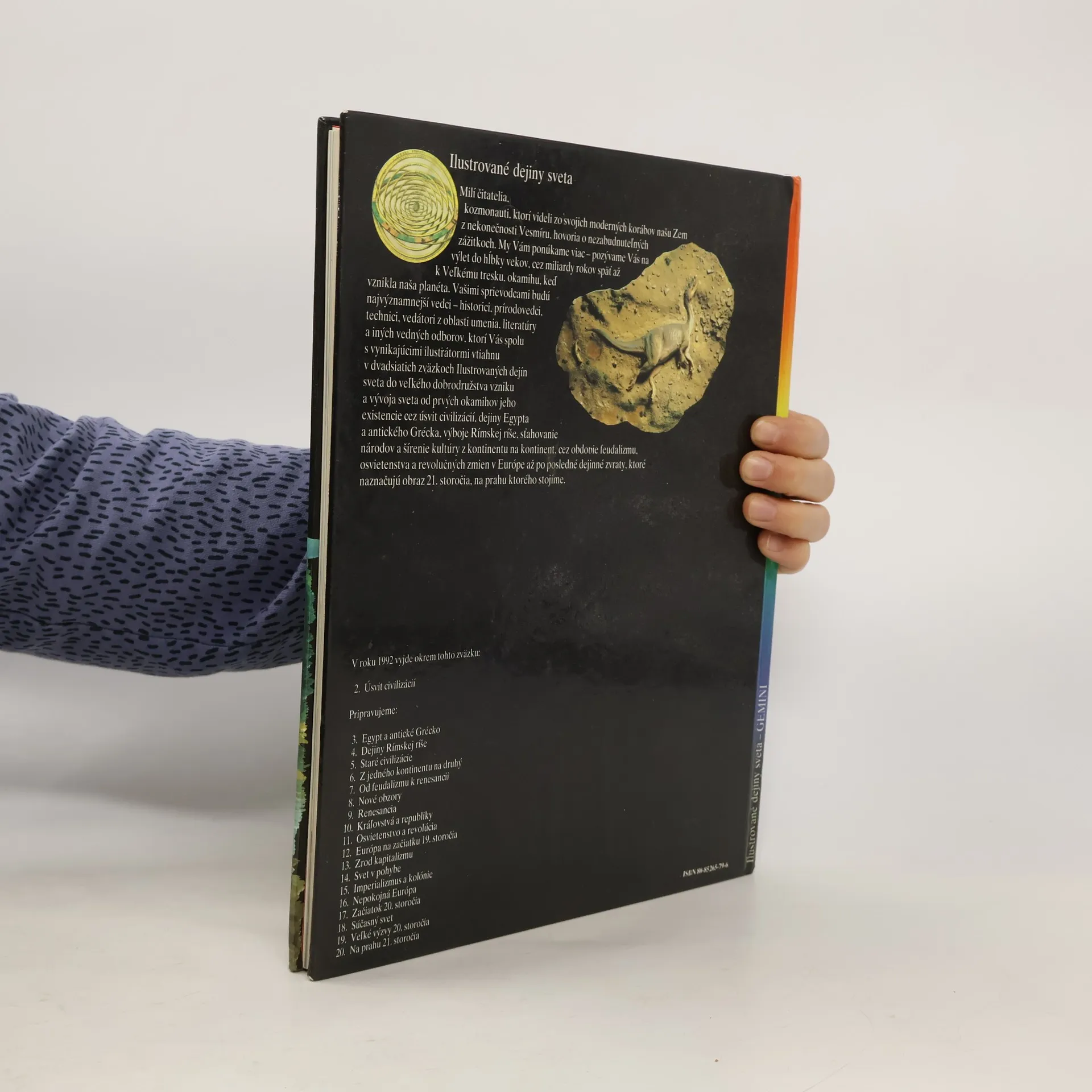 Obsah: Veľký tresk...Pred dvadsiatimi miliardami rokov-Na konci noci, Prvé okamihy, Mýty a legendy, Priestor a čas, Hviezdny les, Planéty, Obyčajná hviezda: Slnko, Mesiac, družica Zeme. Belasá Zem...Ako pomaranč-Krehký plynný obal, Premenlivá teplota, Kolobeh vody, Cesta do stredu Zeme, Zemská kôra, Zem filozofov, Pohybujúce sa kontinenty, Reakcie zemskej kôry, Premenlivá tvár Zeme, Roztavené horniny, Geologické mapy, Minerály, horniny a skameneliny, Veda o Zemi. Život sa začal...-Bunka, prvý živý organizmus, Mnohobunkové organizmy, More-prameň života, Živočíchy v pancieri a schránke, Prvé stavovce, Suchozemské rastliny, Primitívne štvornožce:obojživelníky, Bohatý život v karbóne, Stavovce na súši, Obdobie plazov, Pomenovanie a triedenie druhov, Hlavonožce /Cephalopoda/. Zvrchovaná ríša, záhadný zánik-"Hrozné plazy", Rozmach plazov, Rodina dinosaurov, Prvé dinosaury, Veľjaštery v jure, Po stopách dinosaurov, Súboj posledných pánov, Zánik dinosaurov, Paleontologické objavy. Od malých hmyzožravcov k človeku-My, cicavce, Vačkovce /Marsupialia/, Útok placentovcov na našu planétu, Nová vlna cicavcov, Oligocén, Miocén-obdobie prérií, V pleistocéne zima a ľadovce, Smrť v asfalte, Od lemurov ku gorile: primáty, Cicavce. Pôvod človeka-Afrika, kolíska ľudstva, Australopitekovia, K homo habilis, Mimo Afriky, Prehistorickí lovci, Kult mŕtvych, Neanertálci, Výskum ľudských skamenelín.