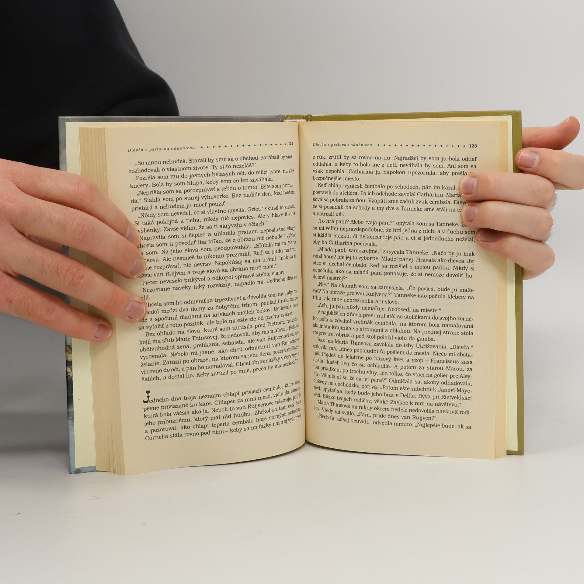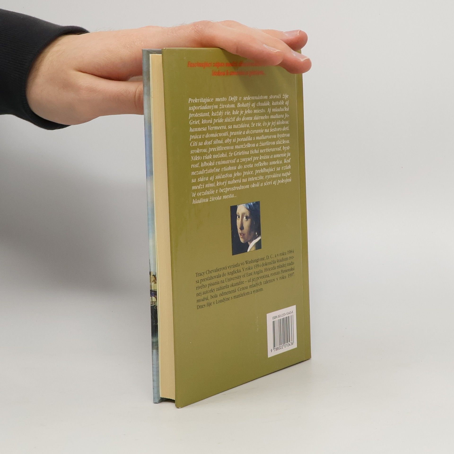 Román o zápase medzi nevinnosťou a láskou k umeniu i mužovi, napísaný podľa Vermeerovho známeho obrazu. Prekvitajúce mesto Delft v sedemnástom storočí žije usporiadaným životom. Bohatý aj chudák, katolík aj protestant, každý vie, kde je jeho miesto. Aj mladučká Griet, ktorá príde slúžiť do domu slávneho maliare Johannesa Vermeera, sa nazdáva, že vie, čo je jej úlohou: práca v domácnosti, pranie a dozeranie na šestoro detí. Cíti sa dosť silná, aby si poradila s maliarovou bystrou svokrou, precitlivelou manželkou a žiarlivou slúžkou. Nikto však nečaká, že Grietina tichá nevtieravosť, bystrosť, hlboká vnímavosť a zmysel pre krásu a umenie ju nezadržateľne vtiahnu do sveta veľkého umelca. Keď sa stáva aj súčasťou jeho práce, prehlbujúci sa vzťah medzi nimi, ktorý naberá na intenzite, vyvoláva napäté ovzdušie v bezprostrednom okolí a sčerí aj pokojnú hladinu života mesta...