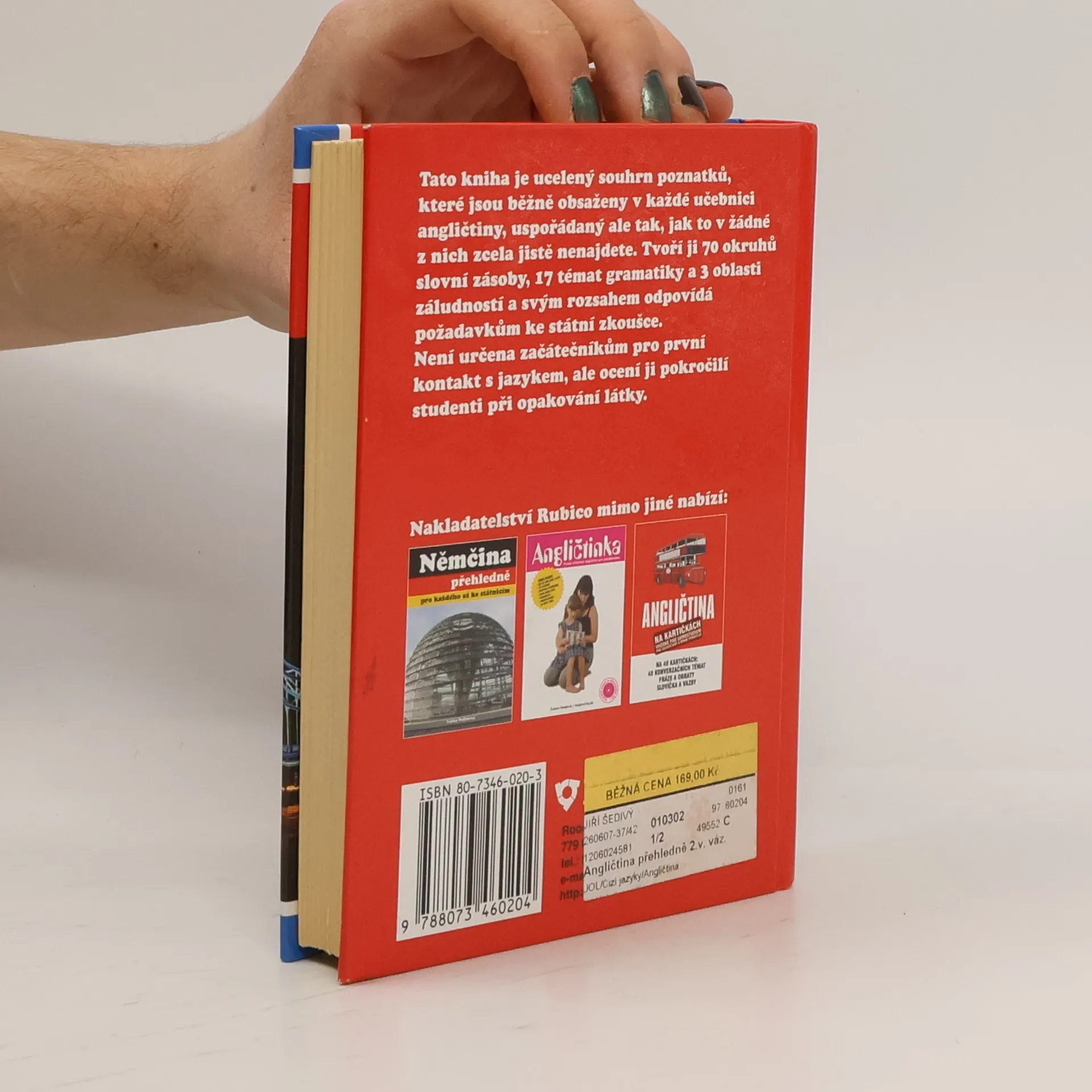 3. vydání Tato kniha je ucelený souhrn poznatků běžně obsažených v každé učebnici angličtiny. Liší se ale jejich uspořádáním, které v žádné z nich zcela jistě nenajdete. Není určena začátečníkům pro první kontakt s jazykem, ale ocení ji pokročilí studenti při opakování látky. Rozsah učebnice odpovídá požadavkům ke státní zkoušce z angličtiny. Celá látka je rozčleněna do 70 okruhů slovní zásoby, 17 oblastí gramatiky a 3 souborů záludností.