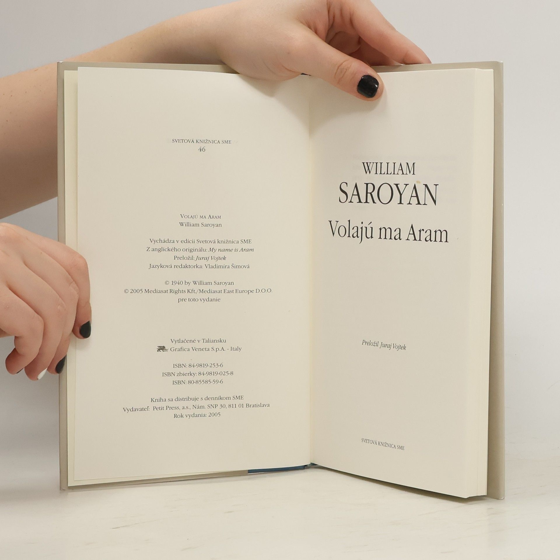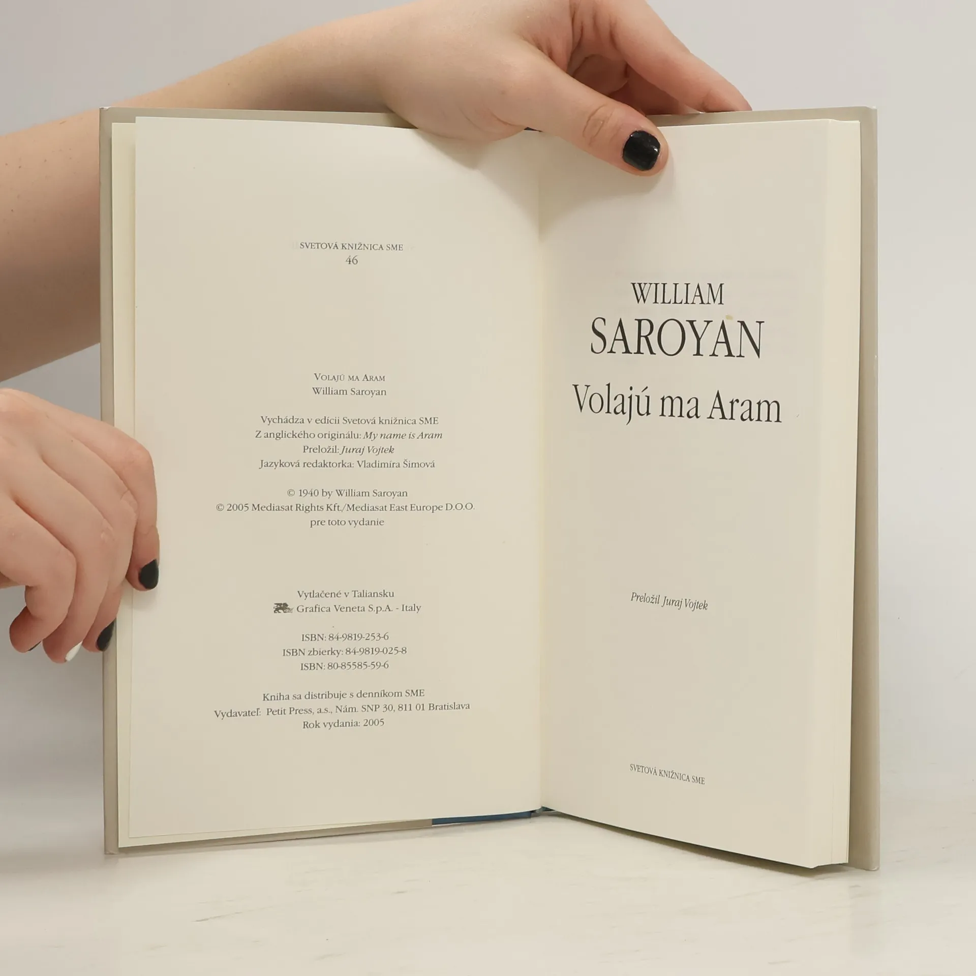 Ešte na konci šesťdesiatych rokov minulého storočia vyšiel v Mladých letách výber z diela Williama Saroyana nazvaný Zbohom, láska moja. Vyšiel v preklade Juraja Vojteka, ktorý Saroyanovej tvorbe venoval podstatnú časť svojej prekladateľskej aktivity. Prvých sedem poviedok sa do tohto výberu dostalo z druhej Saroyanovej zbierky poviedok -Volajú ma Aram (My Name Is Aram, 1940). Medzičasom, najmä po roku 1989, vyšlo sedem ďalších výberov z množstva autorových krátkych próz (Saroyan napísal vyše dvetisíc poviedok). Ako celok však poviedková kniha Volajú ma Aram vychádza v slovenčine prvý raz. Až teraz má slovenský čitateľ možnosť vychutnať dielo ako komponovaný celok, v takej podobe, v akej ho predložil vydavateľovi autor, a to aj s autorskou úvodnou Poznámkou. Poviedky ako Granátovníky, Traja plavci a obchodník, ktorý mal diplom z Yale, Roztomilý staromódny románik s galantnými básničkami a vôbec so všetkým, Leto na prekrásnom bielom tátošovi patria k najznámejším a najprekladanejším autorovým prózam. Hlavnými hrdinami sú v nich deti arménskych prisťahovalcov v Kalifornii. Práve týmto dielkom s osobitou, slnkom prežiarenou atmosférou, vzdal spisovateľ hold životnej filozofii a duchu svojich rodákov, ktorí aj v nových podmienkach vedeli zostať sami sebou. William Saroyan (1908 - 1981), americký spisovateľ arménskeho pôvodu, sa narodil v kalifornskom Fresne. Ako trojročnému mu zomrel otec, a hoci bol najmladší, musel pomáhať matke starať sa o päťčlennú rodinu. Vyrastal v zmiešanom mnohonárodnostnom prostredí a veľmi skoro sa začal venovať literatúre. Nezabudnuteľná zostáva najmä jeho prvá kniha Odvážny mladý muž na lietajúcej hrazde (1933).