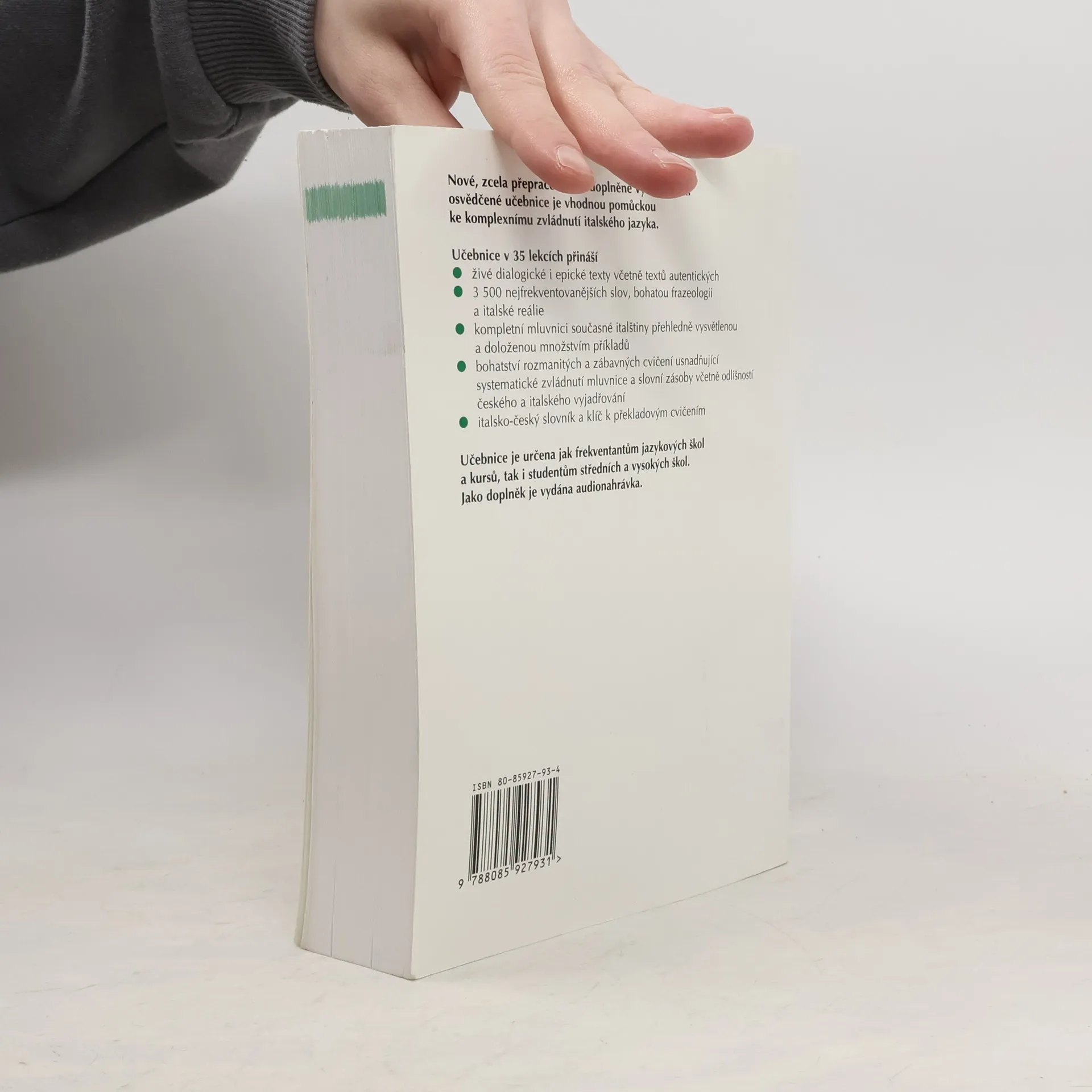 Nejucelenější učebnice italského jazyka na českém knižním trhu ve zcela přepracované a doplněné podobě obsahuje kompletní mluvnici současné italštiny, přibližně 3500 nejfrekventovanějších slov a bohatou frazeologii. Autorky, které mají bohaté pedagogické zkušenosti z výuky italštiny na středních, vysokých i jazykových školách, vysvětlují jednotlivé mluvnické jevy přehledně a srozumitelně, dokládají je množstvím příkladů a nabízejí jejich procvičení v celé řadě rozmanitých a zábavných cvičení. Další cvičení usnadňují zvládnutí slovní zásoby a nácvik komunikativních schopností. Uživatele bezesporu zaujmou i texty zařazené do učebnice zprostředkovávající italské reálie různými formami a četné autentické materiály. Učebnice je určena studentům a pedagogům středních, vysokých a jazykových škol či kursů. Klíč a audionahrávka k učebnici však umožňuje studium rovněž samoukům.