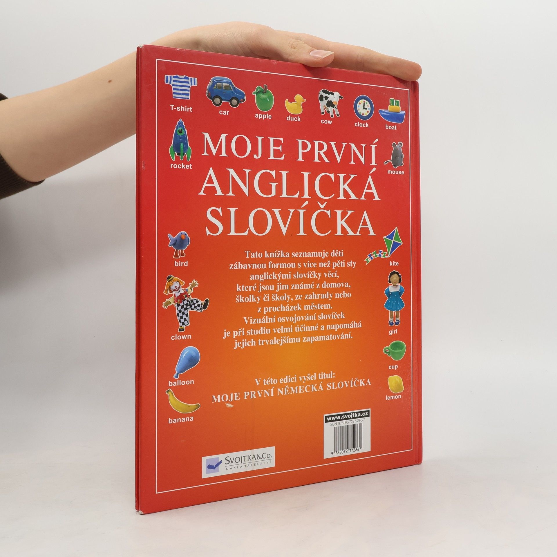 Tato knížka - Moje první anglická slovíčka - plná půvabných obrázků seznamuje děti zábavnou formou s více než pěti sty anglickými slovíčky – názvy věcí, které znají z domova, školky či školy, ze zahrady nebo z procházek městem. Vizuální osvojování slovíček je při učení velmi účinné a napomáhá k jejich trvalejšímu zapamatování. Barevné obrázky jsou velmi názorné a jsou přizpůsobeny dětskému vnímání. V závěru knihy najdete abecedně řazený slovníček, který obsahuje všechna anglická slovíčka, se kterými se čtenář na obrázcích v této knize setká. Vedle každého slovíčka je uvedena anglická výslovnost s českým překladem. Kniha je koncipována tak, aby ji mohli využít jak ti nejmenší, tak předškoláci nebo malí školáci. Tato milá knížka poskytne dětem mnoho chvil příjemné zábavy a nenásilného učení.