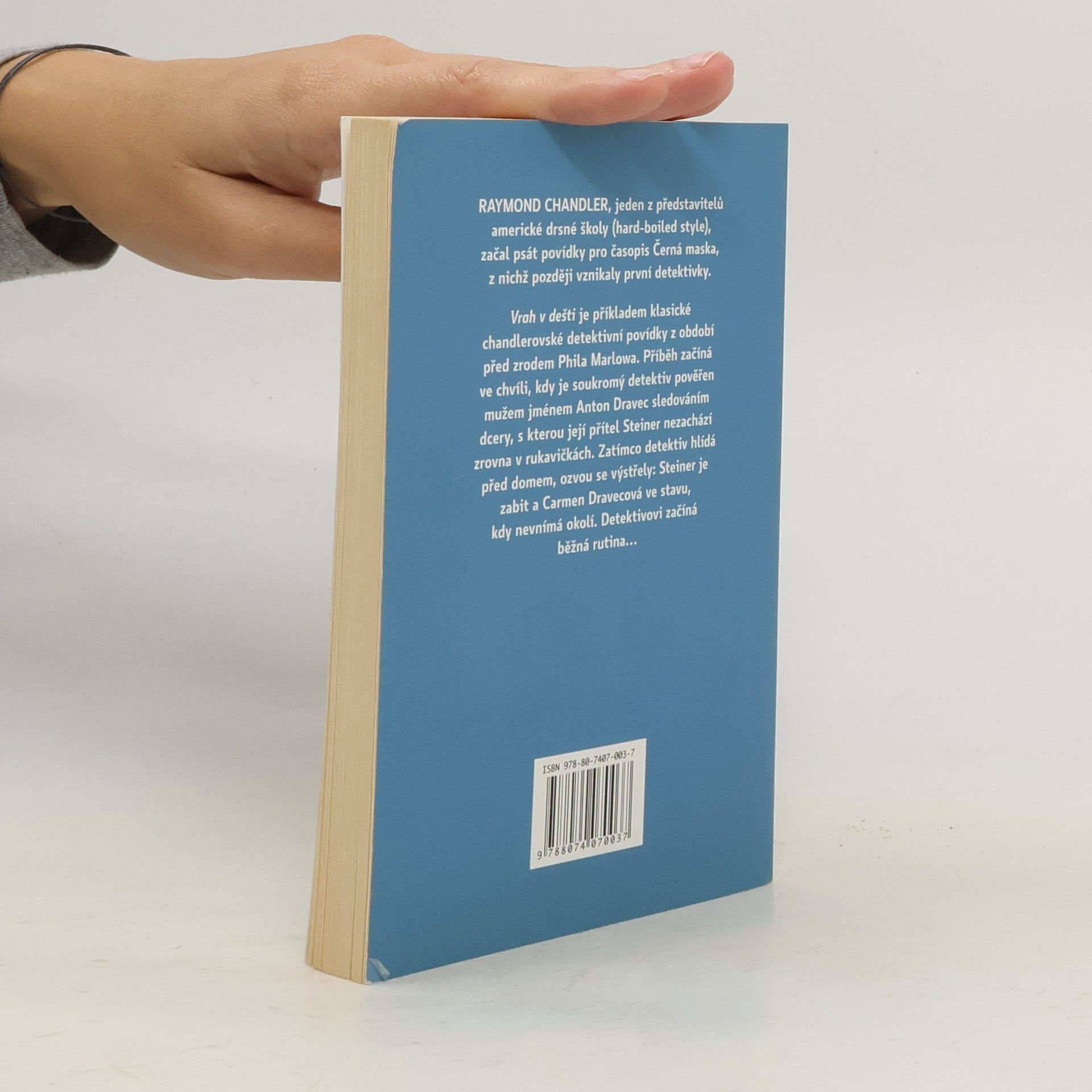 Raymond Chandler, jeden z představitelů americké drsné školy (hard-boiled style), začal psát povídky pro časopis Černá maska, z nichž později vznikly první detektivky s ještě bezejmenným detektivem. Vrah v dešti je klasická chandlerovská detektivní povídka z období před zrodem Phila Marlowa, v níž je soukromý detektiv je pověřen mužem jménem Anton Dravec sledováním jeho dcery, s kterou její přítel Steiner nezachází zrovna v rukavičkách. Zatímco detektiv hlídá před domem, ozvou se výstřely: Steiner je zabit a Carmen Dravecová ve stavu, kdy nevnímá okolí. Detektivovi začíná běžná rutina. Dvojjazyčné vydání: cz-eng