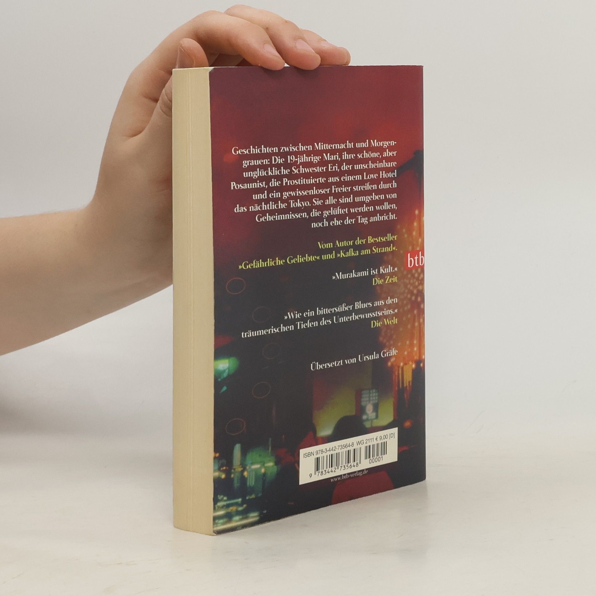 Zwischen Mitternacht und Morgengrauen – eine magische Reise durch das nächtliche Tokyo Geschichten zwischen Mitternacht und Morgengrauen: Murakami begleitet seine Helden eine Nacht lang und zeichnet ein eindrucksvolles, geheimnisvoll schillerndes Großstadtporträt: Die 19-jährige Mari, ihre schöne, aber unglückliche Schwester Eri, der unscheinbare Posaunist, die Prostituierte aus einem Love Hotel und ein gewissenloser Freier streifen durch das nächtliche Tokyo. Sie alle sind umgeben von Geheimnissen, die gelüftet werden wollen, noch ehe der Tag anbricht.