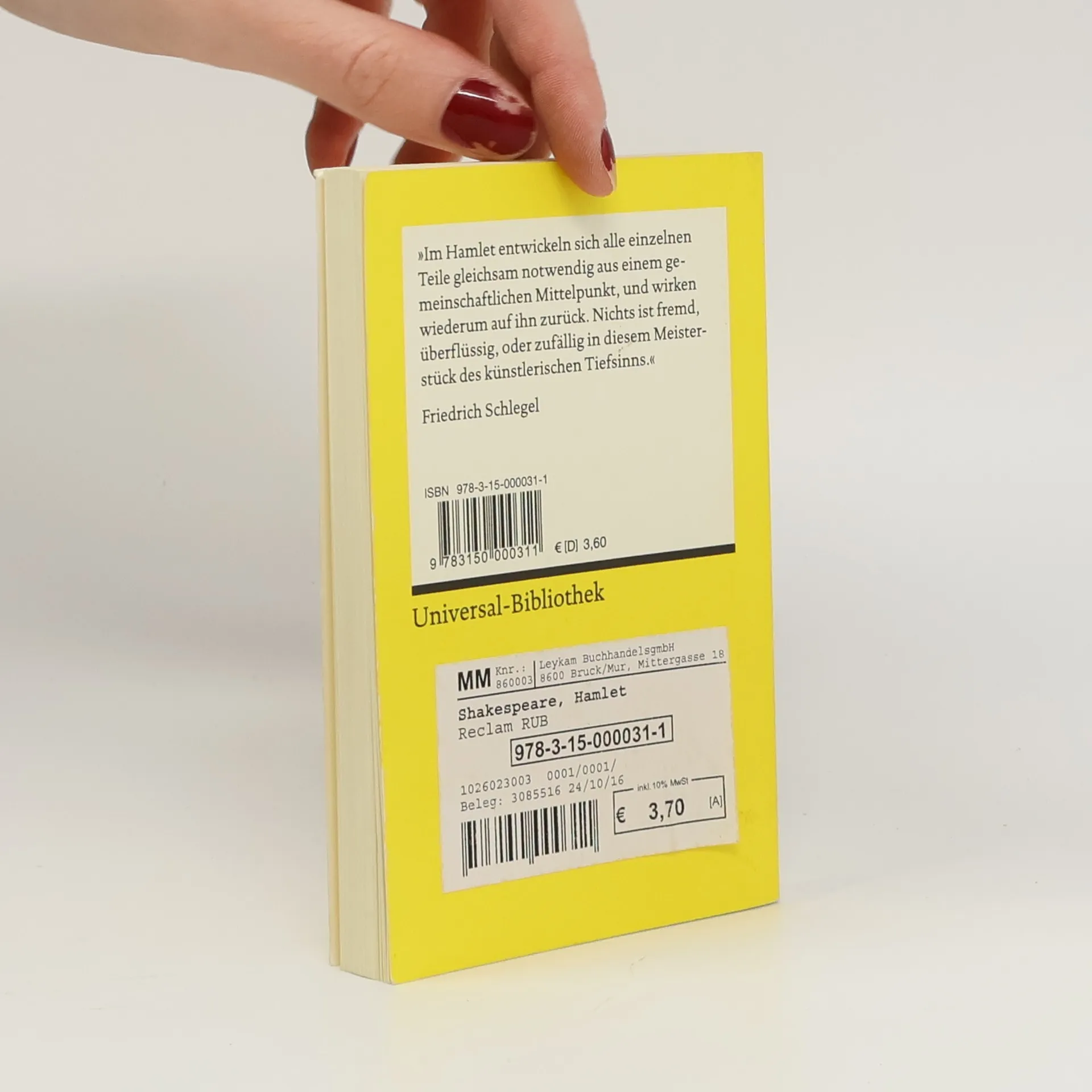 »Hamlet« ist das meistgespielte Stück Shakespeares und die bekannteste Figur des Autors. Vor rund 250 Jahren führte die Shakespeare-Begeisterung in Deutschland zu einem sogenannten ›Hamlet-Erlebnis‹, bei dem sich viele mit dem melancholischen Dänenprinzen identifizierten. Die menschliche Psyche und ihre Widersprüche sowie die Reflexion über Ich, Fiktion und Welt stehen im Mittelpunkt. Der berühmteste Monolog der Theatergeschichte, »To be or not to be, that is the question«, hat hier seinen Platz. Die Schlegel-Tieck-Übersetzung, an der August Wilhelm Schlegel, Ludwig Tieck, Dorothea Tieck und Wolf Heinrich Graf Baudissin mitwirkten, wurde im 19. Jahrhundert zu einem eigenständigen deutschen Klassiker. Die Übersetzer nutzten die Literatursprache der deutschen Klassik im Gefolge Goethes und Schillers und schufen ein poetisches Werk von großer sprachlicher Geschlossenheit und Wirkung – der Text liegt in neuer Rechtschreibung vor. Im Stück heiratet Gertrude, die Witwe des dänischen Königs, dessen Bruder Claudius, der nun König ist. Ihr Sohn Hamlet, benannt nach seinem verstorbenen Vater, sieht den Geist seines Vaters, der ihm offenbart, von Claudius ermordet worden zu sein. Hamlet sinnt auf Rache, was Gertrude, Claudius und auch die geliebte Ophelia, Tochter des Oberkämmerers Polonius, betrifft. Letztlich wird Hamlet von Ophelias Bruder Laertes getötet. Friedrich Schlegel beschreibt das Werk als ein Meisterstück, in dem alle Teil