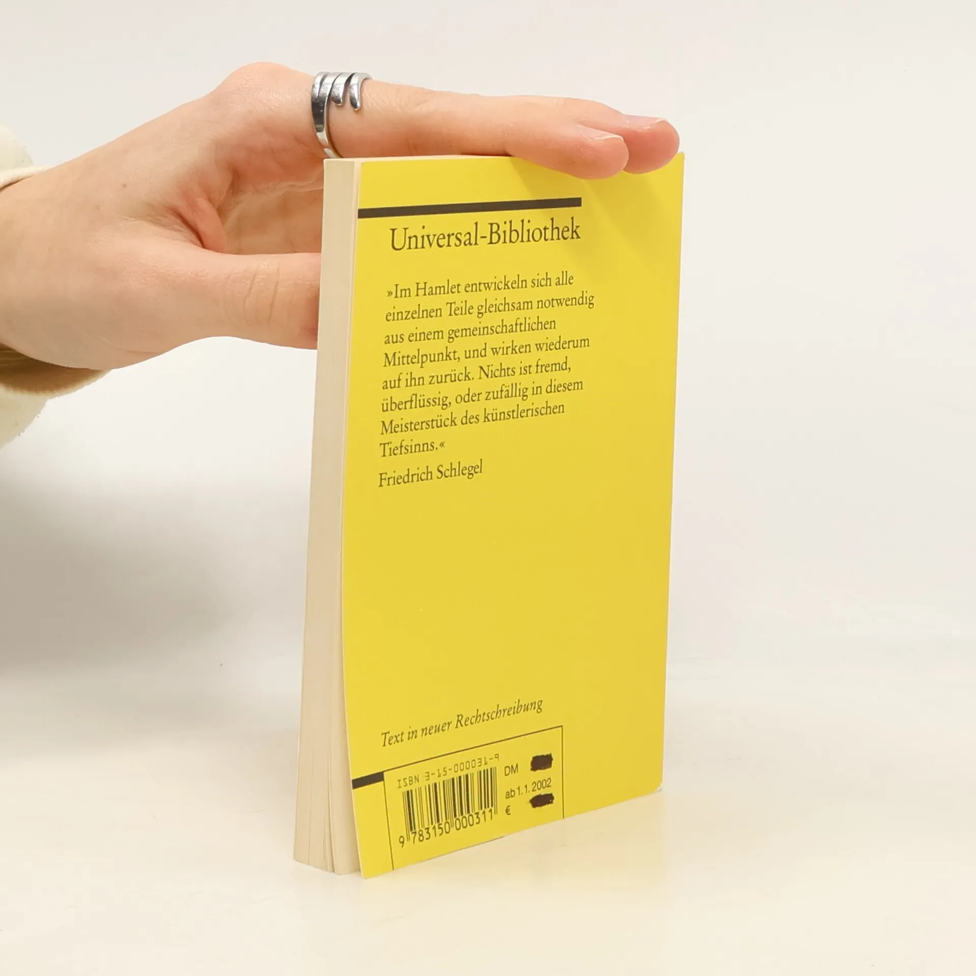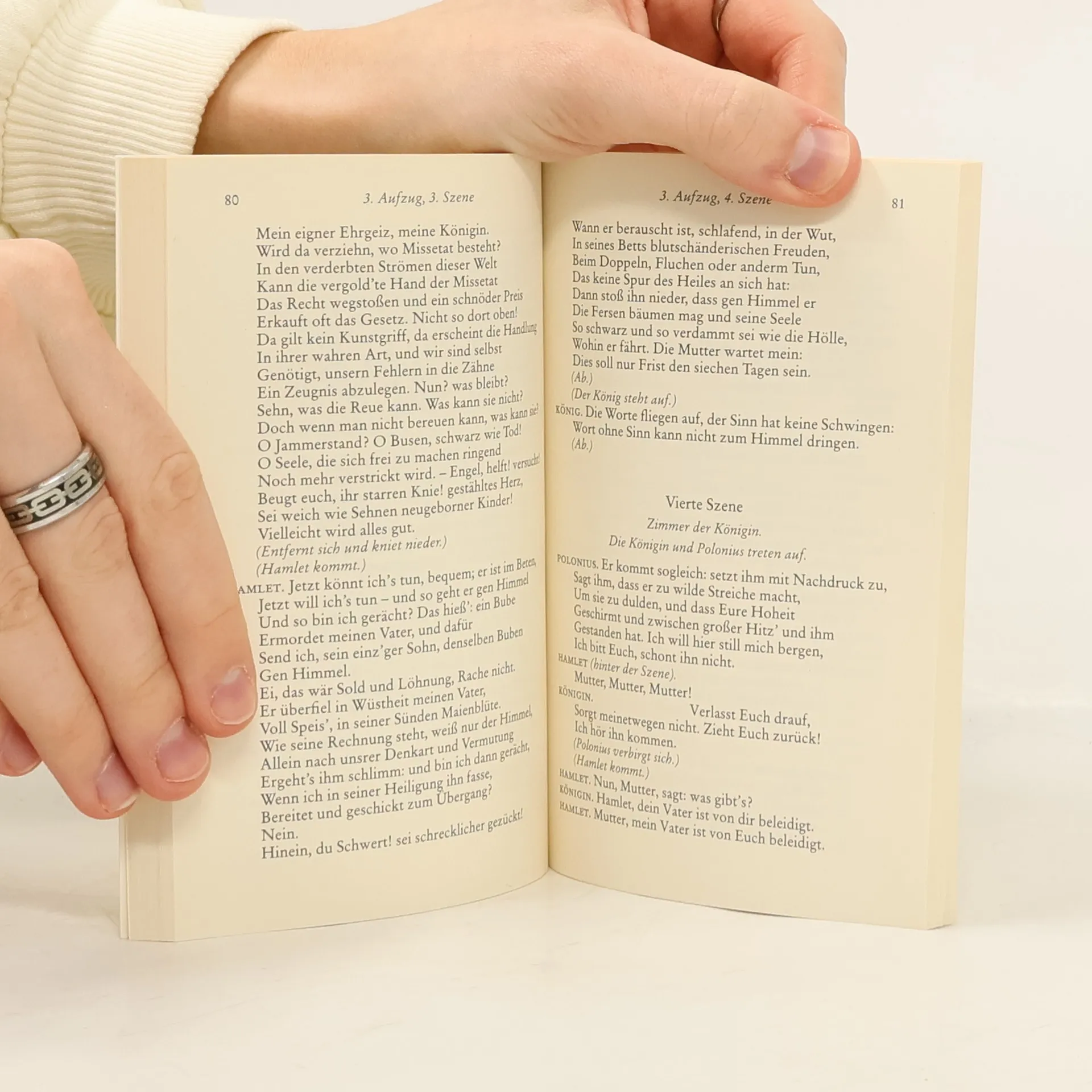 »Hamlet« ist das meistgespielte Stück Shakespeares und die bekannteste Figur des Autors. Vor rund 250 Jahren führte die Shakespeare-Begeisterung in Deutschland zu einem sogenannten ›Hamlet-Erlebnis‹, bei dem sich viele mit dem melancholischen Dänenprinzen identifizierten. Die menschliche Psyche und ihre Widersprüche sowie die Reflexion über Ich, Fiktion und Welt stehen im Mittelpunkt. Der berühmteste Monolog der Theatergeschichte, »To be or not to be, that is the question«, hat hier seinen Platz. Die Schlegel-Tieck-Übersetzung, an der August Wilhelm Schlegel, Ludwig Tieck, Dorothea Tieck und Wolf Heinrich Graf Baudissin mitwirkten, wurde im 19. Jahrhundert zu einem eigenständigen deutschen Klassiker. Die Übersetzer nutzten die Literatursprache der deutschen Klassik im Gefolge Goethes und Schillers und schufen ein poetisches Werk von großer sprachlicher Geschlossenheit und Wirkung – der Text liegt in neuer Rechtschreibung vor. Im Stück heiratet Gertrude, die Witwe des dänischen Königs, dessen Bruder Claudius, der nun König ist. Ihr Sohn Hamlet, benannt nach seinem verstorbenen Vater, sieht den Geist seines Vaters, der ihm offenbart, von Claudius ermordet worden zu sein. Hamlet sinnt auf Rache, was Gertrude, Claudius und auch die geliebte Ophelia, Tochter des Oberkämmerers Polonius, betrifft. Letztlich wird Hamlet von Ophelias Bruder Laertes getötet. Friedrich Schlegel beschreibt das Werk als ein Meisterstück, in dem alle Teil