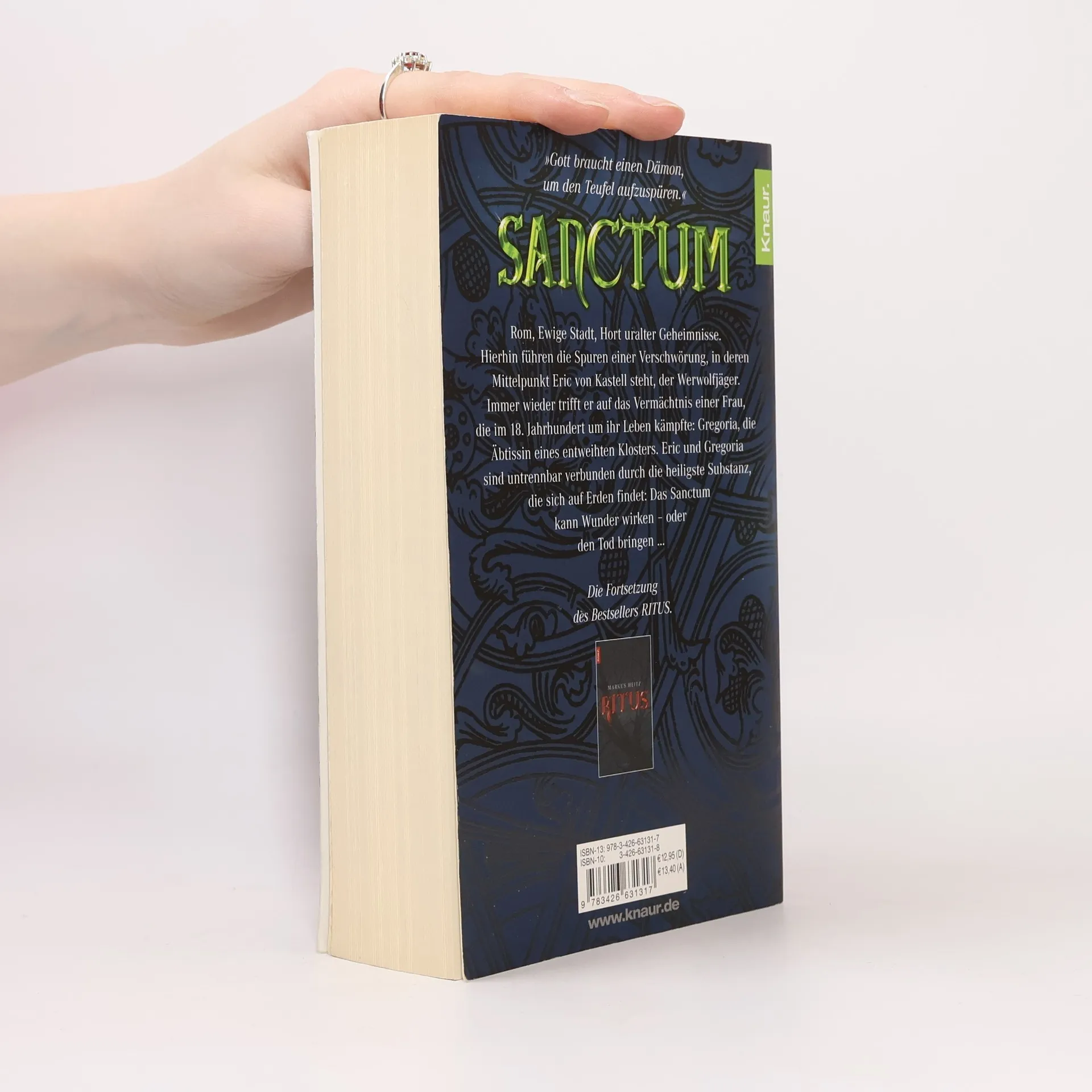 „Gott braucht einen Dämon, um den Teufel aufzuspüren.“ Rom, Ewige Stadt, Hort uralter Geheimnisse. Hierhin führen im Jahre 2004 die Spuren einer Verschwörung, in deren Mittelpunkt Eric von Kastell steht, der Werwolfjäger. Immer wieder trifft er auf das Vermächtnis einer Frau, die im 18. Jahrhundert um ihr Leben kämpfte: Gregoria, die Äbtissin eines entweihten Klosters. Eric und Gregoria sind untrennbar verbunden durch die heiligste Substanz, die sich auf Erden findet: Das Sanctum kann Wunder wirken – oder den Tod bringen … Was in RITUS begann, wird in SANCTUM enden - die Fortsetzung des Bestsellers!