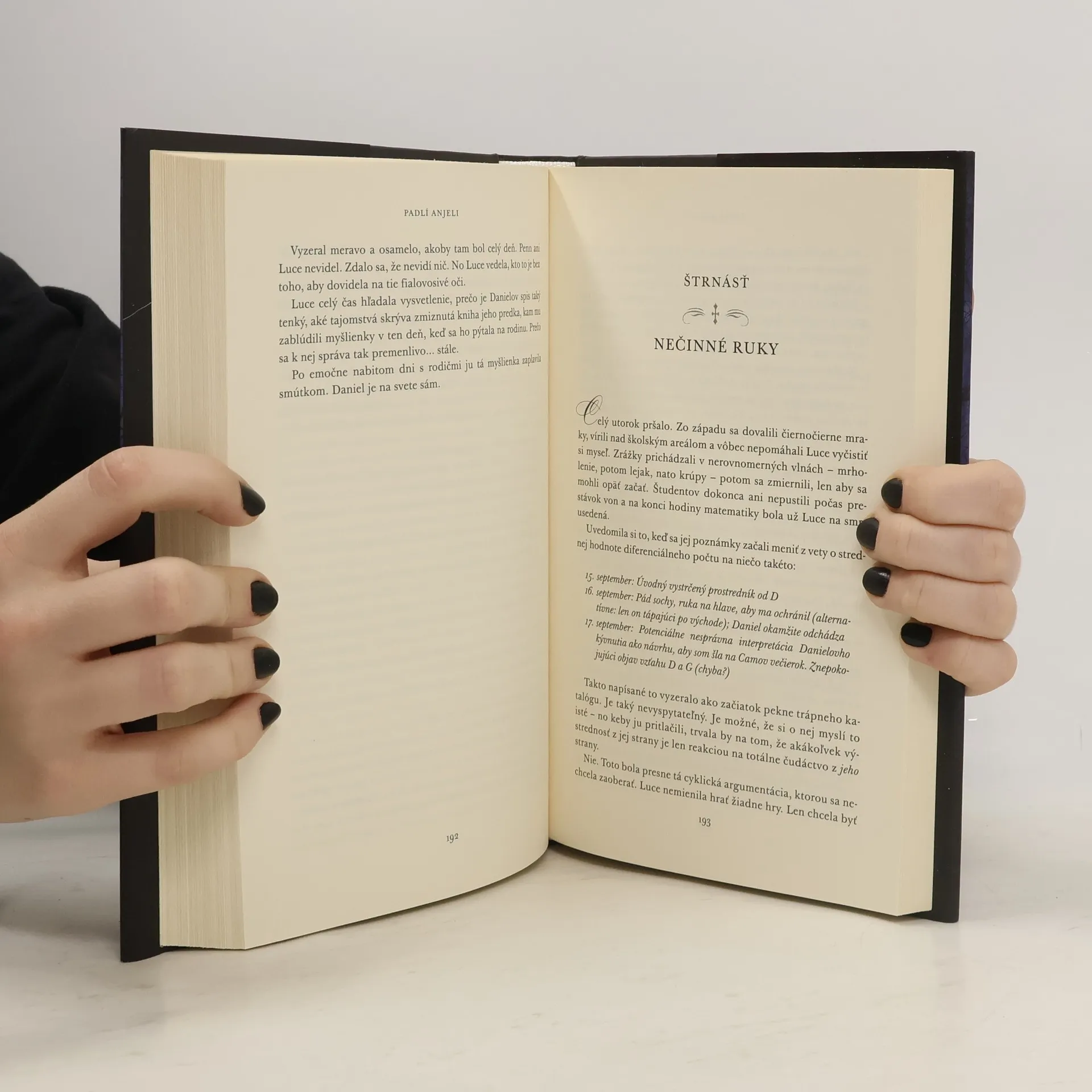 Na Danielovi Grigorim je čosi bolestne známe. Tajomný, uzavretý chlapec pritiahne pozornosť sedemnásťročnej Luce Priceovej hneď v jej prvý deň na internátnej škole Meč a kríž pri meste Savannah. Je jediným svetlým bodom na mieste, kde nie sú dovolené mobilné telefóny, ostatní študenti sú vyšinutí a bezpečnostné kamery ich sledujú na každom kroku. Daniel však nechce mať s Luce nič spoločné – a dáva jej to jasne najavo. No ona sa nevzdáva. Mládenec ju priťahuje ako svetlo nočného motýľa a Luce musí zistiť, čo pred ňou tak zúfalo skrýva... aj keby ju to malo stáť život. Nebezpečne vzrušujúci a temne romantický triler PÁD je súčasne najúžasnejším príbehom lásky!