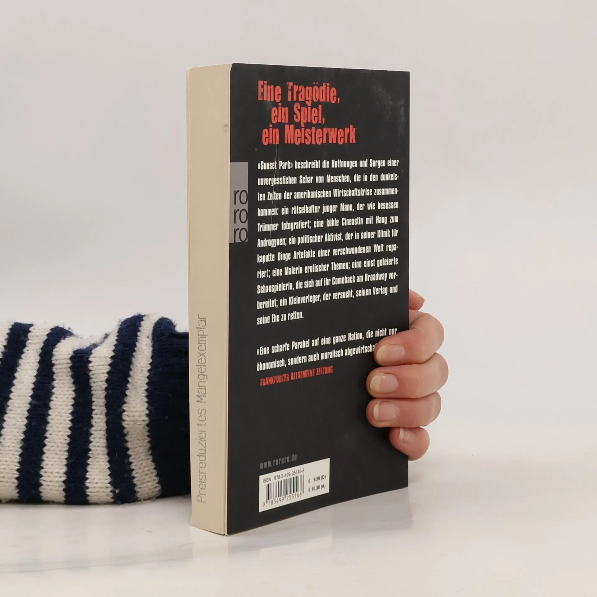 Eine Tragödie, ein Spiel, ein Meisterwerk Sunset Park beschreibt die Hoffnungen und Sorgen einer unvergesslichen Schar von Menschen, die in den dunkelsten Zeiten der amerikanischen Wirtschaftskrise zusammenkommen: ein rätselhafter junger Mann, der wie besessen Trümmer fotografiert; eine kühle Cineastin mit Hang zum Androgynen; ein politischer Aktivist, der in seiner Klinik für kaputte Dinge Artefakte einer verschwundenen Welt repariert; eine Malerin erotischer Themen; eine einst gefeierte Schauspielerin, die sich auf ihr Comeback am Broadway vorbereitet; ein Kleinverleger, der versucht, seinen Verlag und seine Ehe zu retten.