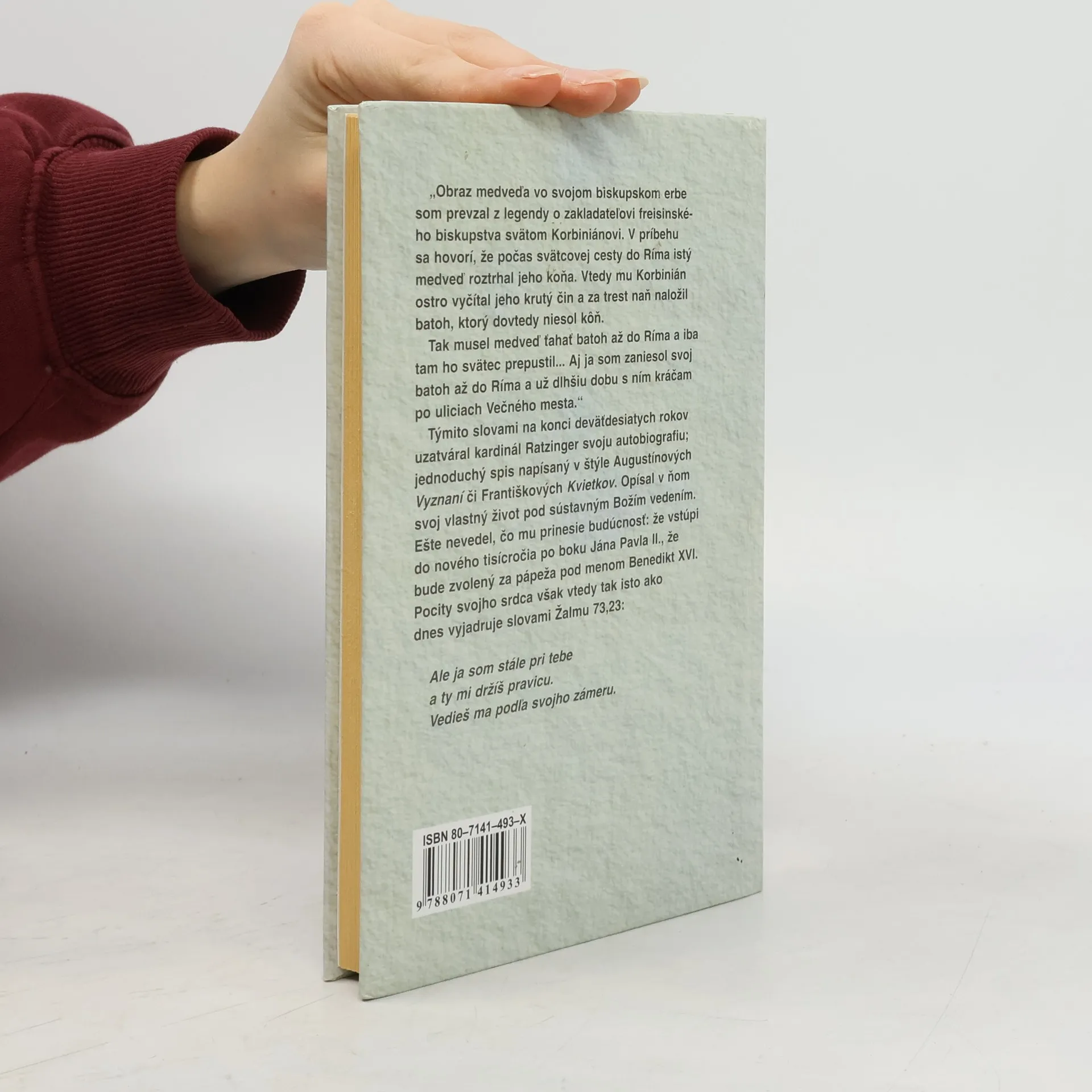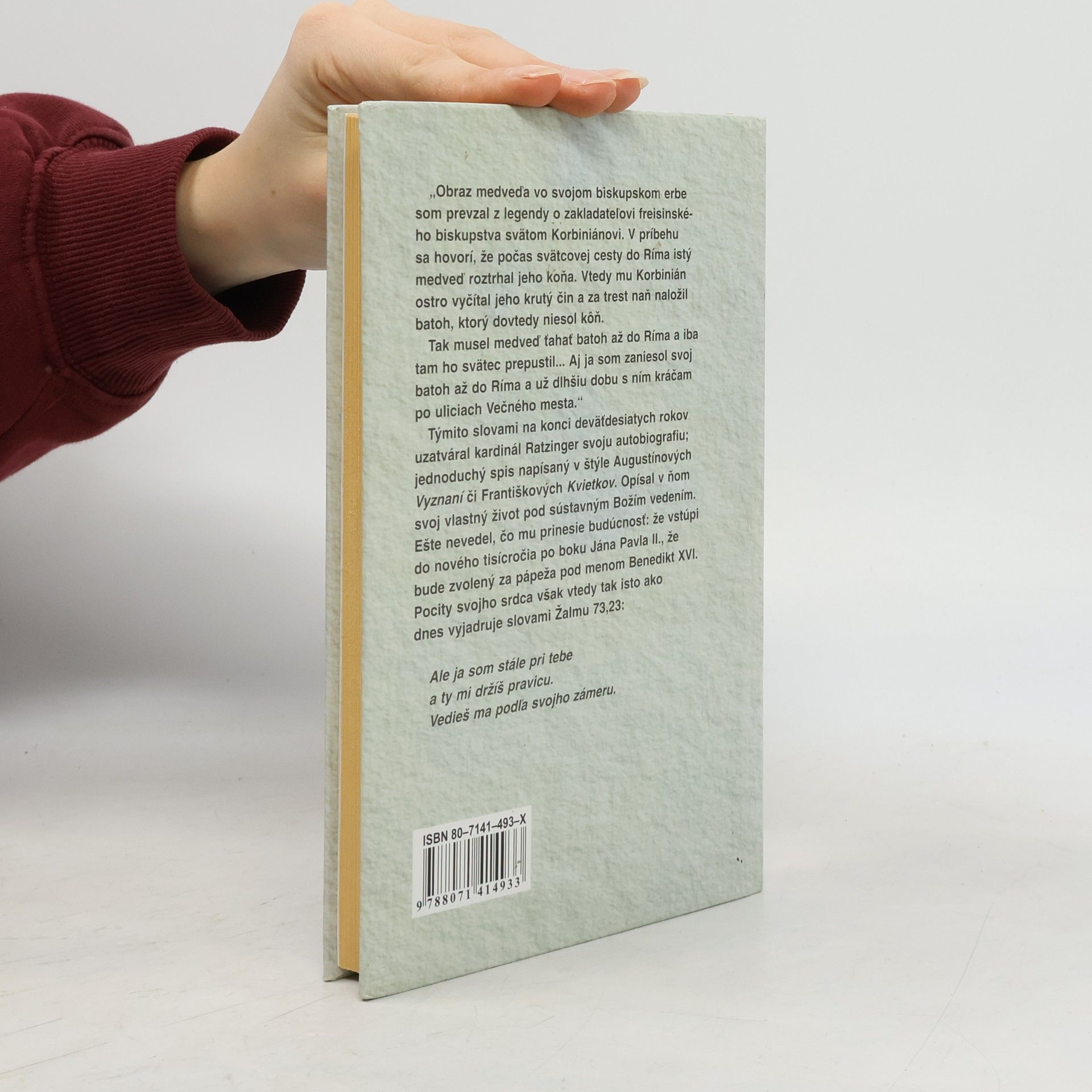 "Obraz medveďa vo svojom biskupskom erbe som prevzal z legendy o zakladateľovi freisinského biskupstva svätom Korbiniánovi. V príbehu sa hovorí, že počas svätcovej cesty do Ríma istý medveď roztrhal jeho koňa. Vtedy mu Korbinián ostro vyčítal jeho krutý čin a za trest naň naložil batoh, ktorý dovtedy niesol kôň. Tak musel medveď ťahať batoh až do Ríma a až tam ho svätec prepustil... Aj ja som zaniesol svoj batoh do Ríma a už dlhšiu dobu s ním kráčam po uliciach Večného mesta." Týmito slovami na konci deväťdesiatych rokov uzatváral kardinál Ratzinger svoju autobiografiu; jednoduchý spis napísaný v štýle Augustínových Vyznaní či Františkových Kvietkov. Opísal v ňom svoj vlastný život pod sústavným Božím vedením. Ešte nevedel, čo mu prinesie budúcnosť: že vstúpi do nového tisícročia po boku Jána Pavla II., že bude zvolený za pápeža pod menom Benedikt XVI. Pocity svojho srdca však vtedy rovnako ako dnes vyjadruje slovami Žalmu 73,23: Ale ja som stále pri tebe a ty mi držíš pravicu. Vedieš ma podľa svojho zámeru.