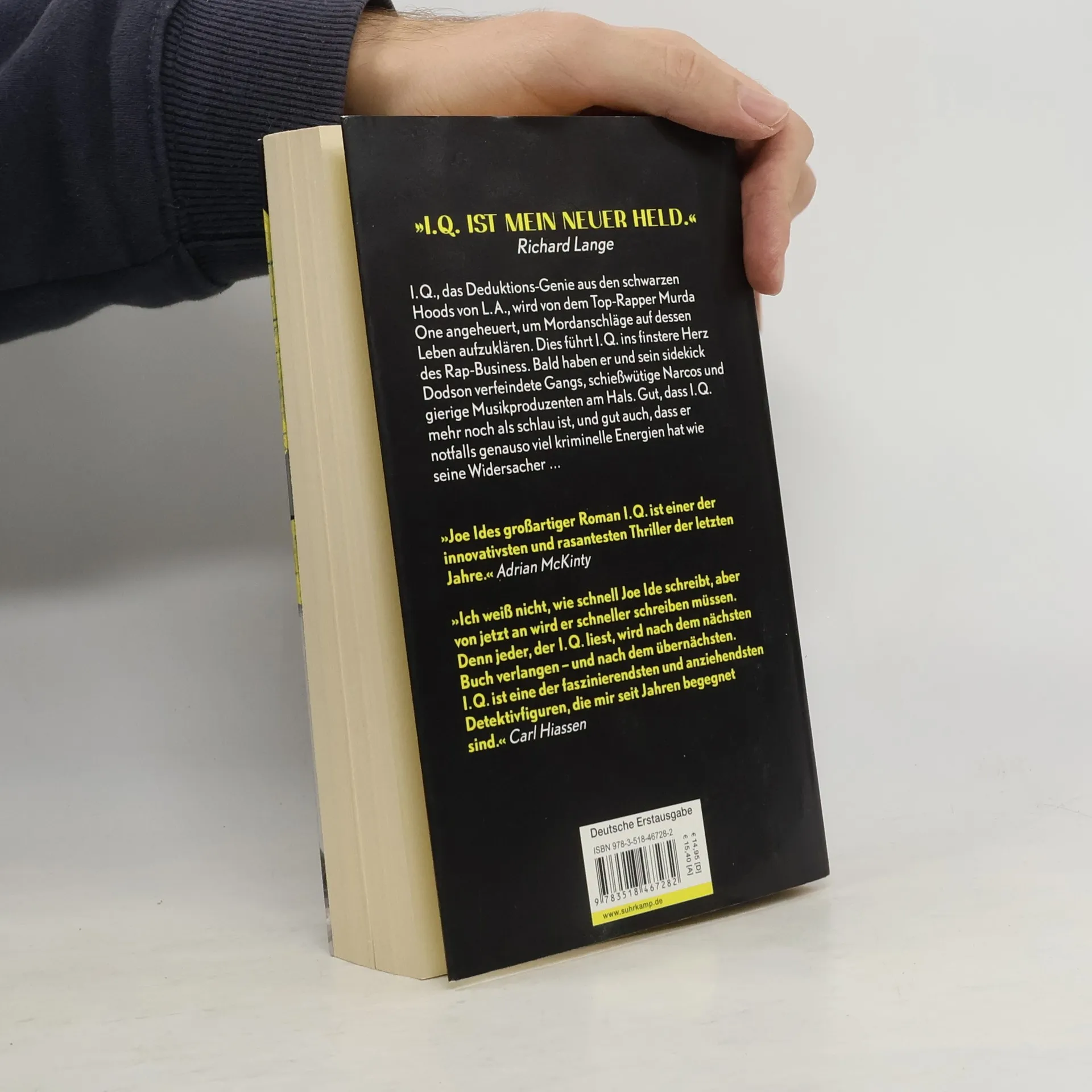 I.Q. nennt man Isaiah Quintabe in den schwarzen Hoods von Los Angeles. Weil er ein Genie ist und weil er als eine Art Nachbarschaftsdetektiv ohne Lizenz den »kleinen Leuten« zu ihrem Recht verhilft. Oder wenn das schwierig ist, immerhin zu Gerechtigkeit, Genugtuung und Entschädigung. Zusammen mit seinem sidekick, dem schlagfertigen Gangsta Dodson, wird er wider Willen von dem Top-Rapper Murda One angeheuert, um Mordanschläge auf dessen Leben aufzuklären. Das führt ins finstere Herz des Rap-Business, wo sich jede Menge wunderliche und tödliche Gestalten tummeln: Gangsta Rapper, Bitches, Anwälte, Auftragskiller, Drogenbosse, Big-Business-Leute und Medienvolk. Bald haben es I.Q. und Dodson mit verfeindeten Gangs, schießwütigen Narcos und gierigen Musikproduzenten zu tun. Gut, dass I.Q. ein Weltmeister der Deduktion ist, und gut auch, dass er notfalls genauso viel kriminelle Energien hat wie seine Widersacher. Oder noch mehr … »Joe Ides Debütroman ist der fulminante Auftakt einer wahnsinnig hinreißenden Krimiserie über einen ziemlich schlauen Kerl und das packend beschriebene kriminelle Umfeld, in dem er sich bewegt.« Janet Maslin, The New York Times