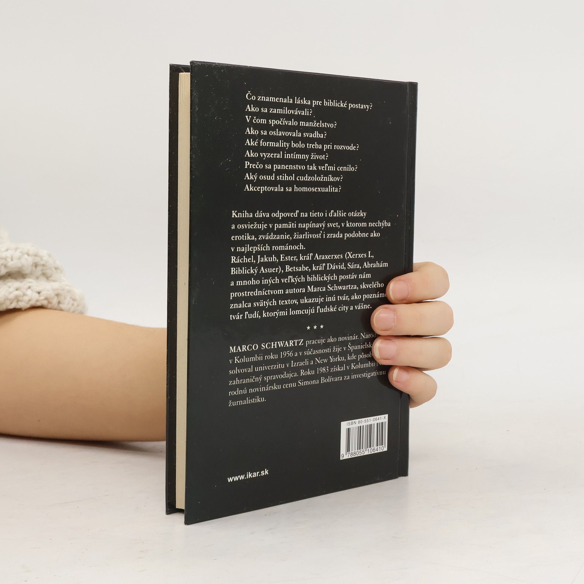 Čo znamenala láska pre biblické postavy? Ako sa zamilovávali? V čom spočívalo manželstvo? Ako sa oslavovala svadba? Aké formality bolo treba pri rozvode? Ako vyzeral intímny život? Prečo sa panenstvo tak veľmi cenilo? Aký osud stihol cudzoložníkov? Akceptovala sa homosexualita? Kniha dáva odpoveď na tieto i ďalšie otázky a osviežuje v pamäti napínavý svet, v ktorom nechýba erotika, zvádzanie, žiarlivosť i zrada podobne ako v najlepších románoch. Ráchel, Jakub, Ester, kráľ Araxerxes (Xerxes I., Biblický Asuer), Betsabe, kráľ Dávid, Sára, Abrahám a mnoho iných veľkých biblických postáv nám prostredníctvom autora Marca Schwartza, skvelého znalca svätých textov, ukazuje inú tvár, ako poznáme, tvár ľudí, ktorými lomcujú ľudské city a vášne. MARCO SCHWARTZ pracuje ako novinár. Narodil sa v Kolumbii roku 1956 a v súčasnosti žije v Španielsku. Absolvoval univerzitu v Izraeli a New Yorku, kde pôsobil ako zahraničný spravodajca. Roku 1983 získal v Kolumbii Národnú novinársku cenu Simona Bolívara za investigatívnu žurnalistiku.