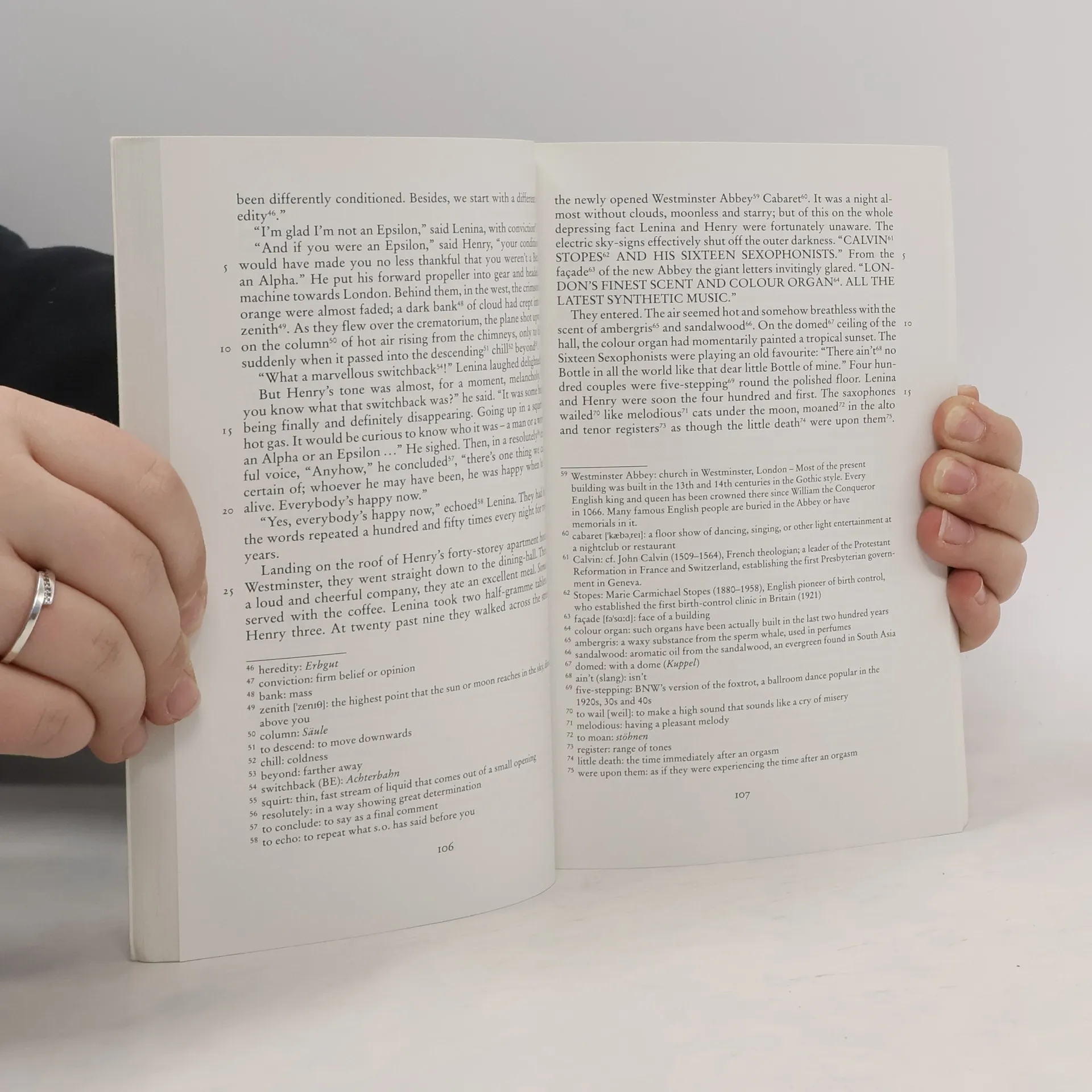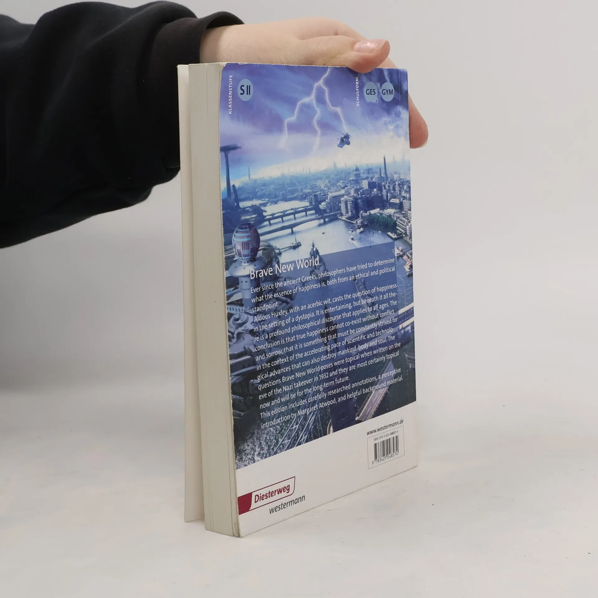 Thematischer Schwerpunkt: „Visions of future - exploring alternative worlds“ In seiner Antiutopie beschreibt Huxley eine Welt, in der eine Weltdiktatur eine perfekt funktionierende Gesellschaft erschaffen hat. Die Menschen werden in Massenproduktion im Labor gezüchtet und durch Konditionierung auf ihre Rolle vorbereitet. Unter Einfluss der Droge „Soma“ spürt niemand Schmerz oder Unzufriedenheit, soziale Kontrolle, Konsum- und Amüsierzwang sowie der Verzicht auf Freiheit bedeuten Glück. Doch in einem Reservat leben wenige Außenseiter. Ausgabe mit umfangreichem Zusatzmaterial und einem Vorwort von Margaret Atwood .