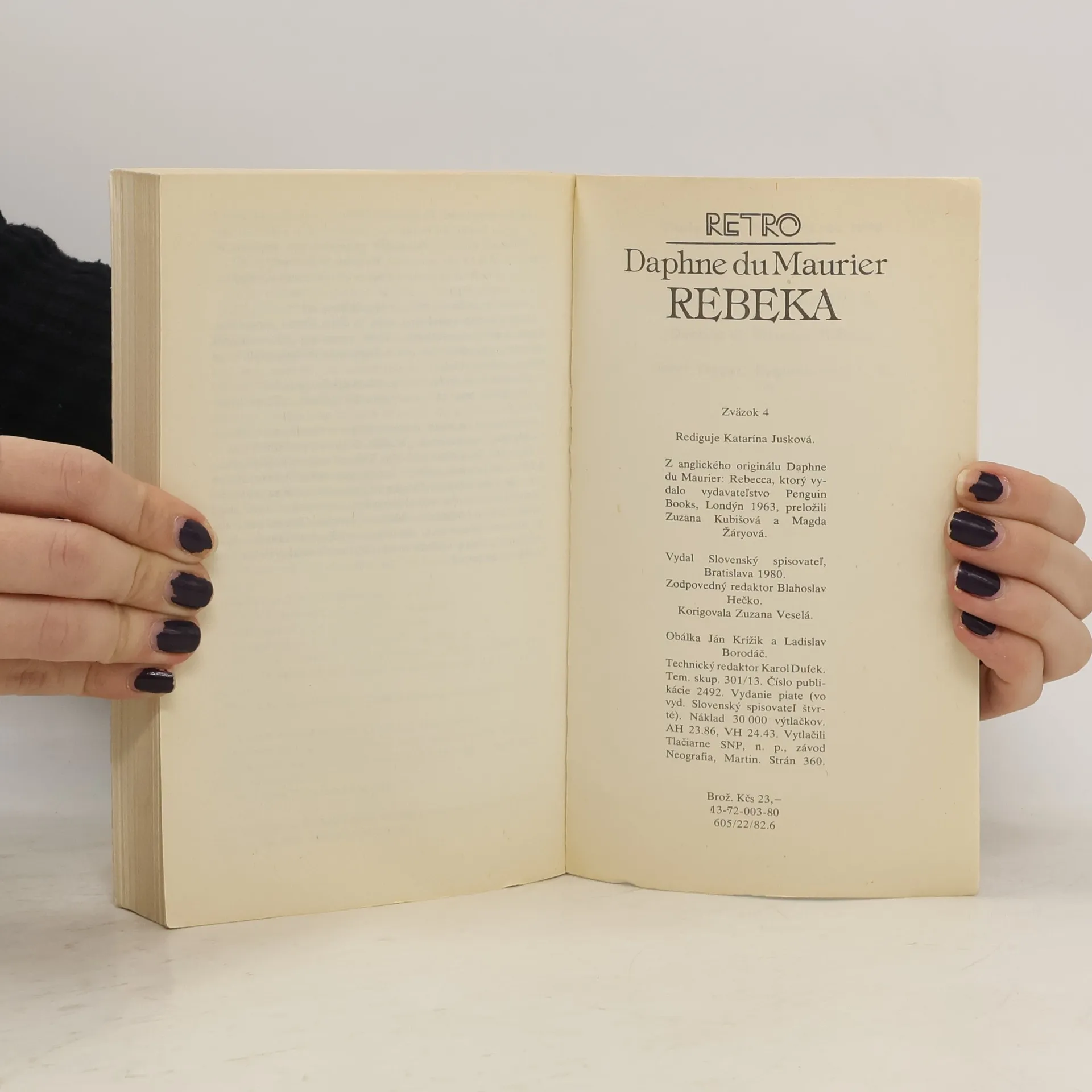 Anglická spisovateľka Daphne du Maurier (nar. 1907 v Londýne) sa po skončení štúdií v Paríži vracia do vlasti. Bohaté skúsenosti ju priam uspôsobili, aby ich preliala do literatúry. Daphne du Maurier získala úspech románom Rebeka, ktorý pre pútavý príbeh prenikol v desiatkach prekladov do cudzích rečí (bol aj sfilmovaný) najmä medzi stredné, široké čitateľské vrstvy na celom svete. Krásna a mŕtva Rebeka dlho hádže svoj tieň na novú, mladú a neskúsenú paniu zámku v Manderley uprostred rozorvanej a tajomnej prírody na juhovýchodnom pobreží Cornwallu. V dramatickom deji, ktorý sa v poslednej časti priam detektívne valí k vyústeniu, sa odhalí ozajstná príčina smrti krásnej Rebeky, aj keď sa pravda nesmela dostať na verejnosť. Nová pani v Manderley sa zbaví posadnutia, nájde pokoj a napokon hádam aj šťastie.