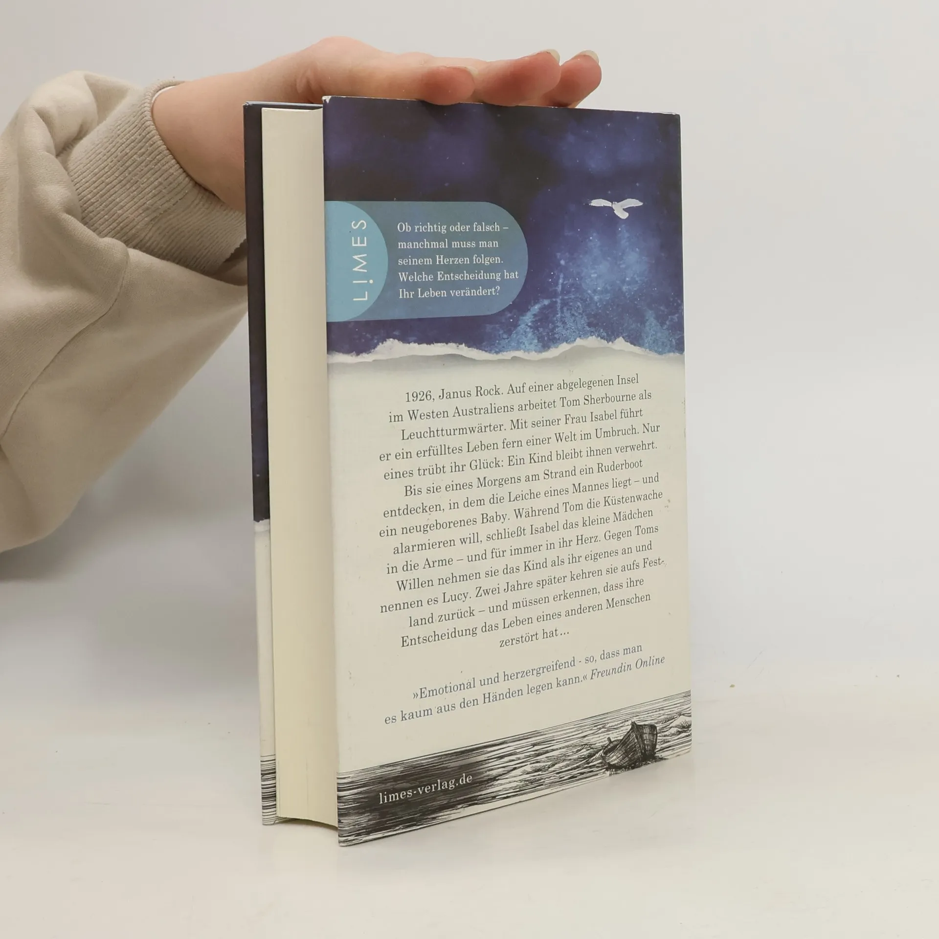 Sie brachen alle Regeln und folgten ihrem Herzen. Was danach passierte, wird das Ihre brechen. 1926, Janus Rock. Auf einer abgelegenen Insel im Westen Australiens arbeitet Tom Sherbourne als Leuchtturmwärter. Mit seiner Frau Isabel führt er ein erfülltes Leben fern einer Welt im Umbruch. Nur eines trübt ihr Glück: Ein Kind bleibt ihnen verwehrt. Bis sie eines Morgens am Strand ein Ruderboot entdecken, in dem die Leiche eines Mannes liegt – und ein neugeborenes Baby. Während Tom die Küstenwache alarmieren will, schließt Isabel das kleine Mädchen in die Arme – und für immer in ihr Herz. Gegen Toms Willen nehmen sie das Kind als ihr eigenes an und nennen es Lucy. Zwei Jahre später kehren sie aufs Festland zurück – und müssen erkennen, dass ihre Entscheidung das Leben eines anderen Menschen zerstört hat …