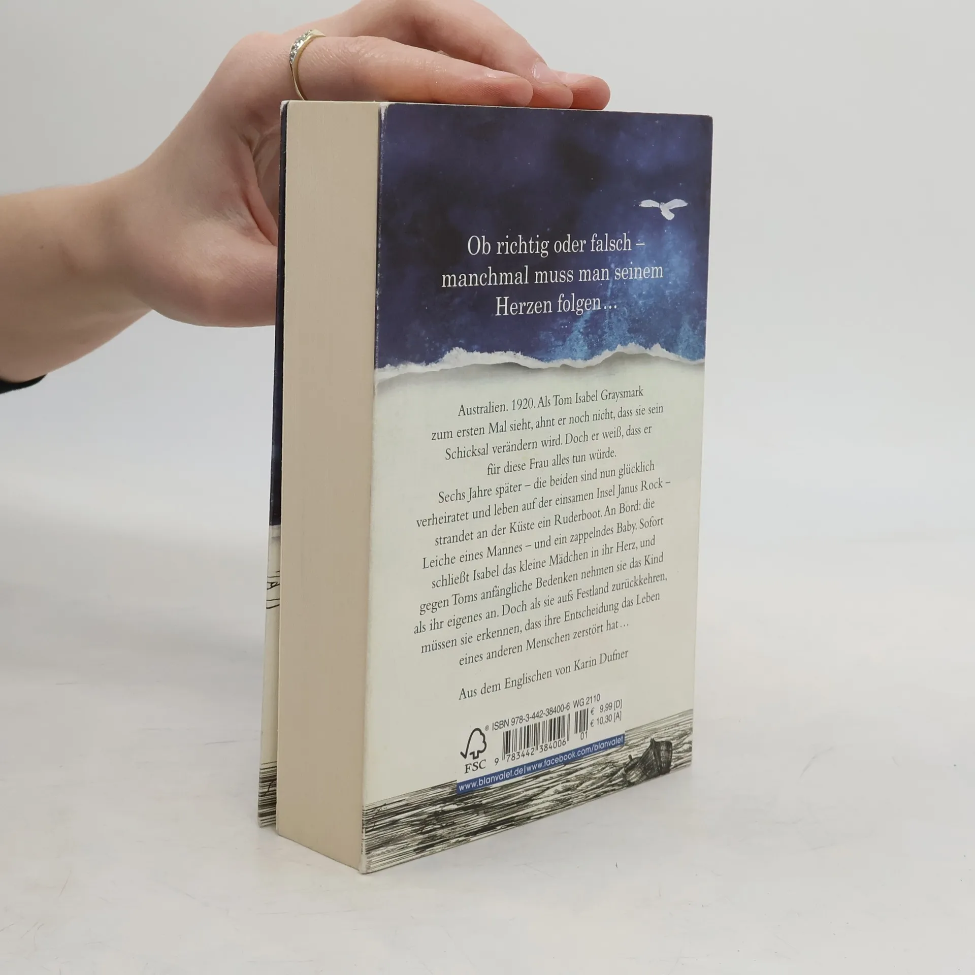 Eine Liebe so unendlich wie das Meer … Australien. 1920. Als Tom Isabel zum ersten Mal sieht, ahnt er noch nicht, dass sie sein Schicksal verändern wird. Doch er weiß, dass er für diese Frau alles tun würde. Sechs Jahre später – die beiden sind nun glücklich verheiratet und leben auf der einsamen Insel Janus Rock – strandet an der Küste ein Ruderboot. An Bord: die Leiche eines Mannes – und ein zappelndes Baby. Sofort schließt Isabel das kleine Mädchen in ihr Herz, und gegen Toms anfängliche Bedenken nehmen sie das Kind als ihr eigenes an. Doch als sie aufs Festland zurückkehren, müssen sie erkennen, dass ihre Entscheidung das Leben eines anderen Menschen zerstört hat …