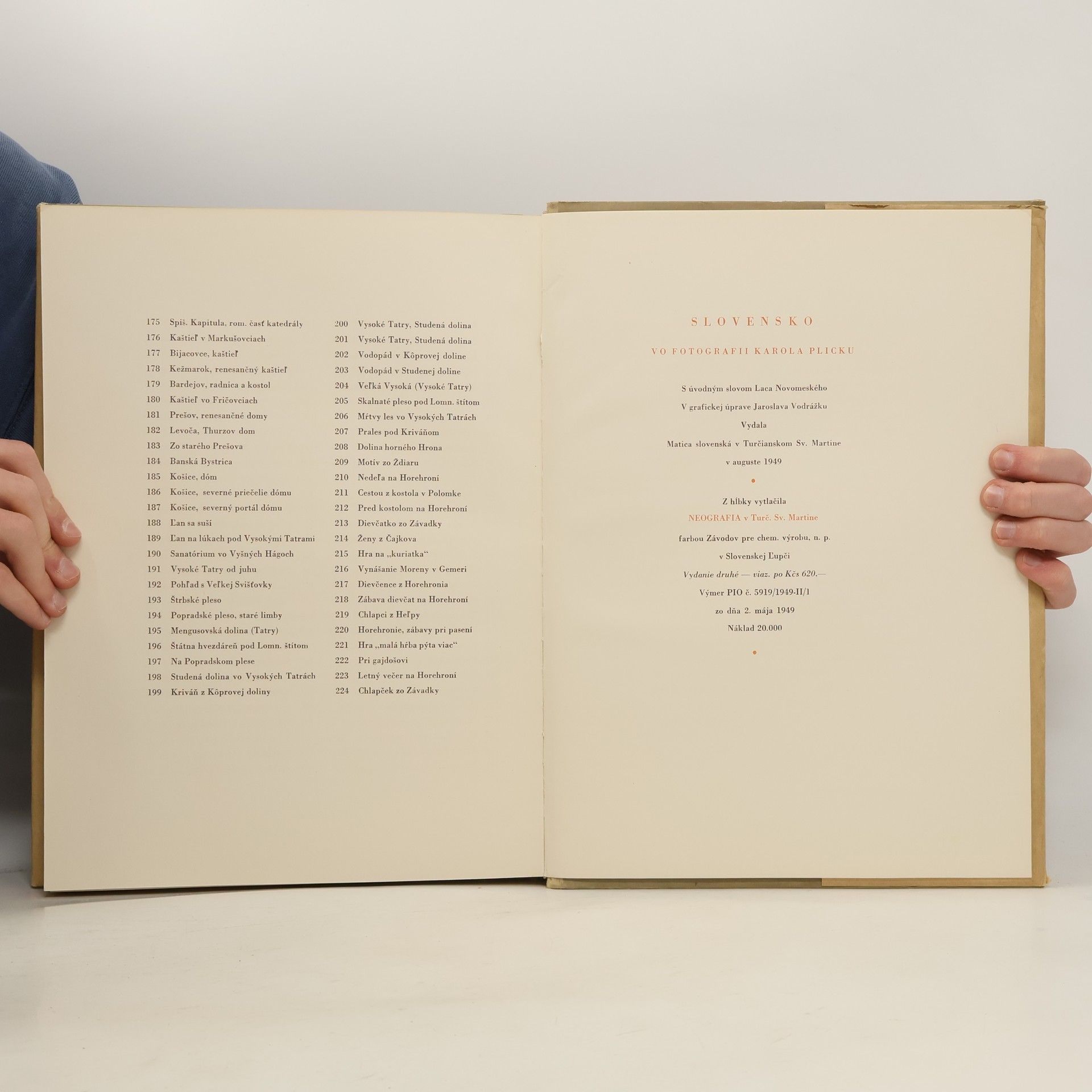 Fotografie Karola Plicky, které sám pro tuhle publikaci vybral a mapuje Slovensko těch časů - Celkem 224 hnědobílých celostránkových fotografií (snímok) - dokonale reprodukované čarovné Plickové fotografické zábery. - Kníha je pokladnicou umenia minulosti, pokladnicou živých i zabúdaných tradícií ľudových, uchovávateľom rázovitých typov slovenských ľudí. Je vznešeným, hymnickým spevom Slovenska. prvé vydanie, 620 Kčs.