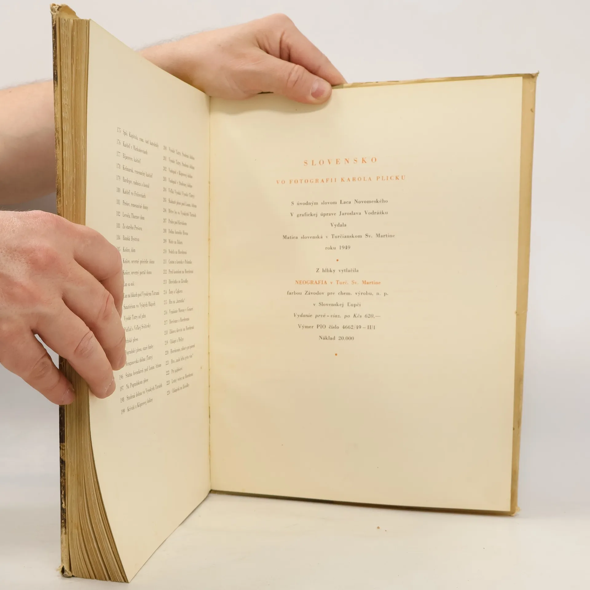 Fotografie Karola Plicky, které sám pro tuhle publikaci vybral a mapuje Slovensko těch časů - Celkem 224 hnědobílých celostránkových fotografií (snímok) - dokonale reprodukované čarovné Plickové fotografické zábery. - Kníha je pokladnicou umenia minulosti, pokladnicou živých i zabúdaných tradícií ľudových, uchovávateľom rázovitých typov slovenských ľudí. Je vznešeným, hymnickým spevom Slovenska. prvé vydanie, 620 Kčs.