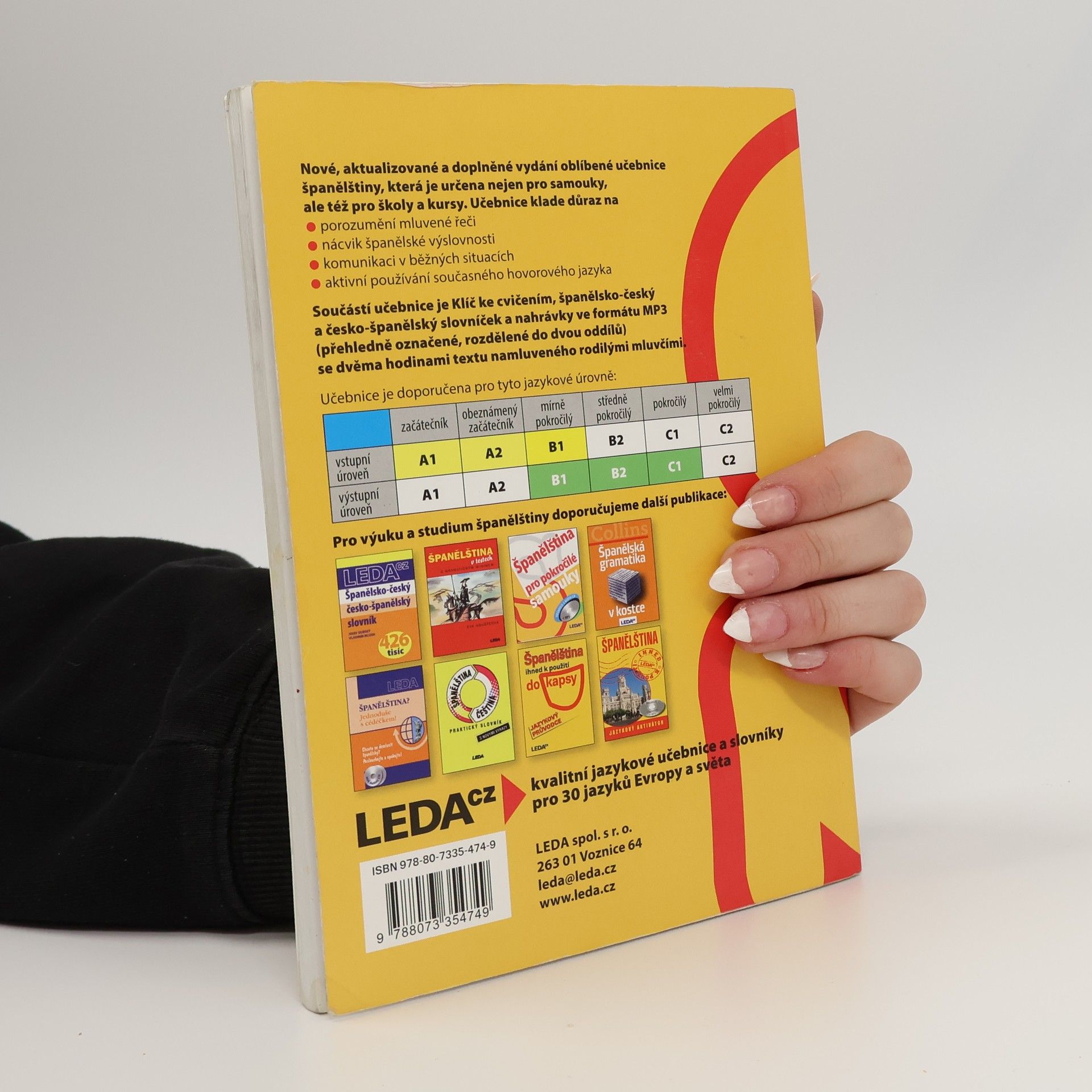 Nové, aktualizované a doplněné vydání oblíbené učebnice zaměřené na výuku evropské španělštiny (doplňkově je pozornost věnována také španělštině latinskoamerické), a to jednoduchou, přehlednou a zábavnou metodou. Ve 44 lekcích uživatel nalezne tematicky i stylisticky rozmanité texty, nejfrekventovanější slovní zásobu španělštiny a běžné frazeologismy. Gramatika je vysvětlována co nejjednodušeji a velmi přehledně a je doprovázena řadou pestrých cvičení. Formou poznámek k textu autorka seznamuje uživatele s reáliemi hispanofonních zemí. Klíč ke cvičením a závěrečný test slouží k samokontrole úspěšnosti. Nedílnou součástí je CD s nahrávkami v MP3. Učebnice je určena nejen samoukům, ale i účastníkům jazykových kursů, studentům středních škol a učilišť i těm, kdo si chtějí rozšířit či osvěžit již dříve získané znalosti španělského jazyka a používat ho v běžných životních situacích. Zvládnutí učebnice zaručuje dosažení stupně pokročilosti B2 až C1 podle doporučení Rady Evropy.