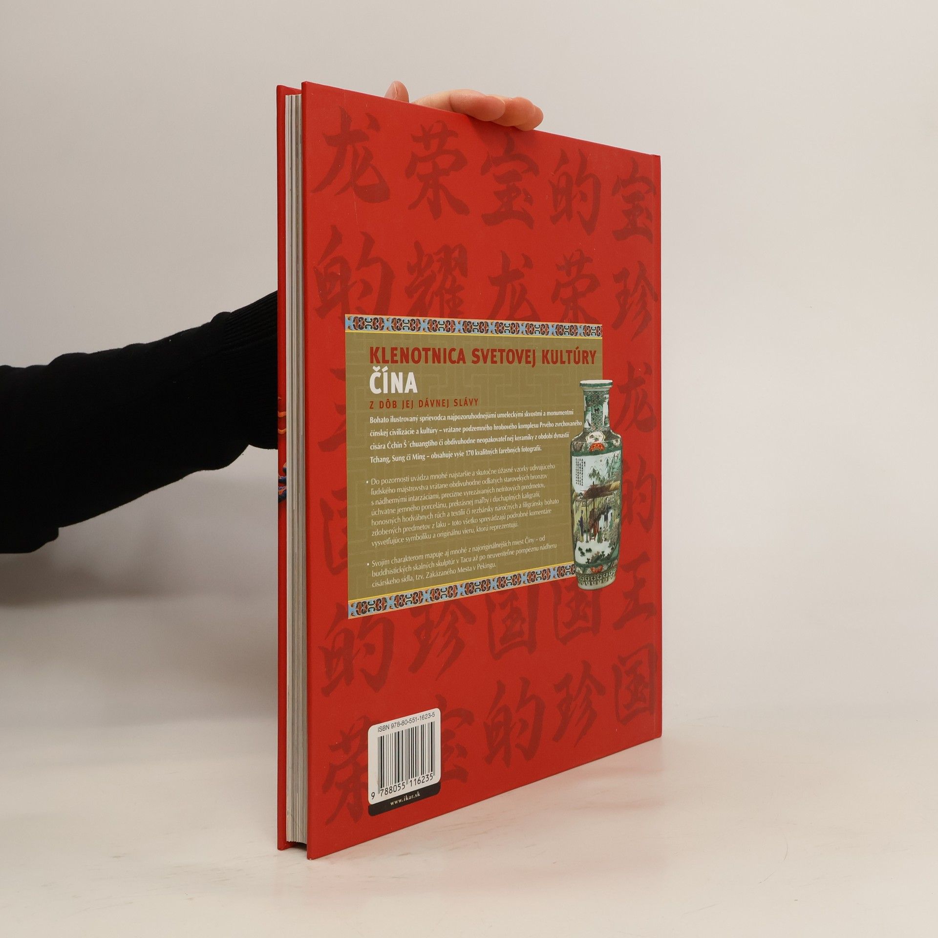 Kniha Čína, klenotnica svetovej kultúry nám ponúka obraz krajiny a civilizácie, ktorá fascinuje svet už tisícročia nielen svojím umením, ale aj historickými úspechmi, technickými výdobytkami, ako aj intelelektuálnymi a vedeckými objavmi, a v neposlednom rade i tým, že je už dlho najľudnatejšou krajinou na svete. V siedmich kapitolách mapuje dejiny najväčšej cisárskej monarchie vo východnej Ázii - od jednej dynastie k druhej, od čias pololegendárnej dynastie Sia (okolo roku 2000 pred n. l.) až po posledného cisára dynastie Čching (1644 - 1912) - teda od jej dávnych prvopočiatkov po zenit cisárskej moci a nakoniec až po jej pád. Je to fascinujúci príbeh mnohorakých podôb čínskej cisárskej moci, no i vojen a cudzích nájazdov, ako aj výprav za objavmi. Navyše podrobne mapuje vývoj bohato sa formujúceho dekoratívneho umenia či umeleckých remesiel, ale aj duchovného, filozofického i politického vzostupu. V každej kapitole sú dejiny Číny doplnené vysvetľujúcimi komentármi, ktoré výstižne popisujú jednotlivé umelecké formy a zároveň odhaľujú aj povahu a význam ich symboliky počnúc obetnými bronzmi cez kaligrafiu až po maliarstvo, architektúru či ďalšie druhy čínskeho umenia.Kniha je ilustrovaná umeleckými dielami, z ktorých vyžaruje krása, harmónia, pestrosť farieb aj nádhera tvarov, čím všetkým Čína, klenotnica svetovej kultúry skutočne veľkolepo vyzdvihuje prínos tejto obdivuhodnej civilizácie do kultúrneho dedičstva ľudstva.