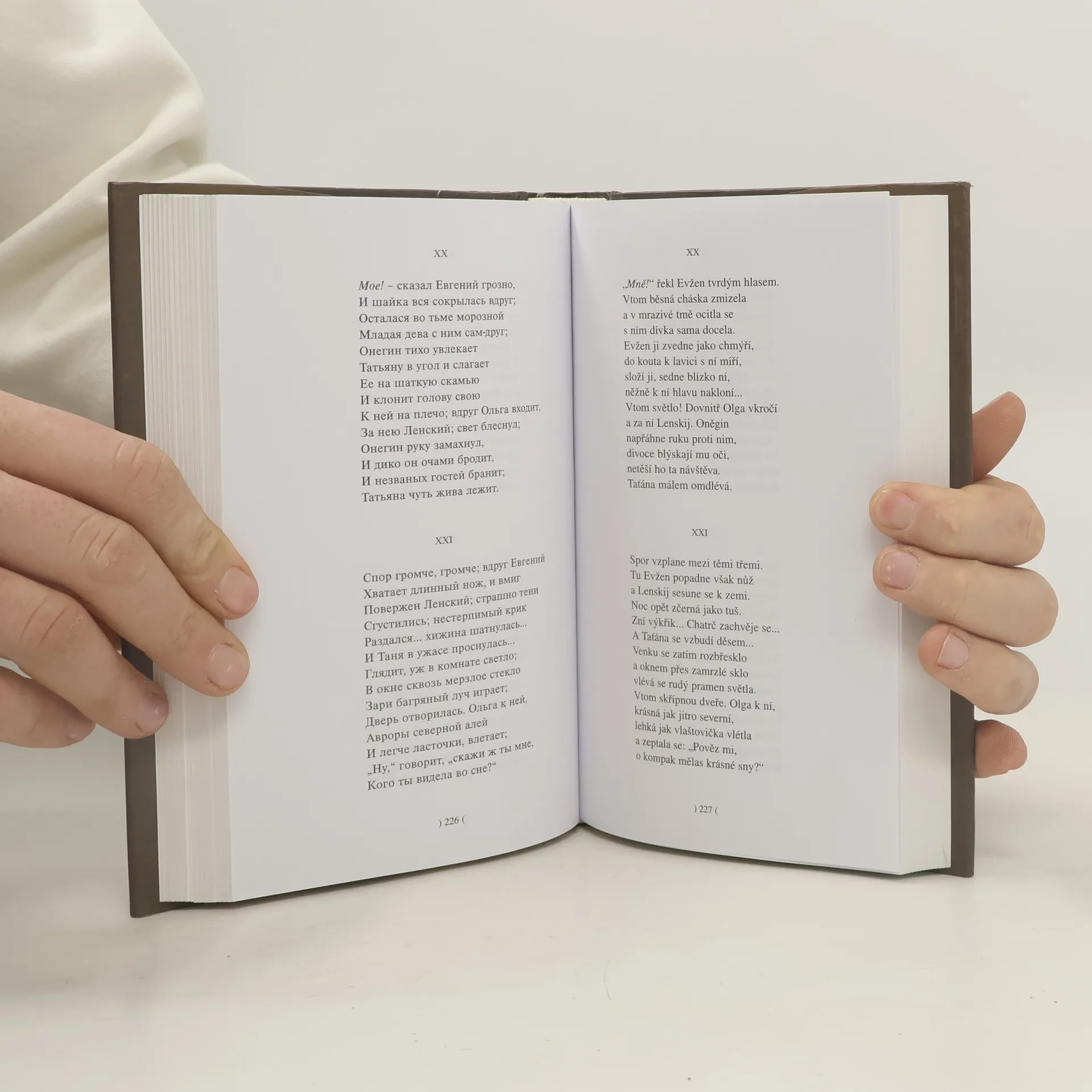 První veršovaný realistický román (psaný v letech 1823–30) – básnický obraz života statkářské Rusi 20. let 19. století. Základní dějový rozvrh se opírá o dva dopisy. Taťánin v třetí hlavě a Oněginův v poslední, osmé. V prvním se Taťána vyznává Oněginovi ze své dětinné lásky k němu, lásky mladého děvčete, které oslnil v jeho venkovském zátiší skvělý zjev velkoměstského světáka, a je odmítnuta. V druhém se zpovídá stárnoucí Oněgin po letech dobrodružství a cest ze své rozhořelé lásky k Taťáně, kterou spatřil v petěrburské společnosti jako ženu jiného – a je odmítnut. Mezi dopisy je Oněginův souboj a smrt jeho přítele, hrdinovy cesty, líčení přírody a života, aforismy a intimní lyričnost, pronikající jako lehká mlha celým epickým dílem. Je to „román, který vedle své neuvadající estetické krásy má pro nás cenu historického dokumentu, rýsujícího dobu přesněji a pravdivěji, než to do dnešního dne dělají desítky tlustých knih“ (Gorkij) – Podle úvodu. 7. vydání