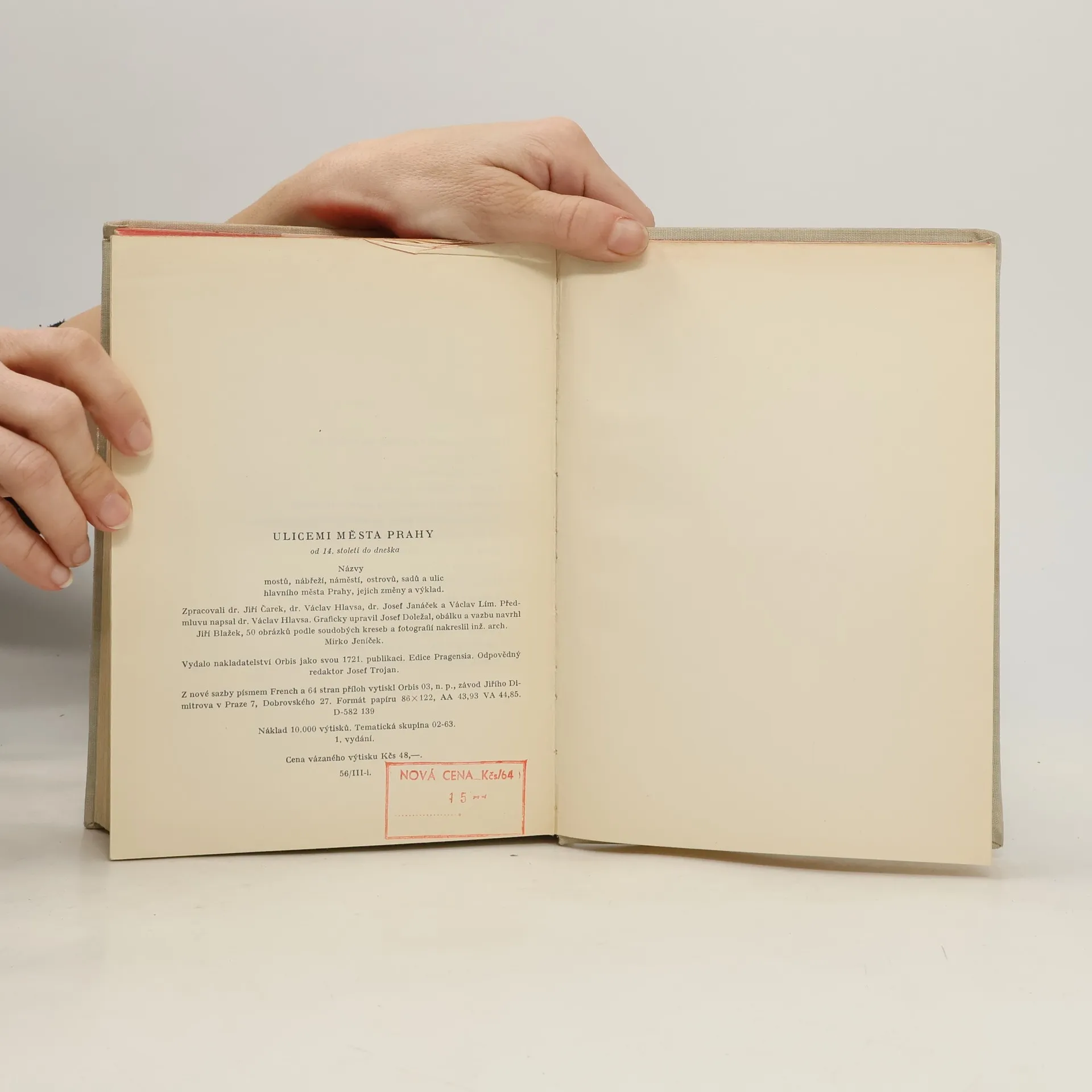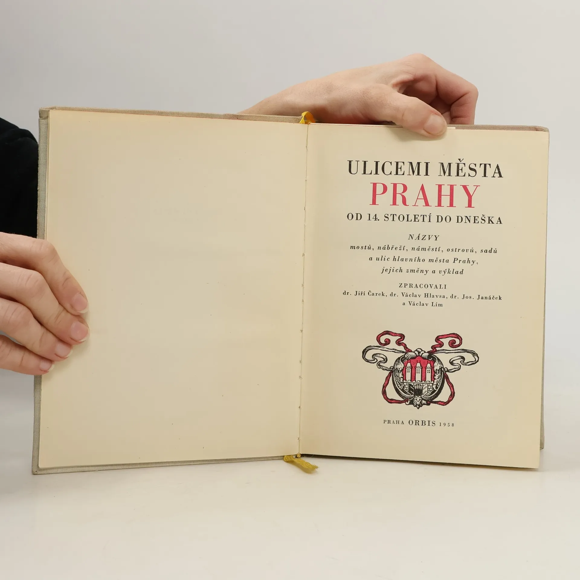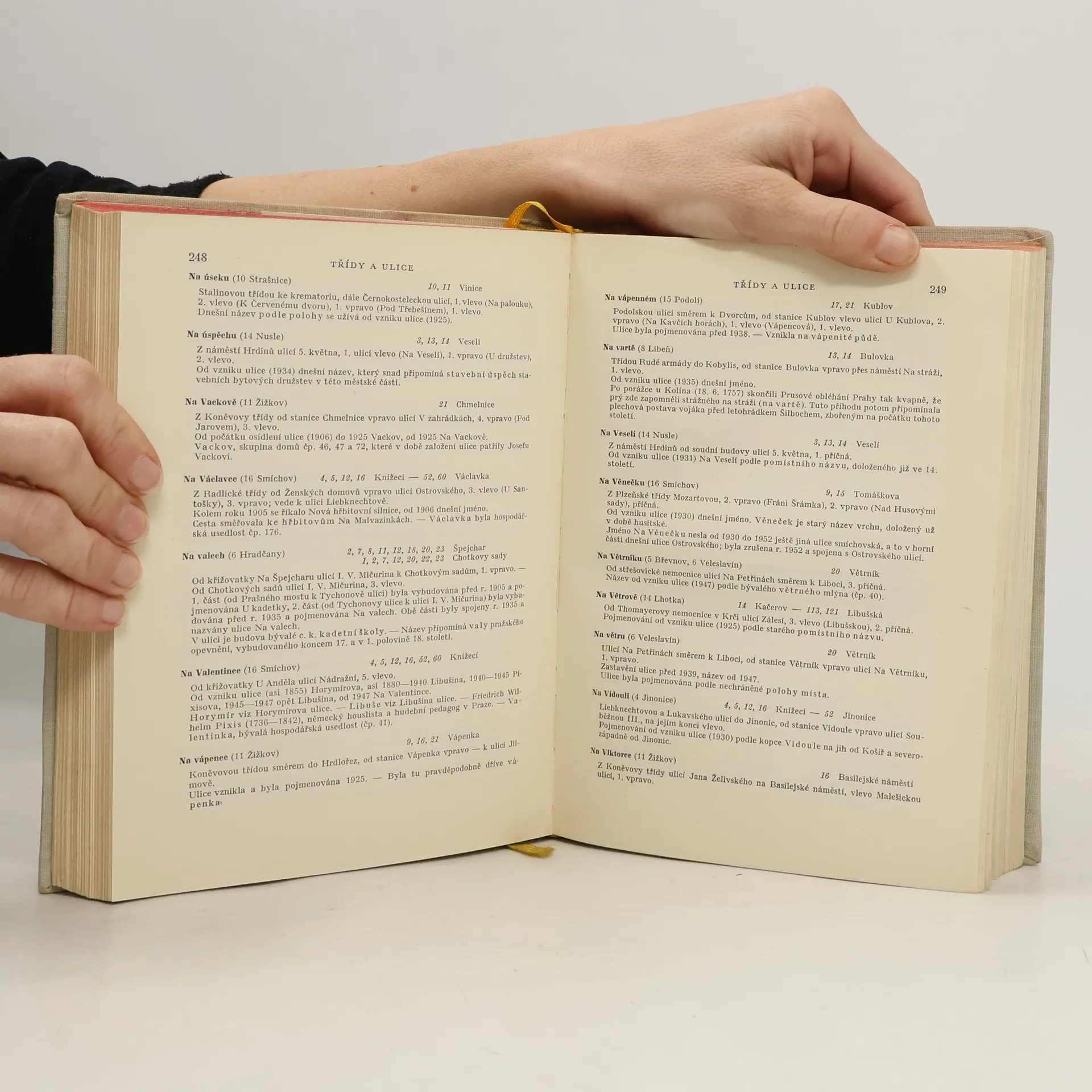 Plný titul: Ulicemi města Prahy od 14. století do dneška. Názvy mostů, nábřeží, náměstí, ostrovů, sadu a ulic hlavního města Prahy, jejich změny a výklad. Informuje v abecedním pořadí o názvech pražských ulic a prostranství od nejstarších dob po současnost, jejich poloze i historii. Doprovozeno četnými nákresy, reprodukcemi rytin, litografií a fotografií. Vlastní slovník je rozdělen do šesti skupin: 1. mosty, 2. nábřeží, 3. náměstí (rynky, trhy, placy a plácky), 4. ostrovy, 5. sady (parky, zahrady) a 6. ulice (třídy a cesty), nichž jsou zápisy řazeny abecedně pro celé území hlavního města. Záznam zahrnuje název prostranství, číslo městského obvodu a jméno katastrálního území, číslo linky MHD a název nejbližší stanice, popis přístupu od některého význačného bodu, určení doby vzniku prostranství, změny a výklad významu názvů. Slovníku předchází obecná kapitola o vývoji pražské uliční soustavy a přehled administrativního rozdělení města do 16 obvodů platného od r. 1949. Publikaci uzavírá seznam zaniklých názvů s datem platnosti a odkazem na nový název.