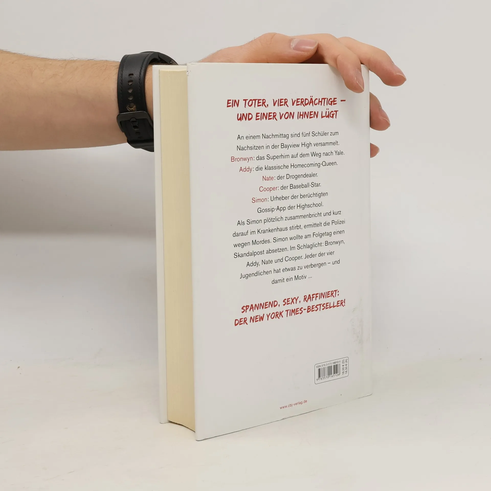 Eine Highschool, ein Toter, vier Verdächtige An einem Nachmittag sind fünf Schüler in der Bayview High zum Nachsitzen versammelt. Bronwyn, das Superhirn auf dem Weg nach Yale, bricht niemals die Regeln. Klassenschönheit Addy ist die perfekte Homecoming-Queen. Nate hat seinen Ruf als Drogendealer weg. Cooper glänzt als Baseball-Spieler. Und Simon hat die berüchtigte Gossip-App der Schule unter seiner Kontrolle. Als Simon plötzlich zusammenbricht und kurz darauf im Krankenhaus stirbt, ermittelt die Polizei wegen Mordes. Simon wollte am Folgetag einen Skandalpost absetzen. Im Schlaglicht: Bronwyn, Addy, Nate und Cooper. Jeder der vier hat etwas zu verbergen – und damit ein Motiv... Karen M. McManus bei cbj & cbt: One Of Us Is LyingTwo Can Keep A SecretOne Of Us Is NextThe CousinsYou will be the death of meNothing more to tellOne of us is backAlle Bücher können unabhängig voneinander gelesen werden.