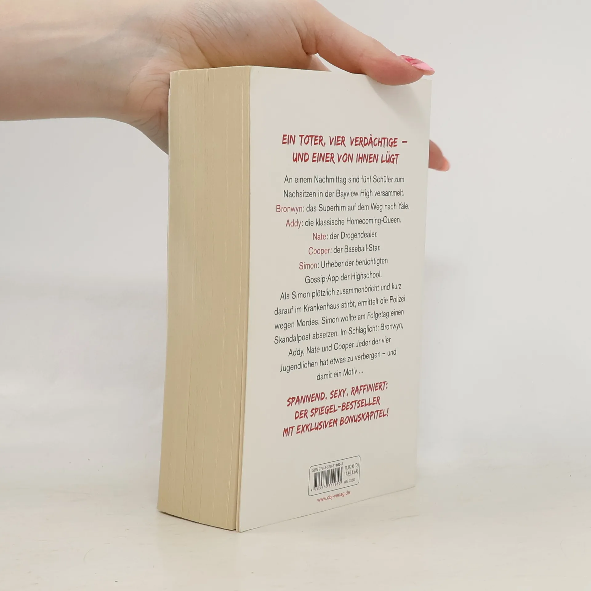 Eine Highschool. Ein Toter. Vier Verdächtige. An einem Nachmittag sind fünf Schüler in der Bayview High zum Nachsitzen versammelt. Bronwyn, das Superhirn auf dem Weg nach Yale, bricht niemals die Regeln. Klassenschönheit Addy ist die perfekte Homecoming-Queen. Nate hat seinen Ruf als Drogendealer weg. Cooper glänzt als Baseball-Spieler. Und Simon hat die berüchtigte Gossip-App der Schule unter seiner Kontrolle. Als Simon plötzlich zusammenbricht und kurz darauf im Krankenhaus stirbt, ermittelt die Polizei wegen Mordes. Simon wollte am Folgetag einen Skandalpost absetzen. Im Schlaglicht: Bronwyn, Addy, Nate und Cooper. Jeder der vier hat etwas zu verbergen – und damit ein Motiv... Mit einem exklusiven Bonuskapitel! Karen M. McManus bei cbj & cbt: One Of Us Is Lying Two Can Keep A Secret One Of Us Is Next The Cousins You will be the death of me Nothing more to tell One of us is back Alle Bücher können unabhängig voneinander gelesen werden.