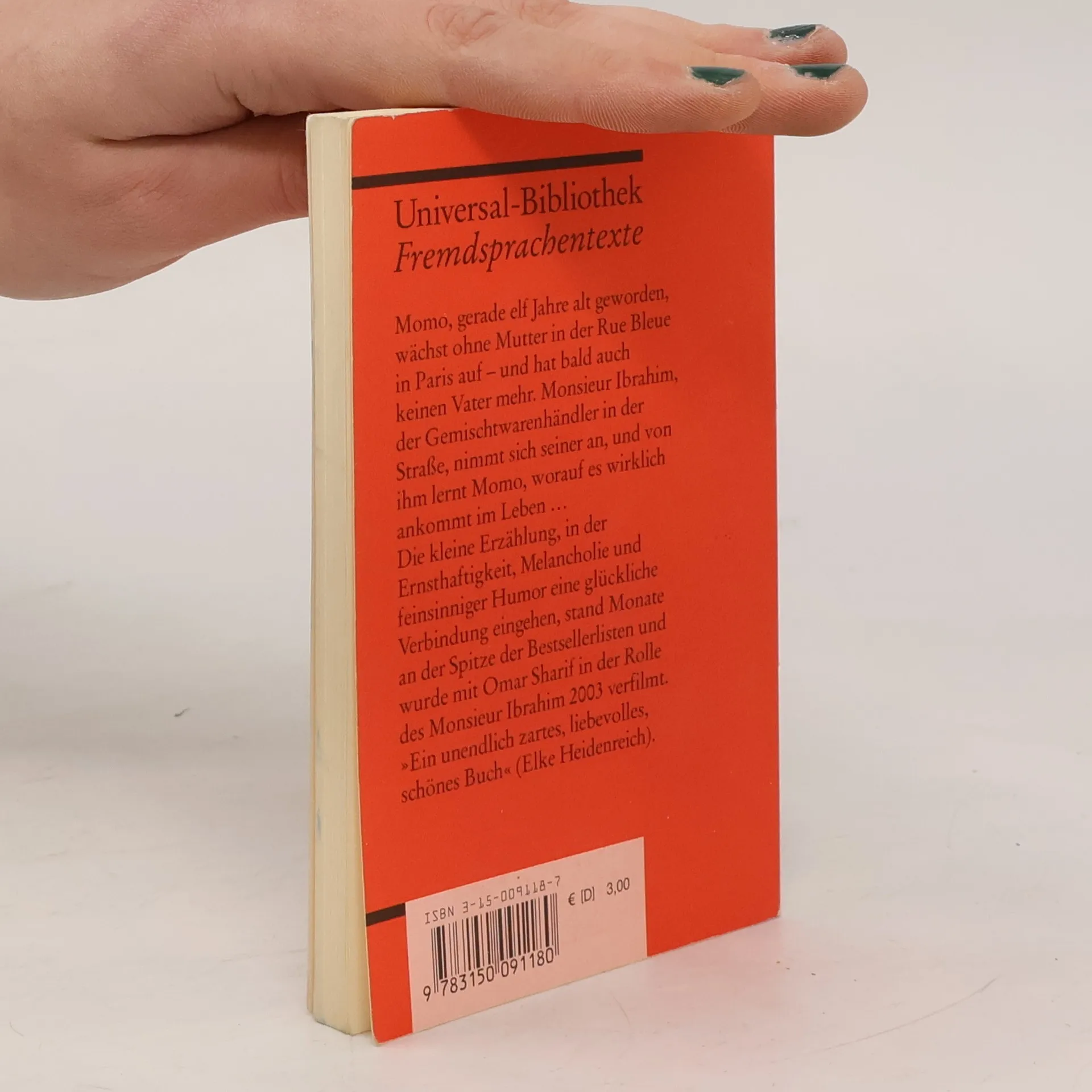 Französische Literatur in Reclams Roter Reihe: das ist der französische Originaltext – ungekürzt und unbearbeitet mit Worterklärungen am Fuß jeder Seite, Nachwort und Literaturhinweisen. Momo, gerade elf Jahre alt geworden, wächst ohne Mutter in der Rue Bleue in Paris auf – und hat bald auch keinen Vater mehr. Monsieur Ibrahim, der Gemischtwarenhändler an der Ecke, nimmt sich seiner an, und von ihm lernt Momo, worauf es wirklich ankommt im Leben … »Ein unendlich zartes, liebevolles, schönes Buch« (Elke Heidenreich) Französische Lektüre: Niveau B1 (GER) Sprachen: Französisch, Deutsch