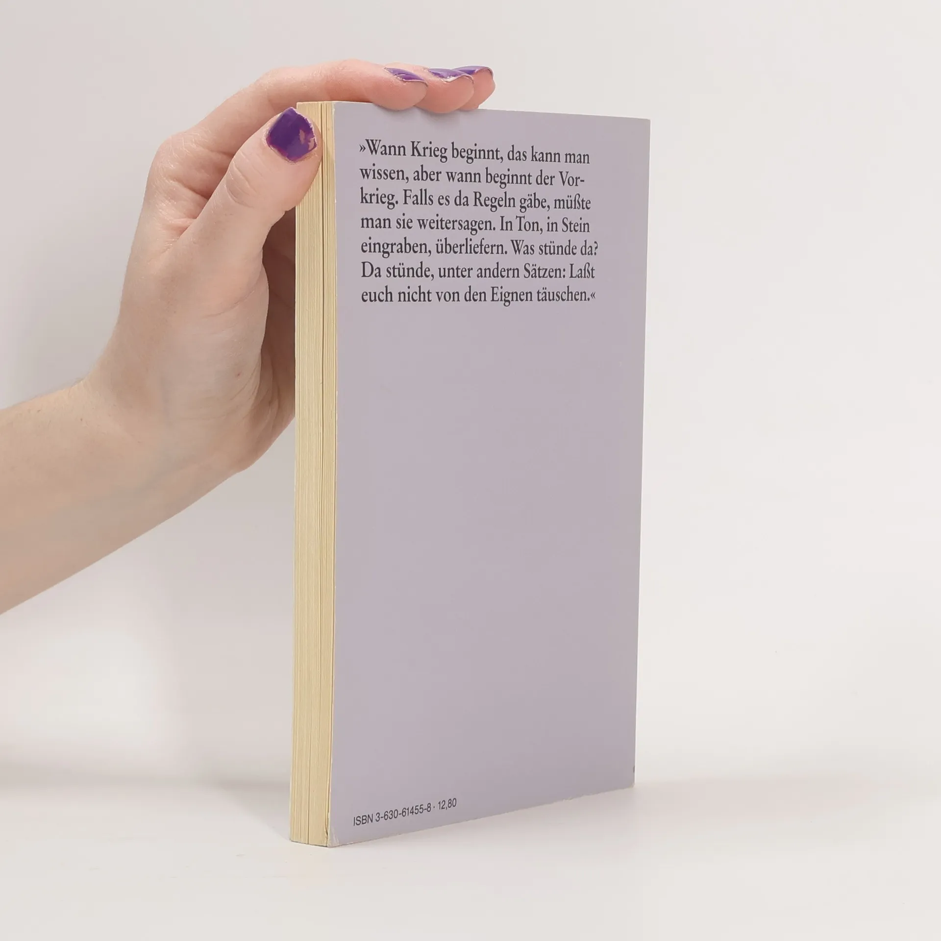 \"Wann Krieg beginnt, das kann man wissen, aber wann beginnt der Vorkrieg. Falls es da Regeln gäbe, müßte man sie weitersagen. In Ton, in Stein eingraben, überliefern. Was stünde da? Da stünde, unter andern Sätzen: Laßt euch nicht von den Eignen täuschen.\"