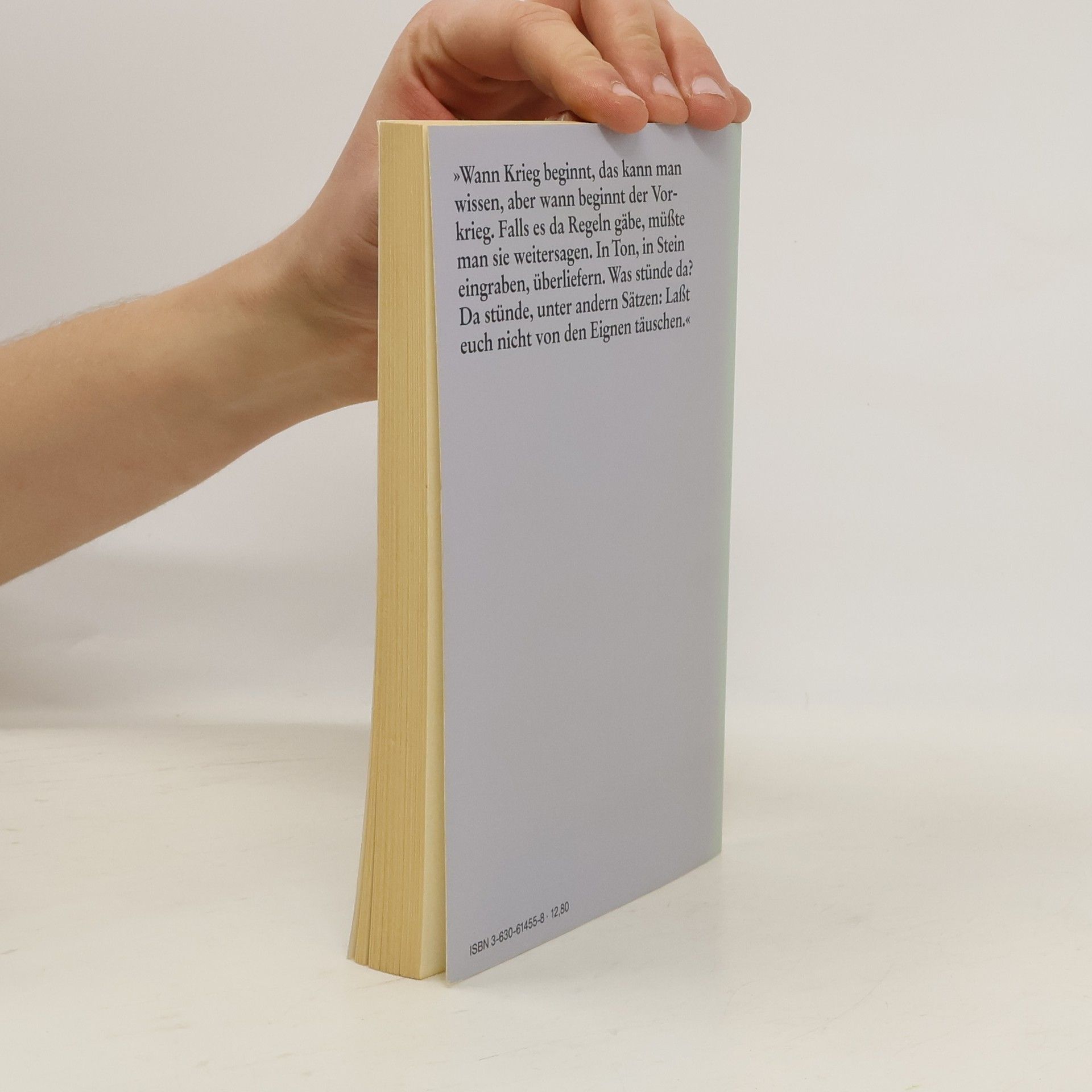 \"Wann Krieg beginnt, das kann man wissen, aber wann beginnt der Vorkrieg. Falls es da Regeln gäbe, müßte man sie weitersagen. In Ton, in Stein eingraben, überliefern. Was stünde da? Da stünde, unter andern Sätzen: Laßt euch nicht von den Eignen täuschen.\"