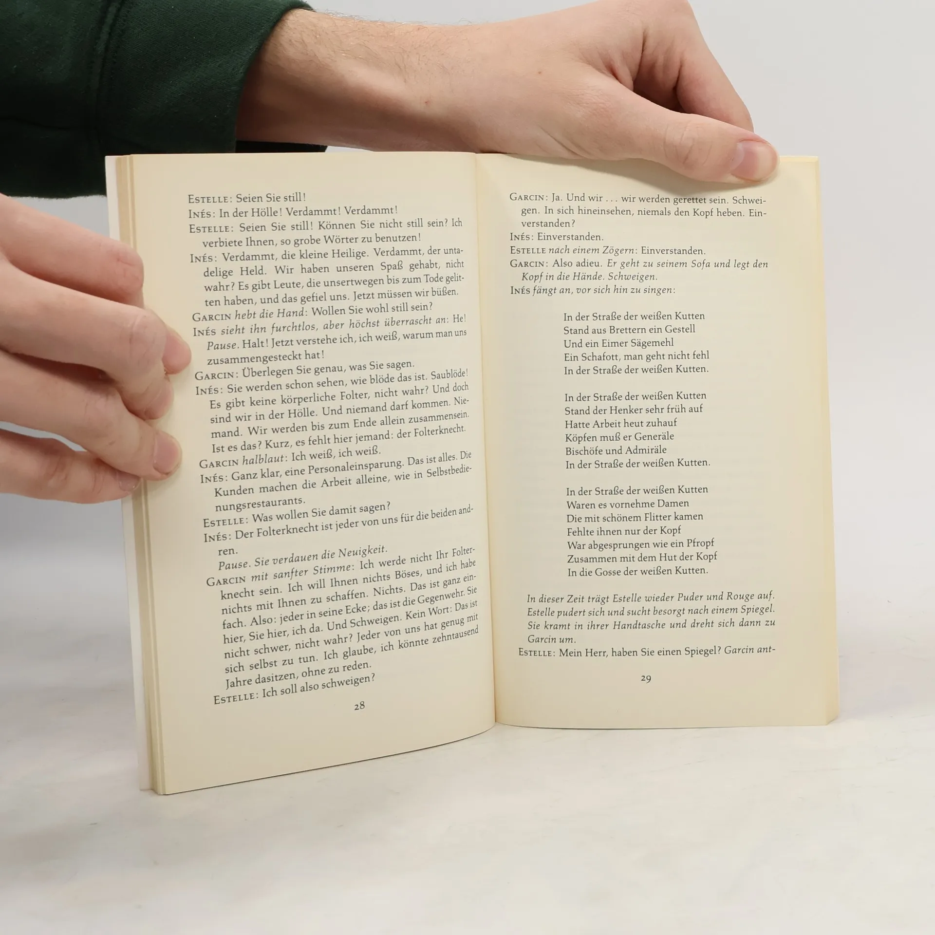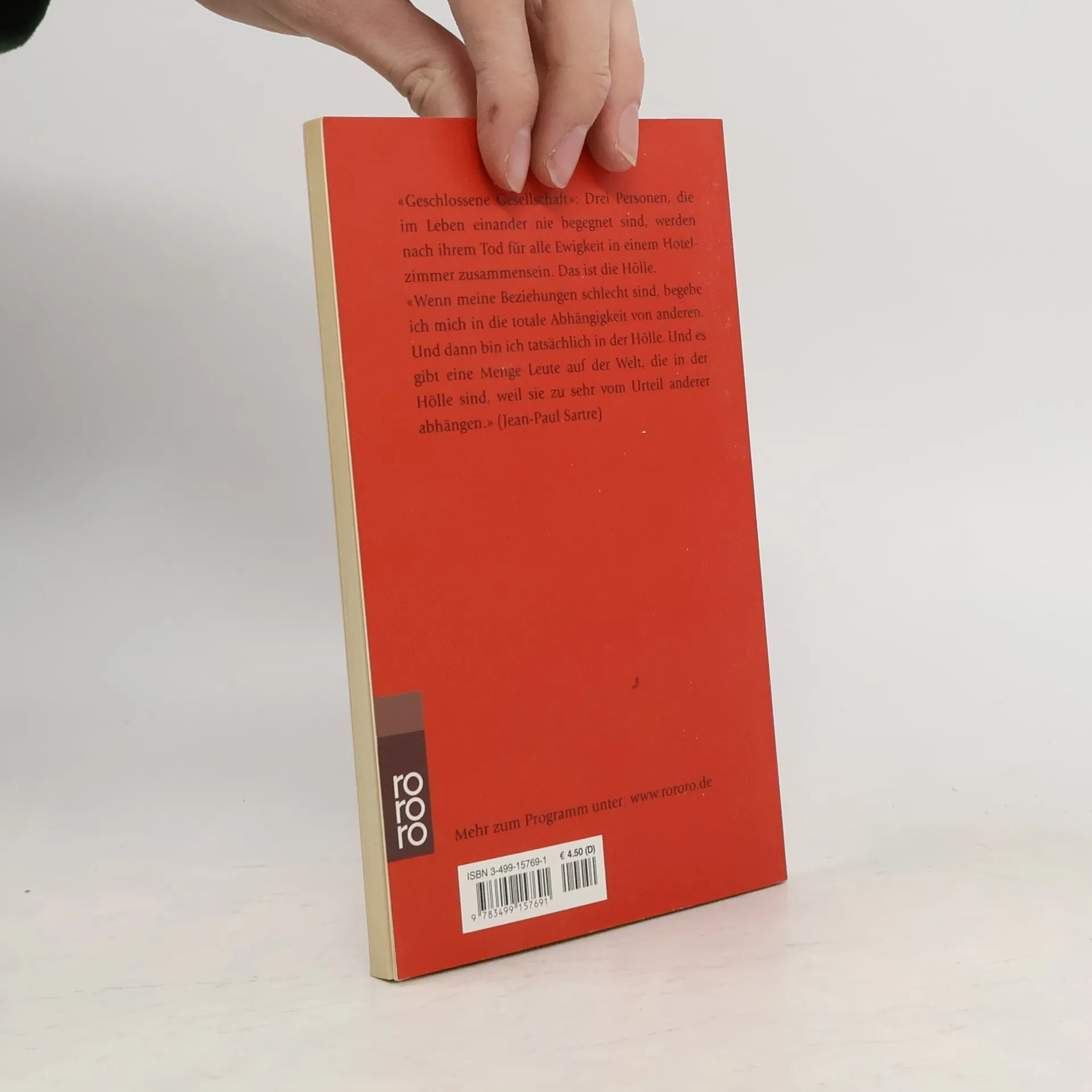 Stück in einem Akt \"Geschlossene Gesellschaft\": Drei Personen, die im Leben einander nie begegnet sind, werden nach ihrem Tod für alle Ewigkeit in einem Hotelzimmer zusammensein. Das ist die Hölle. \"Wenn meine Beziehungen schlecht sind, begebe ich mich in die totale Abhängigkeit von anderen. Und dann bin ich tatsächlich in der Hölle. Und es gibt eine Menge Leute auf der Welt, die in der Hölle sind, weil sie zu sehr vom Urteil anderer abhängen.\" (Jean-Paul Sartre)