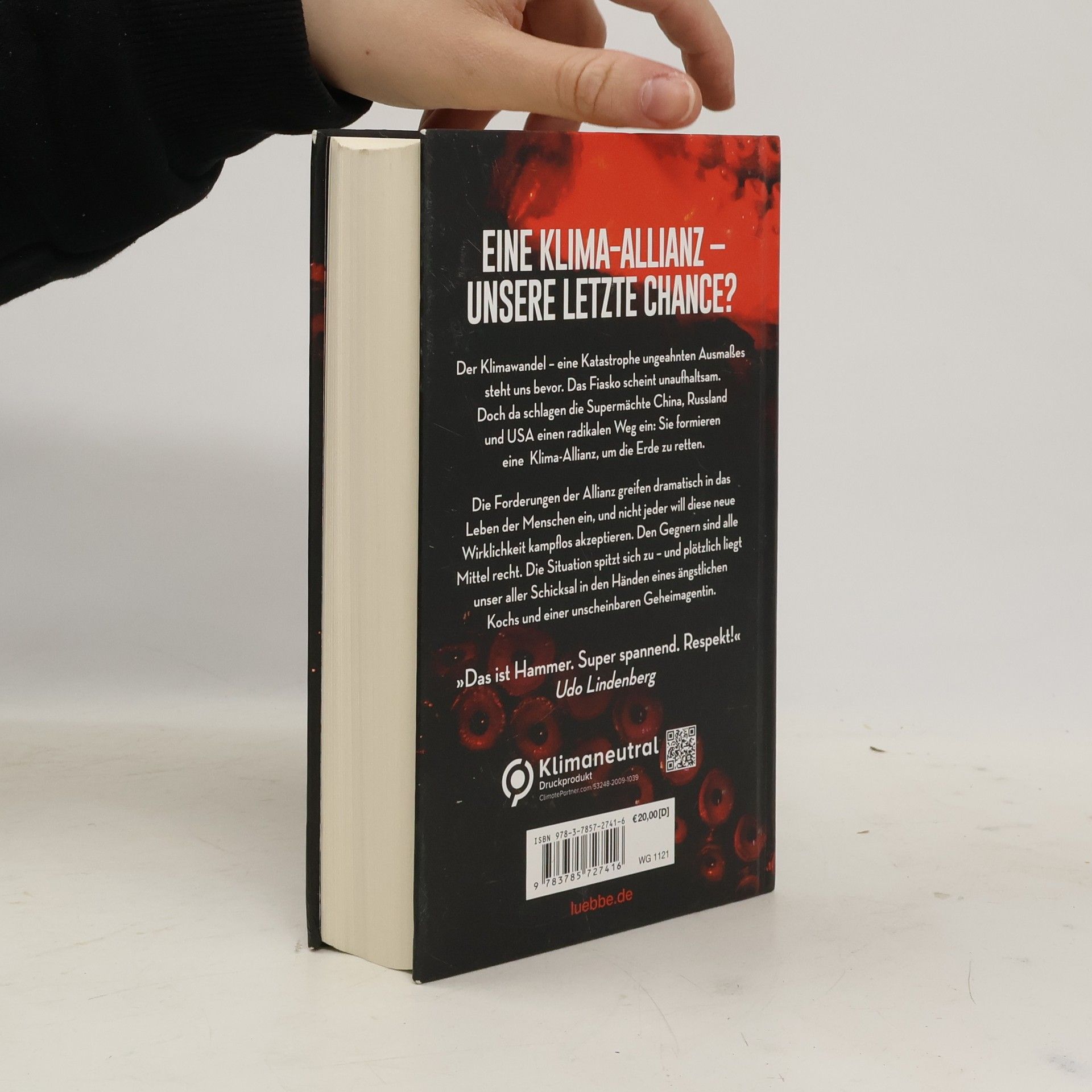 Eine Klima-Allianz - unsere letzte Chance? Der Klimawandel - eine Katastrophe ungeahnten Ausmaßes steht uns bevor. Verändert unsere Erde. Verändert unser aller Leben. Das Fiasko scheint unaufhaltsam. Bis die drei Supermächte China, Russland und die USA einen radikalen Weg einschlagen. Doch wird diese starke Klima-Allianz das Ruder noch herumreißen? Die Maßnahmen der Allianz greifen gravierend in das Leben der Menschen ein, und nicht jeder will diese neue Wirklichkeit kampflos akzeptieren. Alle Mittel sind den Gegnern recht, um ihre ökonomischen und machtpolitischen Interessen zu verteidigen. Die Situation spitzt sich dramatisch zu, und plötzlich liegt das Schicksal der Erde in den Händen eines schüchternen Kochs und einer unscheinbaren Geheimagentin. „Das ist Hammer. Super spannend. Respekt!“ Udo Lindenberg