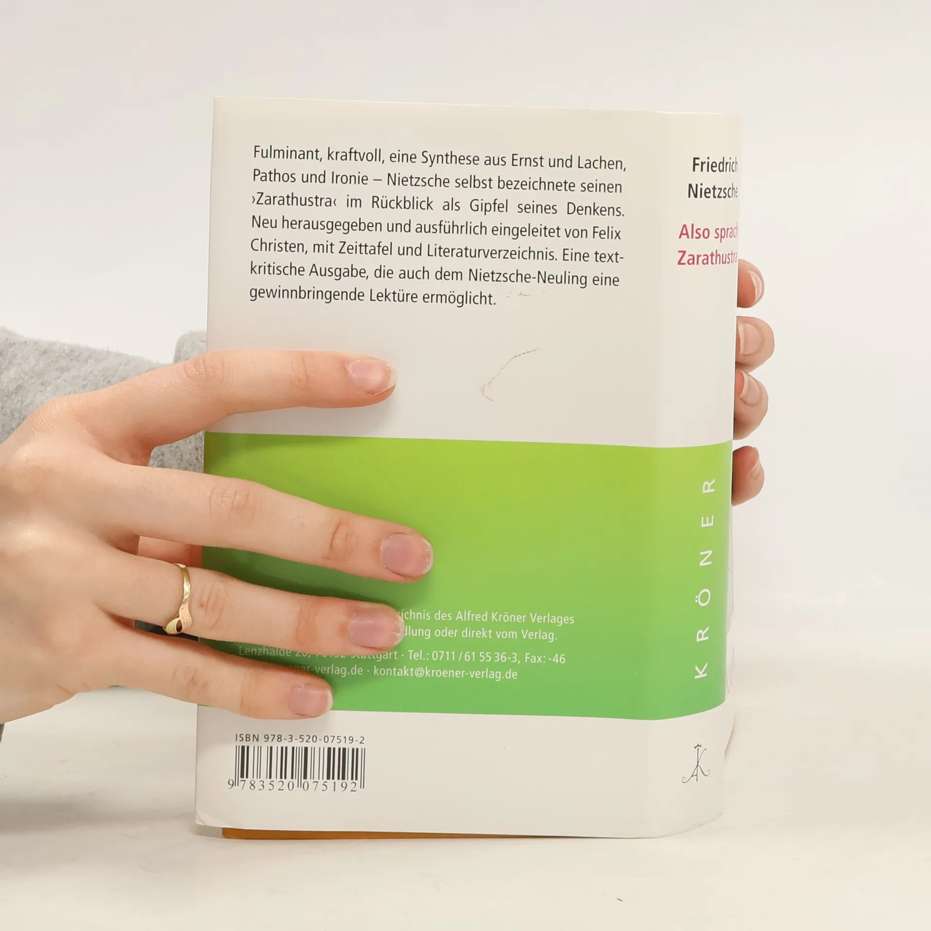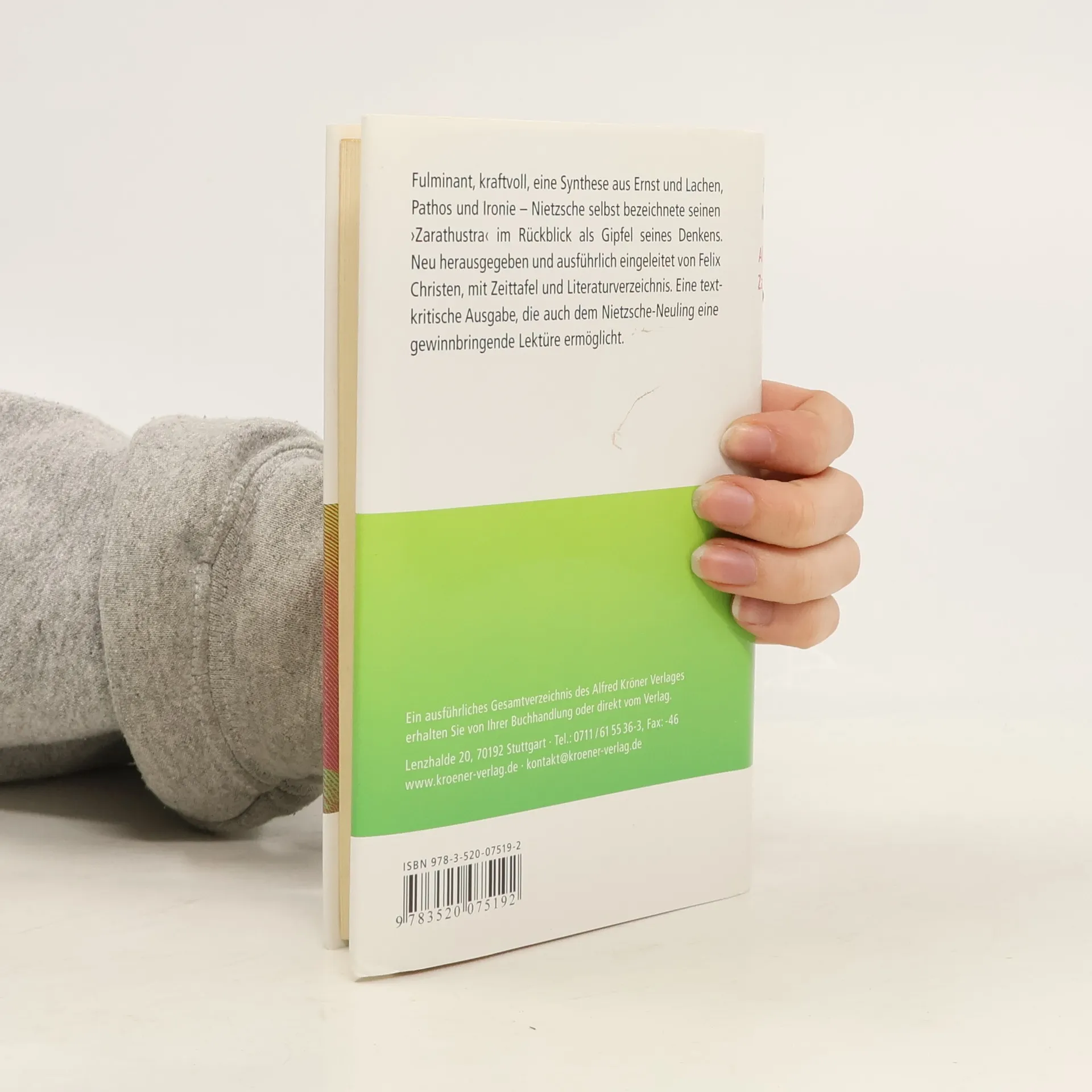 Der »Zarathustra«, von Nietzsche selbst als »Geschenk« begriffen, begründete den Ruf seines Autors als Meister und Erneuerer der deutschen Sprache. Mit seiner bunten literarischen Form, die die Grenzen zwischen Poesie und Prosa, Philosophie und Dichtung überschreitet, wirkte er nachhaltig auf die deutsche Literatur. Die Reden Zarathustras, ihr leichtfüßiger, übermütiger Tonfall, haben bis heute nichts von ihrer Suggestivkraft verloren. Nietzsche im Kröner Verlag hat Tradition: Alfred Kröner gründete den Verlag und ging nach Leipzig, um Nietzsches Werke unter einem Dach zu vereinen. Das Ergebnis war nicht zuletzt unsere Taschenausgabe. Die neue Ausgabe hat Felix Christen nach aktuellen wissenschaftlichen Erkenntnissen eingerichtet, das Druckbild folgt weitgehend Nietzsches eigenen, sehr konkreten Vorstellungen. Die fundierte Einleitung mit weiterführenden Literaturhinweisen sowie eine Zeittafel zu Leben und Werk bieten Orientierung zum Verständnis des Textes. Die erste gedruckte Ausgabe, die die Verbesserungen im »Nachbericht« der Kritischen Gesamtausgabe berücksichtigt.