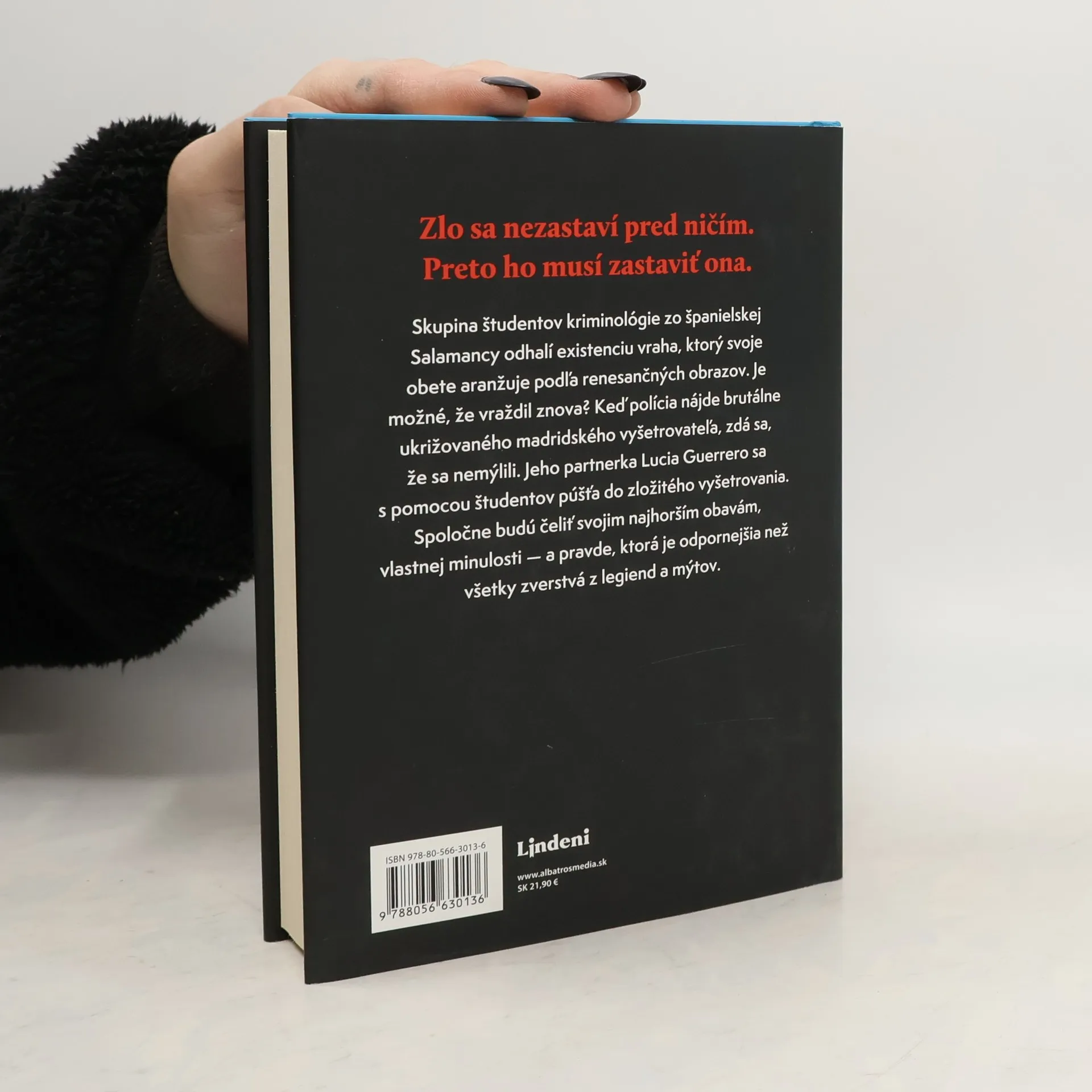 Mrazivý triler obľúbeného Bernarda Miniera! Zlo sa nezastaví pred ničím. Preto ho musí zastaviť ona. Skupina študentov kriminológie odhalí existenciu vraha, ktorý svoje obete aranžuje podľa renesančných obrazov. Je možné, že vraždil znova? Keď polícia nájde brutálne ukrižovaného madridského vyšetrovateľa, zdá sa, že sa nemýlili. Jeho partnerka Lucia Guerrero sa s pomocou študentov púšťa do zložitého vyšetrovania. Spoločne budú čeliť svojim najhorším obavám, vlastnej minulosti – a pravde, ktorá je odpornejšia než všetky zverstvá z legiend a mýtov.
