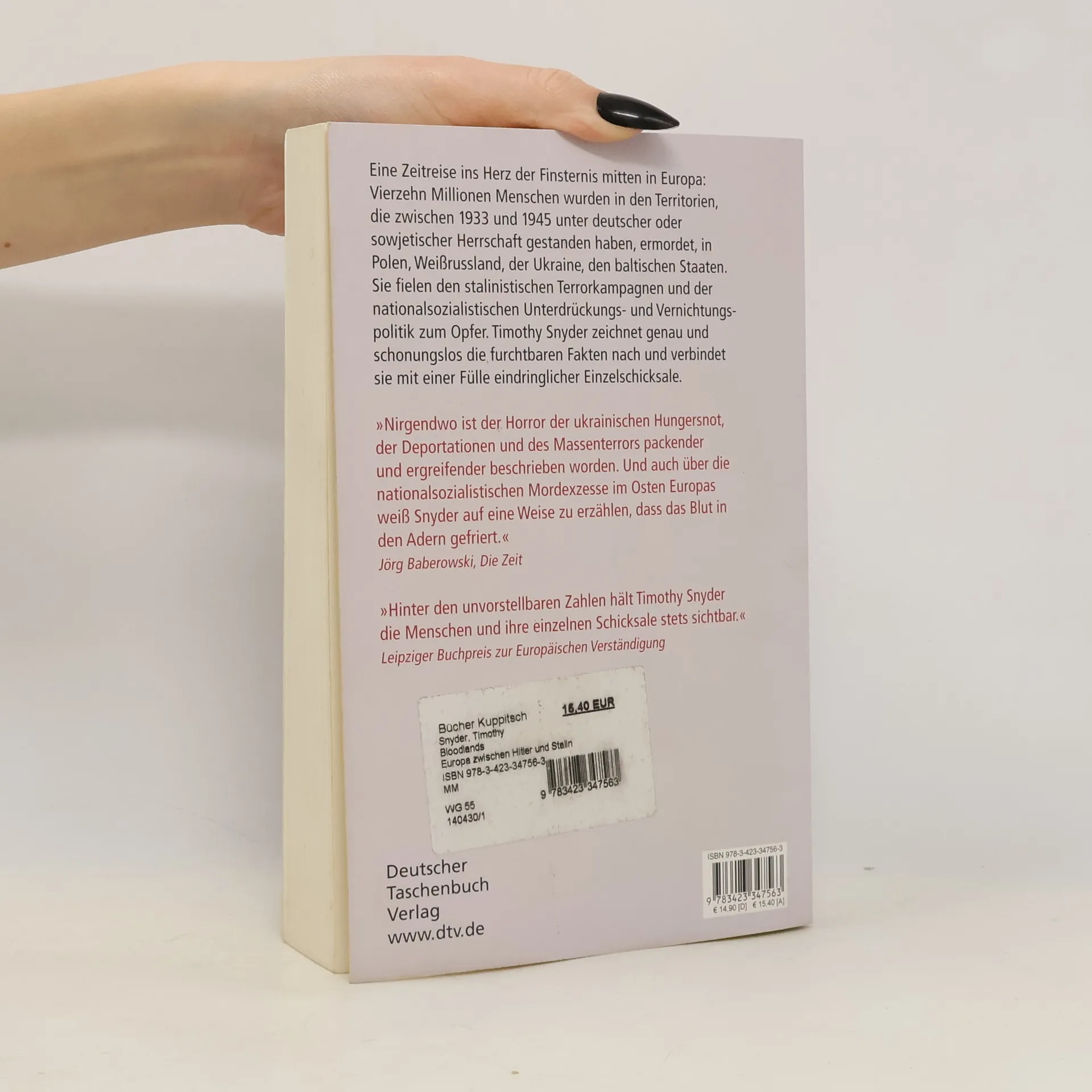 Leipziger Buchpreis zur Europäischen Verständigung 2012 Vierzehn Millionen Menschen wurden in den Bloodlands ermordet, den Territorien, die zwischen 1933 und 1945 unter deutscher oder sowjetischer Herrschaft gestanden haben: Polen, Weißrussland, die Ukraine, die baltischen Staaten. In dieser Region ließen die Sowjets Millionen verhungern, deportieren, erschießen, drangsalierten ab Herbst 1939 die Bevölkerung im russisch besetzten Teil Polens und ermordeten einen großen Teil der Elite. Hier wüteten die deutschen Besatzer im Zweiten Weltkrieg mit Unterdrückung, Zwangsumsiedlungen, dem vorsätzlichen Aushungern der Kriegsgefangenen, hier ermordeten sie sechs Millionen Juden aus ganz Europa. »Nirgendwo ist der Horror der ukrainischen Hungersnot, der Deportationen und des Massenterrors packender und ergreifender beschrieben worden.« Jörg Baberowski. »Eine nuancierte, originelle und eindringliche Analyse der europäischen Killing Fields zwischen Deutschland und Russland.« Timothy Garton Ash. »Bloodlands wird für Jahrzehnte das wichtigste Buch zum Thema sein.« Tony Judt. Für sein Buch wurde Timothy Snyder mit dem Hannah-Arendt-Preis für politisches Denken 2013 ausgezeichnet.