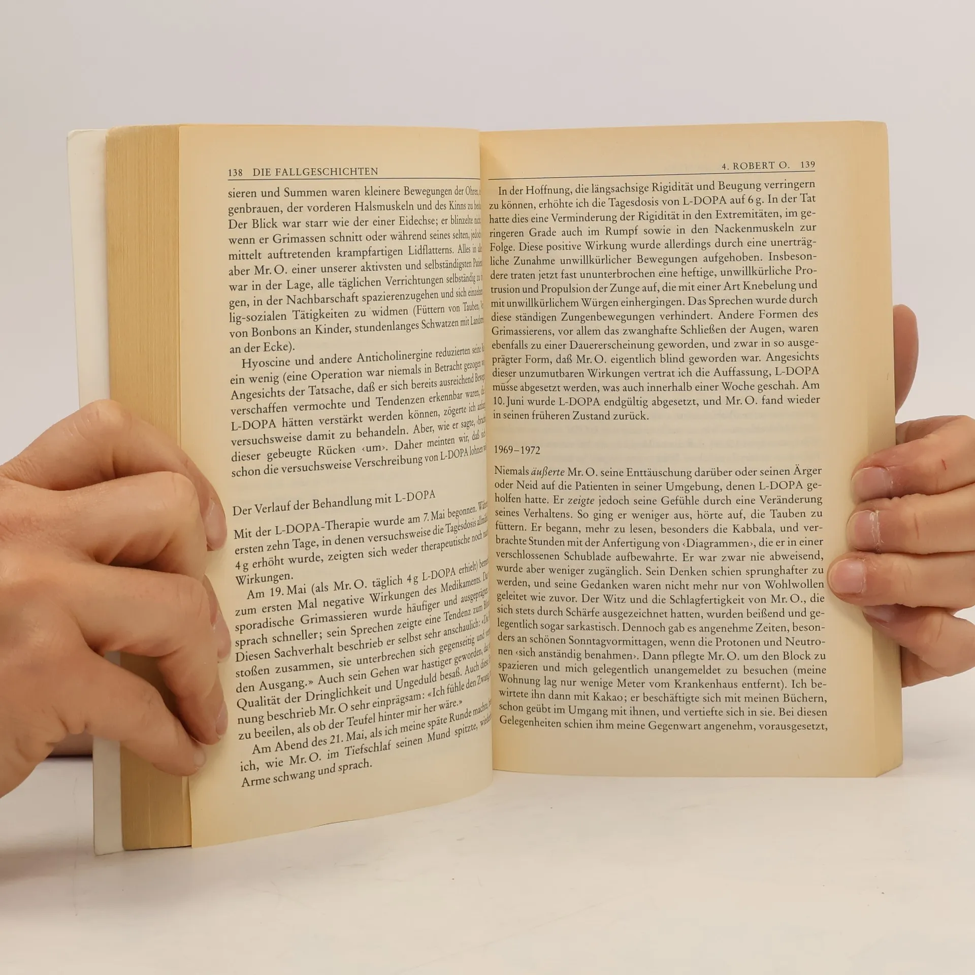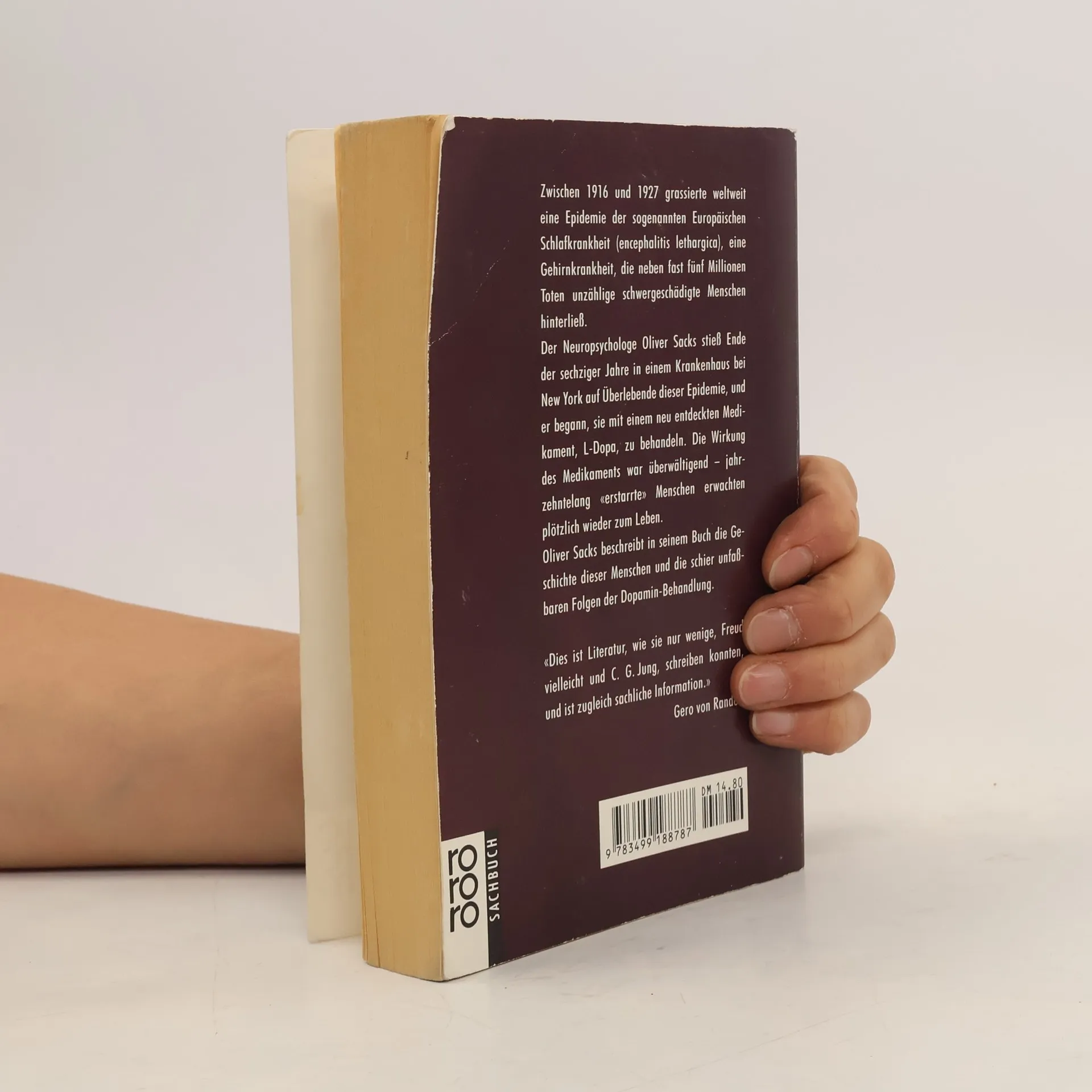 Zwischen 1916 und 1927 grassierte weltweit eine Epidemie der sogenannten Europäischen Schlafkrankheit, eine Gehirnkrankheit, die neben fast fünf Millionen Toten unzählige schwergeschädigte Menschen hinterließ. Der Neuropsychologe Oliver Sacks stieß Ende der sechziger Jahre in einem Krankenhaus bei New York auf Überlebende dieser Epidemie, und er begann, sie mit einem neu entdeckten Medikament, L-Dopa, zu behandeln. Die Wirkung des Medikaments war überwältigend - jahrzehntelang „erstarrte“ Menschen erwachten plötzlich wieder zum Leben. Oliver Sacks beschreibt in seinem Buch die Geschichte dieser Menschen und die schier unfassbaren Folgen der Dopamin-Behandlung.