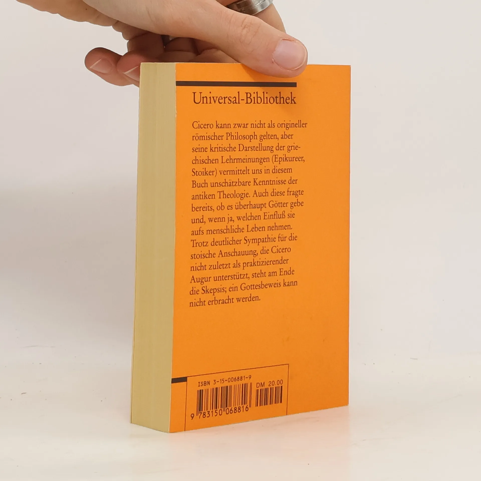 Cicero vermittelt in seiner kritischen Darstellung der griechischen Lehrmeinungen (Epikureer, Stoiker) unschätzbare Kenntnisse der antiken Theologie. Gibt es überhaupt Götter? Wenn ja, welchen Einfluss haben sie auf das menschliche Leben? Trotz deutlicher Sympathie für die stoische Anschauung, die Cicero nicht zuletzt als praktizierender Augur unterstützt, steht am Ende die Skepsis; ein Gottesbeweis kann nicht erbracht werden. Sprachen: Deutsch, Latein