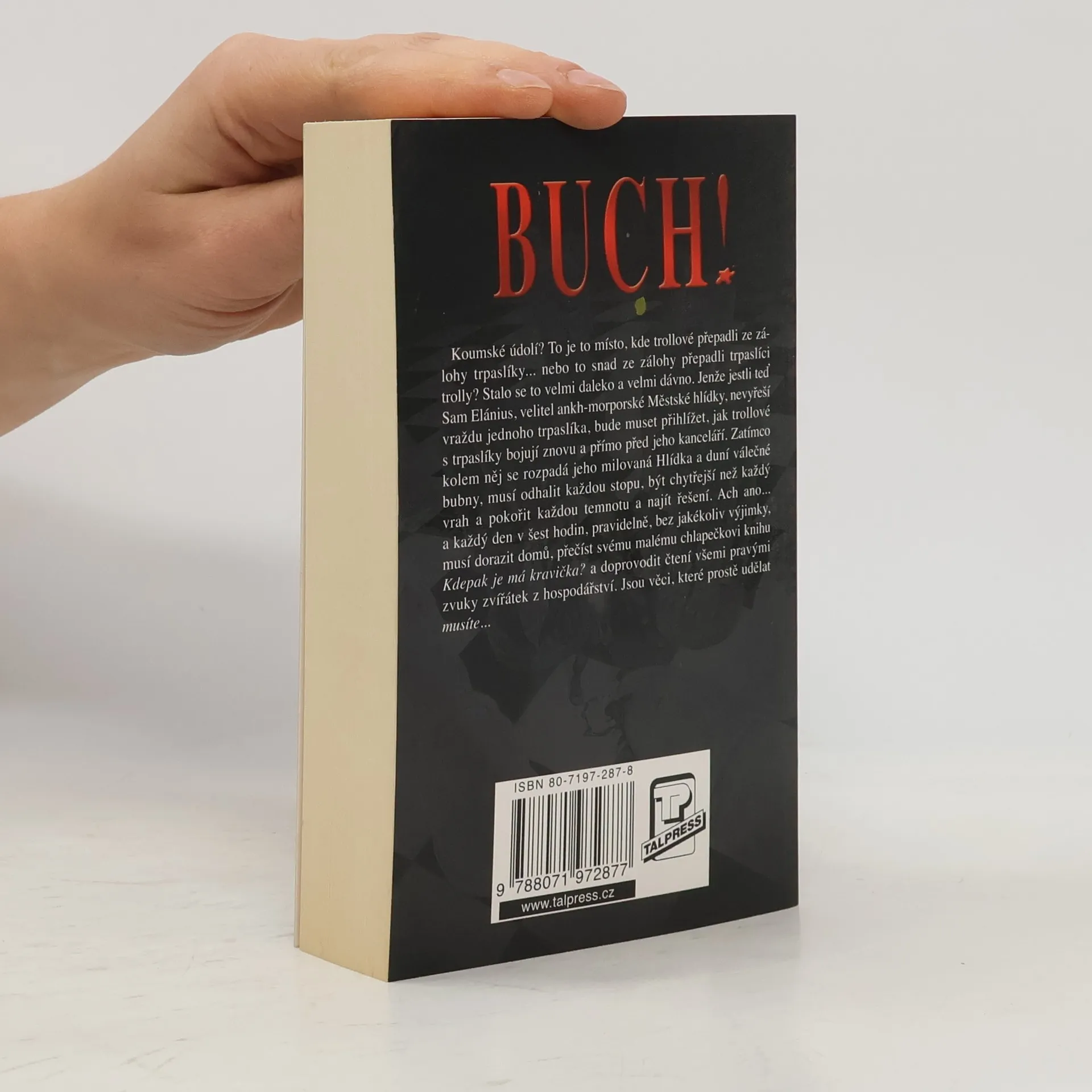 Koumské údolí? To je to místo, kde trollové přepadli ze zálohy trpaslíky... nebo to snad ze zálohy přepadli trpaslíci trolly? Stalo se to velmi daleko a velmi dávno. Jenže jestli teď Sam Elánius, velitel ankh-morporské městské hlídky, nevyřeší vraždu jednoho trpaslíka, bude muset přihlížet, jak trollové s trpaslíky bojují znovu a přímo před jeho kanceláří. Zatímco kolem něj se rozpadá jeho milovaná Hlídka a duní válečné bubny, musí odhalit každou stopu, být chytřejší než každý vrah a pokořit každou temnotu a najít řešení. Ach ano... a každý den v šest hodin, pravidelně, bez jakékoliv výjimky, musí dorazit domů, přečíst svému malému chlapečkovi knihu Kampak se poděla má kravička? A doprovodit čtení všemi pravými zvuky zvířátek z hospodářství. Jsou věci, které prostě udělat musíte.