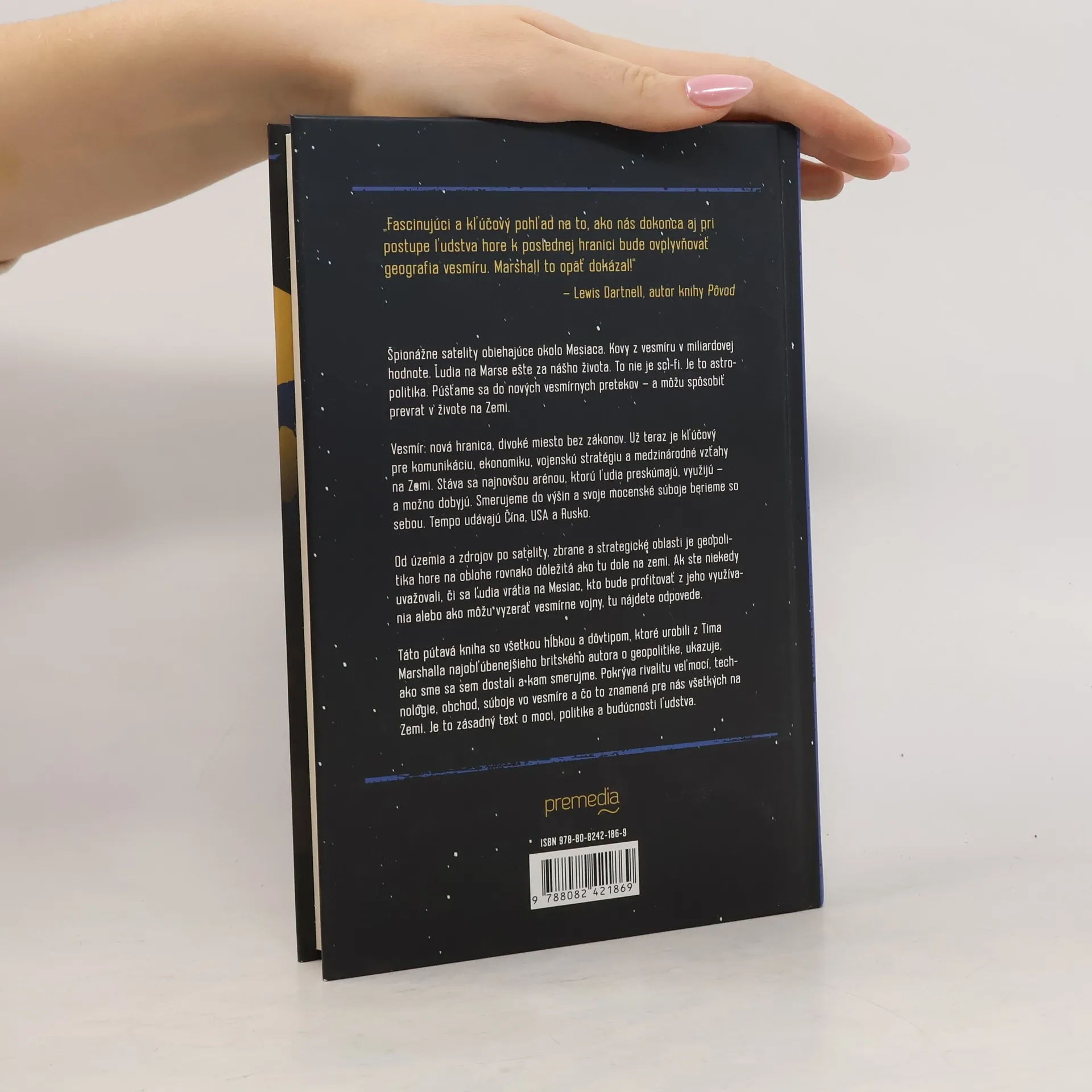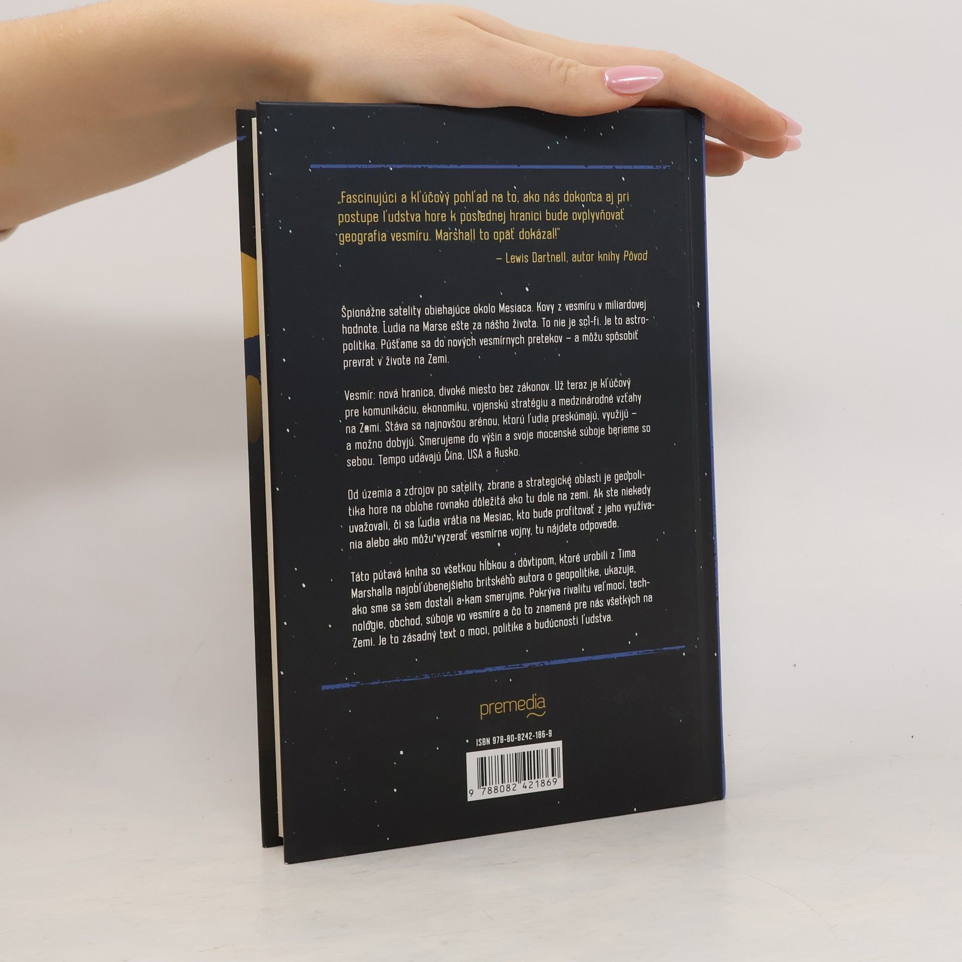Vesmír: nová hranica, divoké miesto bez zákonov. Už teraz je kľúčový pre komunikáciu, ekonomiku, vojenskú stratégiu a medzinárodné vzťahy na Zemi. Stáva sa najnovšou arénou, ktorú ľudia preskúmajú, využijú – a možno dobyjú. Smerujeme do výšin a svoje mocenské súboje berieme so sebou. Tempo udávajú Čína, USA a Rusko. Špionážne satelity obiehajúce okolo Mesiaca, kovy z vesmíru v miliardovej hodnote, ľudia na Marse ešte za nášho života. To nie je sci-fi, je to astropolitika. Púšťame sa do nových vesmírnych pretekov – a môžu spôsobiť prevrat v živote na Zemi. Od územia a zdrojov po satelity, zbrane a strategické oblasti je geopolitika hore na oblohe rovnako dôležitá ako tu dole na zemi. Ak ste niekedy uvažovali, či sa ľudia vrátia na Mesiac, kto bude profitovať z jeho využívania alebo ako môžu vyzerať vesmírne vojny, tu nájdete odpovede. Táto pútavá kniha so všetkou hĺbkou a dôvtipom, ktoré urobili z Tima Marshalla najobľúbenejšieho britského autora o geopolitike, ukazuje, ako sme sa sem dostali a kam smerujme. Pokrýva rivalitu veľmocí, technológie, obchod, súboje vo vesmíre a čo to znamená pre nás všetkých na Zemi. Je to zásadný text o moci, politike a budúcnosti ľudstva.
