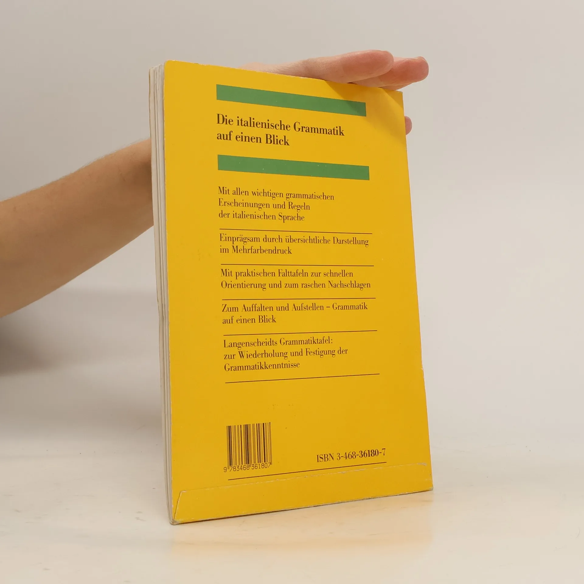 Mit allen wichtigen grammatischen Erscheinungen und Regeln der italienischen SpracheEinprägsam durch übersichtliche Darstellung im MehrfarbendruckMit praktischen Falttafeln zur schnellen Orientierung und zum raschen NachschlagenZum Auffalten und Aufstellen - Grammatik auf einen Blick