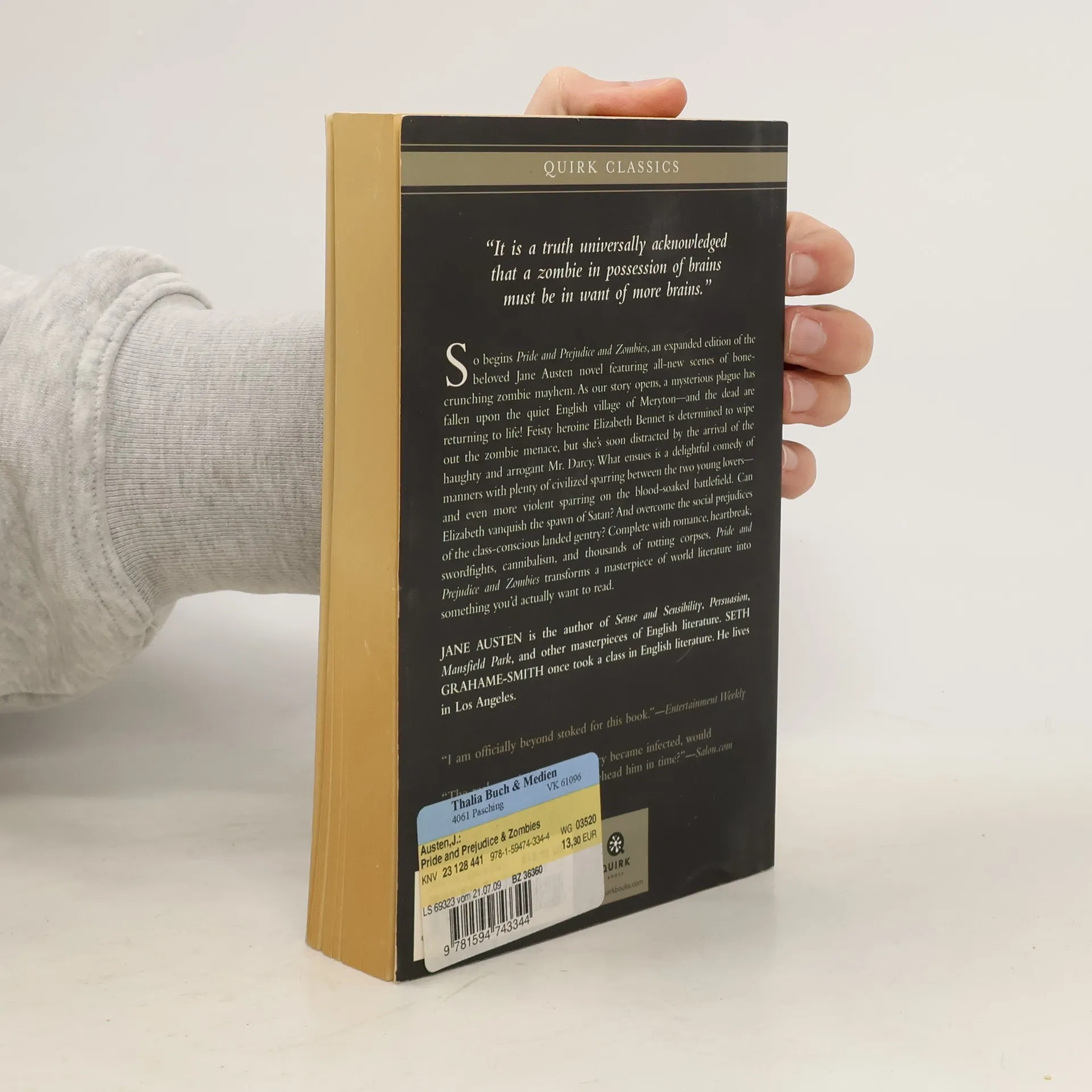 “It is a truth universally acknowledged that a zombie in possession of brains must be in want of more brains.”So begins Pride and Prejudice and Zombies, an expanded edition of the beloved Jane Austen novel featuring all-new scenes of bone-crunching zombie mayhem. As our story opens, a mysterious plague has fallen upon the quiet English village of Meryton—and the dead are returning to life! Feisty heroine Elizabeth Bennet is determined to wipe out the zombie menace, but she’s soon distracted by the arrival of the haughty and arrogant Mr. Darcy. What ensues is a delightful comedy of manners with plenty of civilized sparring between the two young lovers—and even more violent sparring on the blood-soaked battlefield. Can Elizabeth vanquish the spawn of Satan? And overcome the social prejudices of the class-conscious landed gentry? Complete with romance, heartbreak, swordfights, cannibalism, and thousands of rotting corpses,