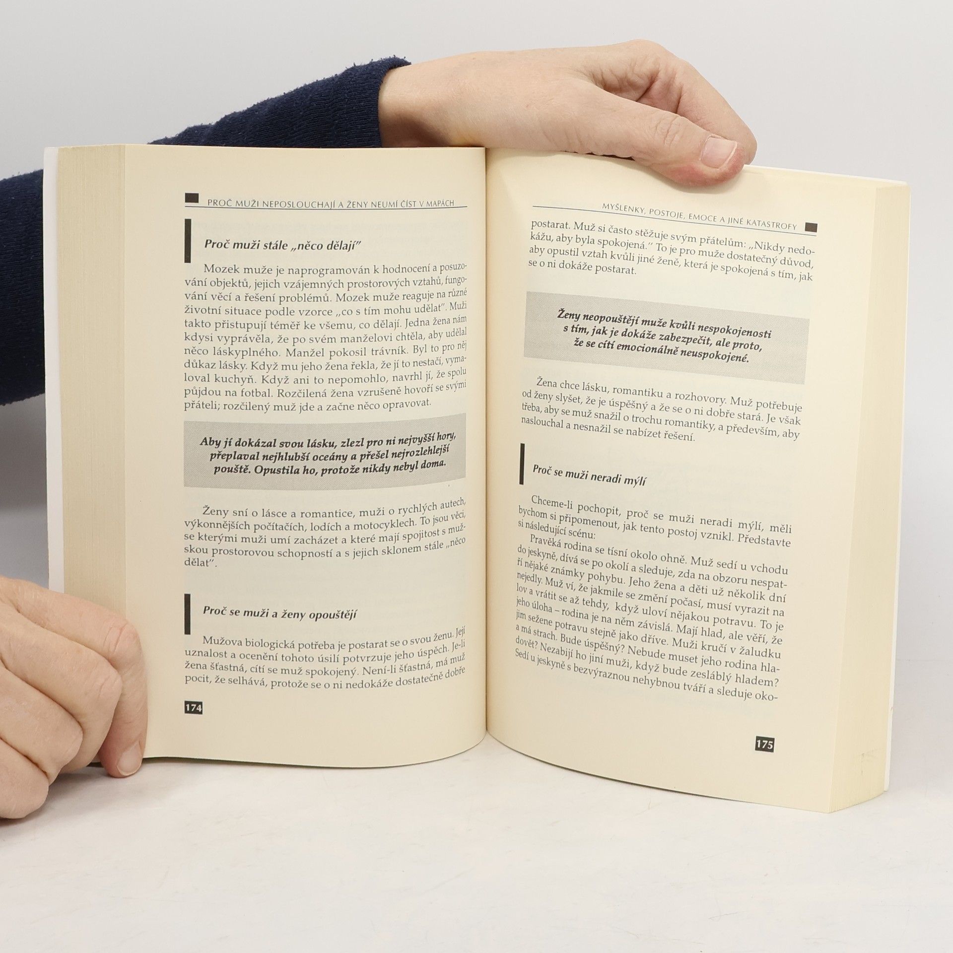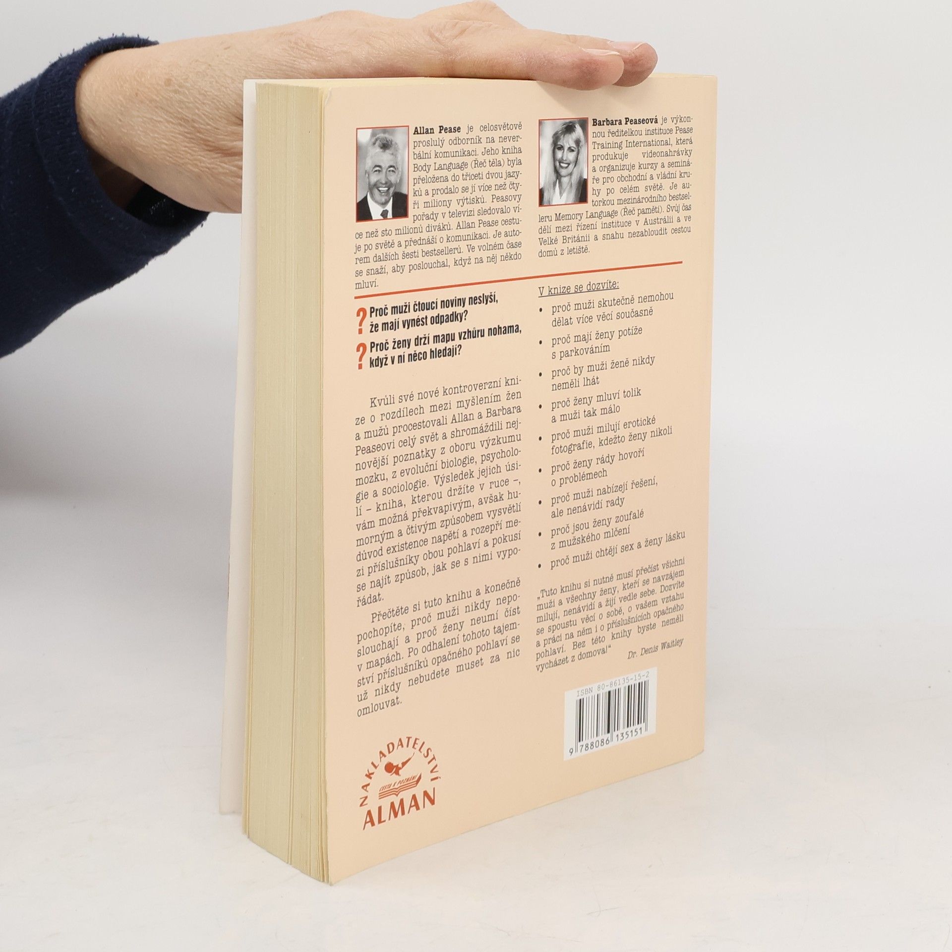 Kvůli své kontroverzní knize o rozdílech mezi myšlením žen a mužů procestovali Allan a Barbara Peaseovi celý svět a shromáždili nejnovější poznatky z oboru výzkumu mozku, z evoluční biologie, psychologie a sociologie. Výsledek jejich úsilí, vám možná překvapivým, avšak humorným a čtivým způsobem vysvětlí důvod existence napětí rozepří mezi příslušníky obou pohlaví a pokusí se najít způsob, jak se s nimi vypořádat. Přečtěte si tuto knihu a konečně pochopíte, proč muži nikdy neposlouchají a proč ženy neumí číst v mapách. Po odhalení tohoto tajemství příslušníků opačného pohlaví se už nikdy nebudete muset za nic omlouvat.