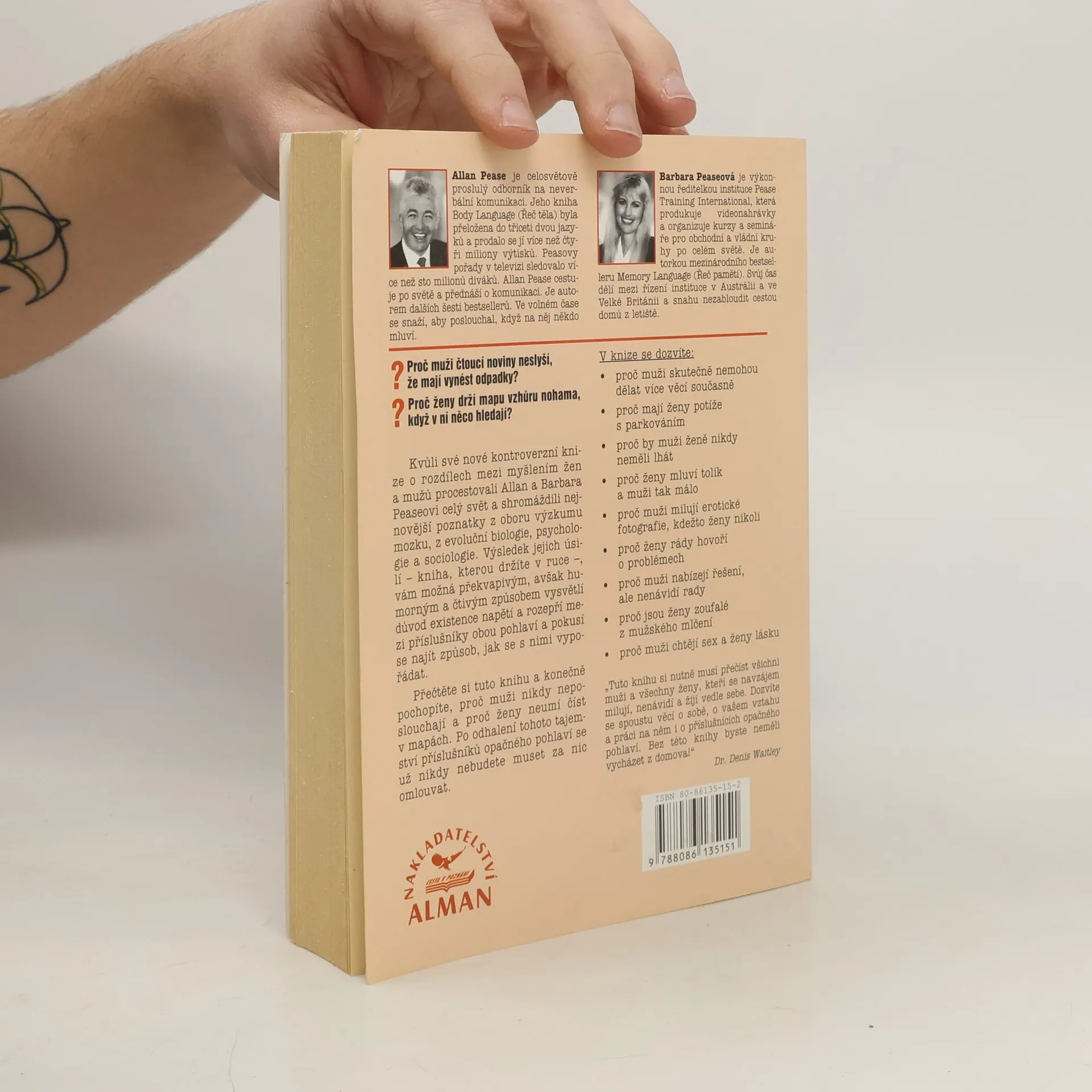 Kvůli své kontroverzní knize o rozdílech mezi myšlením žen a mužů procestovali Allan a Barbara Peaseovi celý svět a shromáždili nejnovější poznatky z oboru výzkumu mozku, z evoluční biologie, psychologie a sociologie. Výsledek jejich úsilí, vám možná překvapivým, avšak humorným a čtivým způsobem vysvětlí důvod existence napětí rozepří mezi příslušníky obou pohlaví a pokusí se najít způsob, jak se s nimi vypořádat. Přečtěte si tuto knihu a konečně pochopíte, proč muži nikdy neposlouchají a proč ženy neumí číst v mapách. Po odhalení tohoto tajemství příslušníků opačného pohlaví se už nikdy nebudete muset za nic omlouvat.