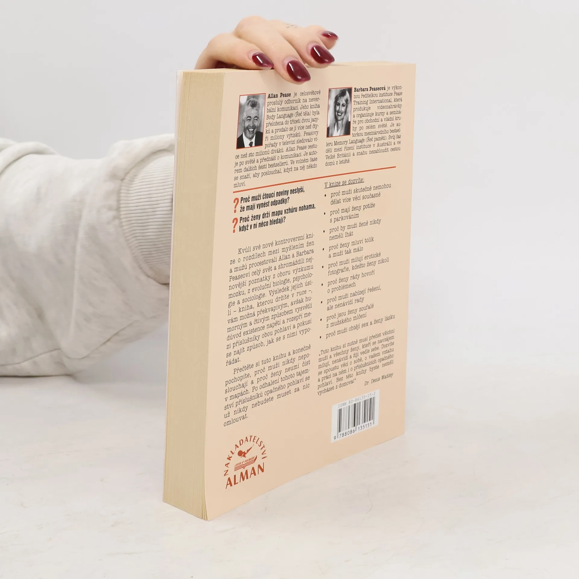 Kvůli své kontroverzní knize o rozdílech mezi myšlením žen a mužů procestovali Allan a Barbara Peaseovi celý svět a shromáždili nejnovější poznatky z oboru výzkumu mozku, z evoluční biologie, psychologie a sociologie. Výsledek jejich úsilí, vám možná překvapivým, avšak humorným a čtivým způsobem vysvětlí důvod existence napětí rozepří mezi příslušníky obou pohlaví a pokusí se najít způsob, jak se s nimi vypořádat. Přečtěte si tuto knihu a konečně pochopíte, proč muži nikdy neposlouchají a proč ženy neumí číst v mapách. Po odhalení tohoto tajemství příslušníků opačného pohlaví se už nikdy nebudete muset za nic omlouvat.